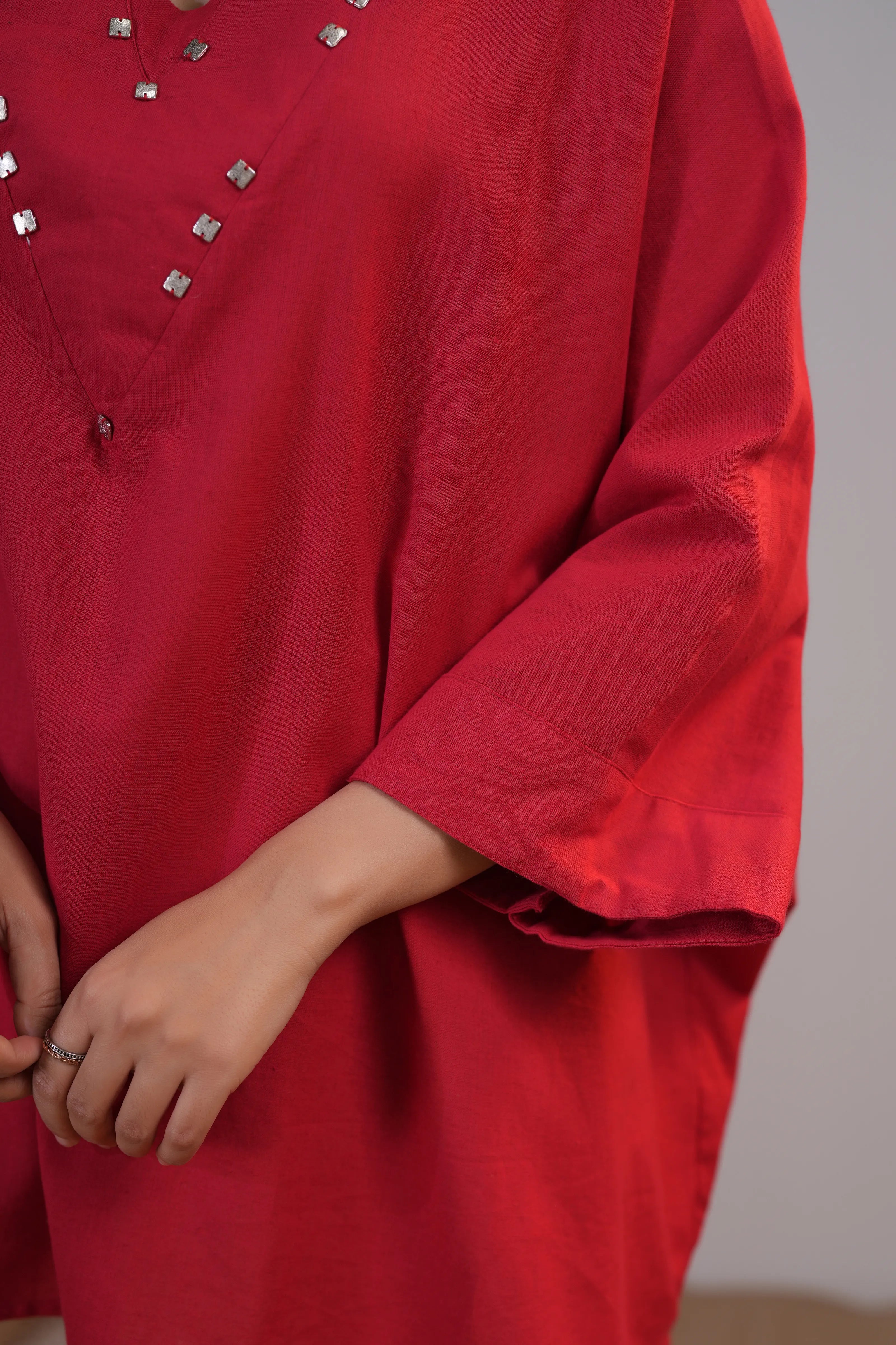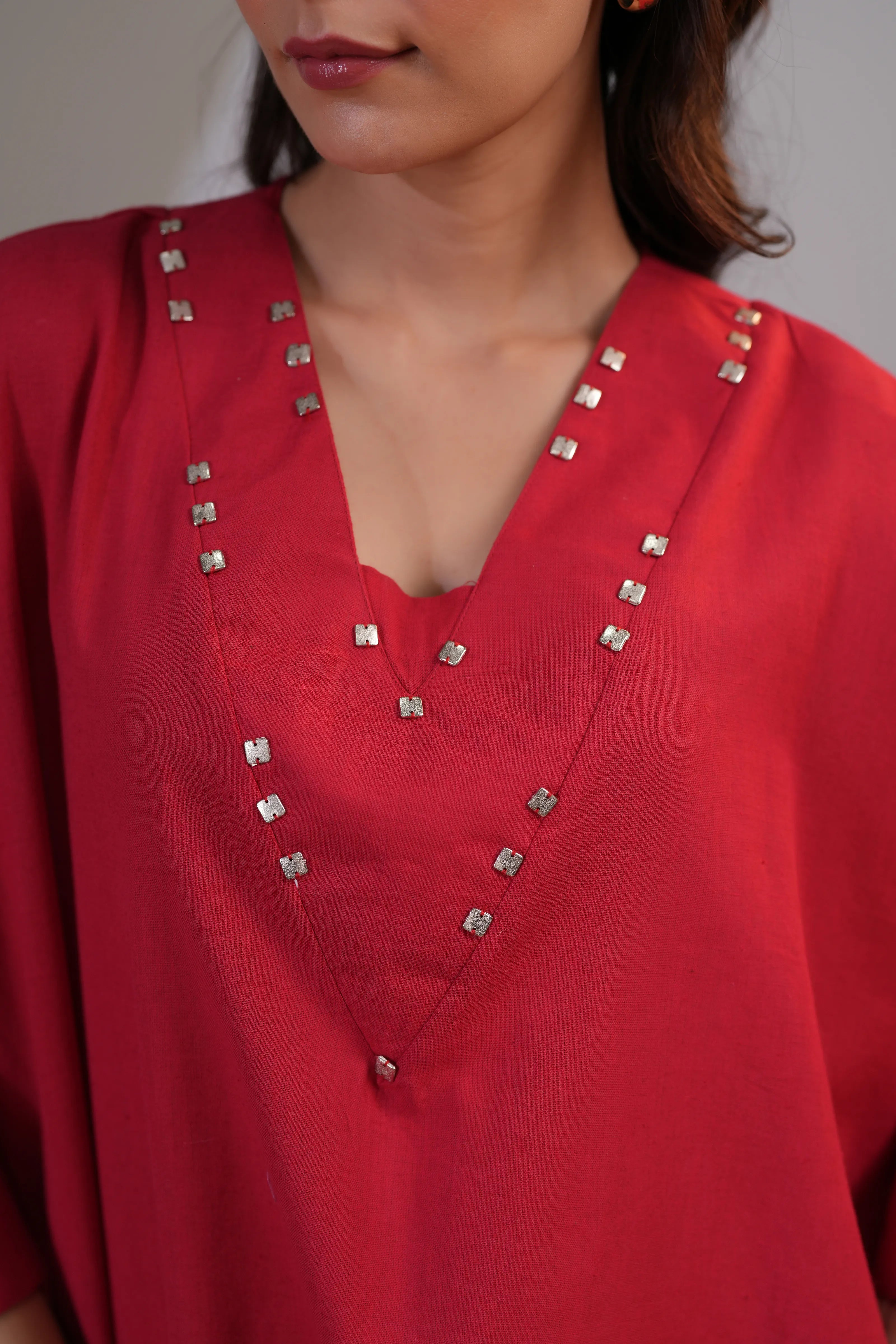 Elevate your everyday style with Rosé Whisper, a striking co-ord set that blends artisanal charm with modern ease. This red and cream two-piece features a relaxed-fit top in soft cotton flex, detailed with subtle silver embellishments along the flattering V-neckline for that hint of festive shine.