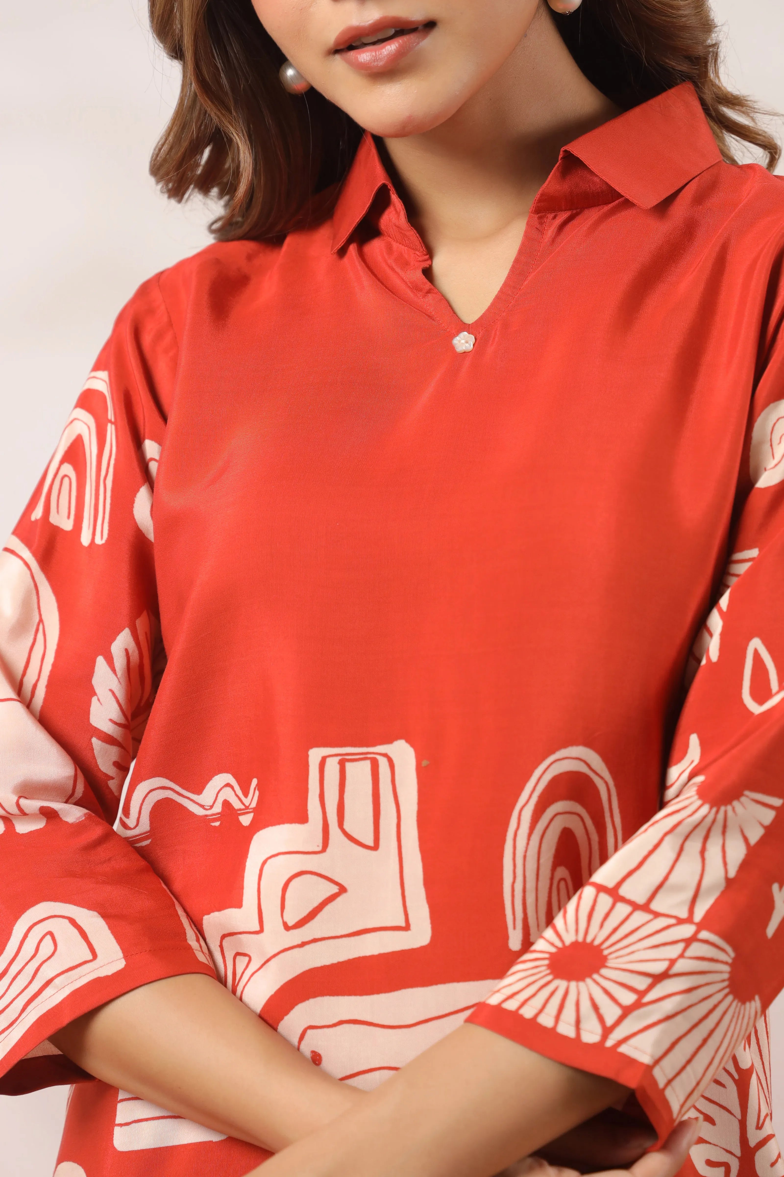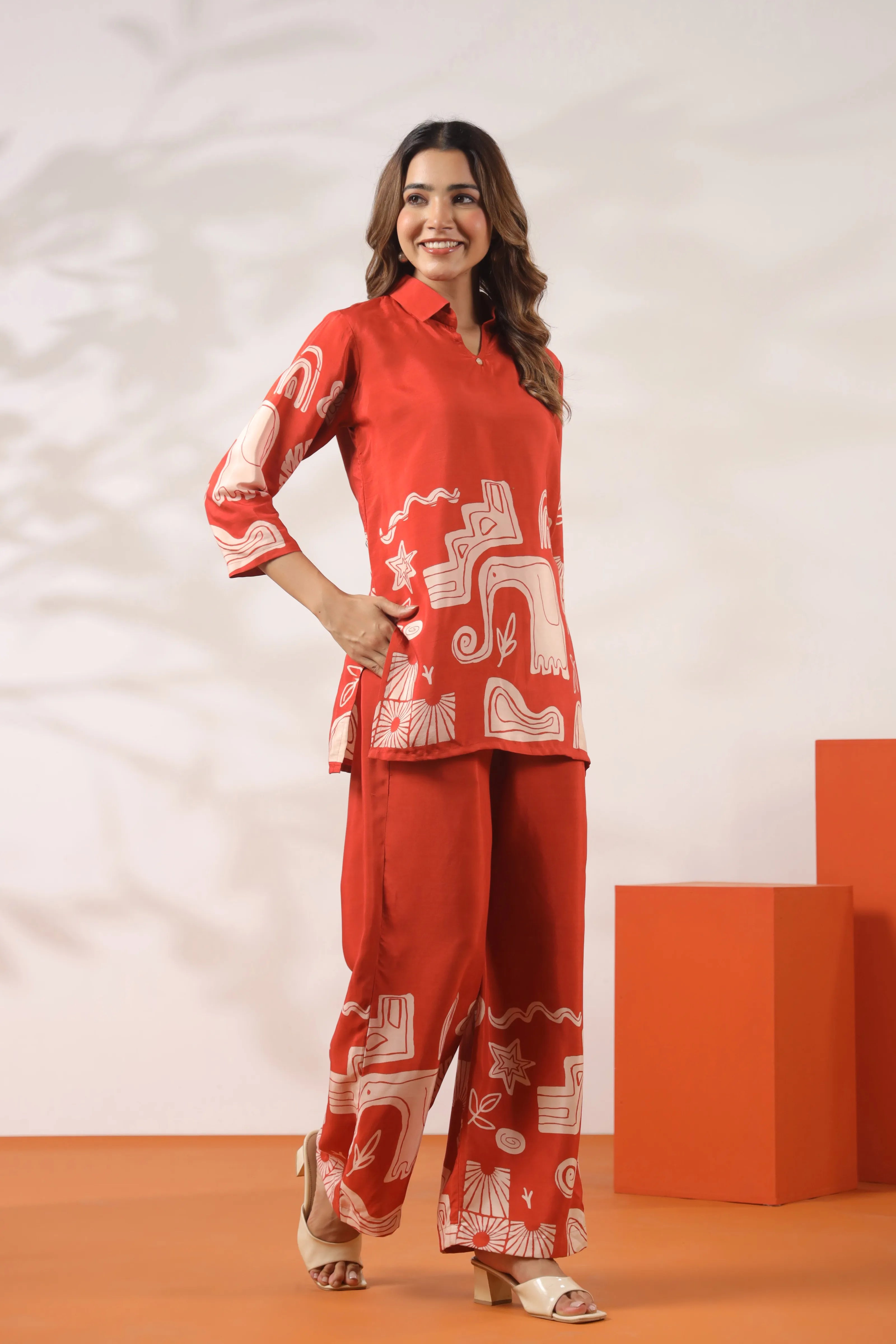 Step into a story of culture and creativity with Tribal Echo—a statement-making co-ord set crafted in luxe Russian silk. The warm rust base is contrasted with bold cream tribal-inspired motifs including elephants, rainbow arcs, leaves, and abstract geometrics. The top features a clean V-neck with a shirt collar and relaxed 3/4th sleeves, while the wide-leg pants offer comfort with an elasticated waistband and practical side pockets.