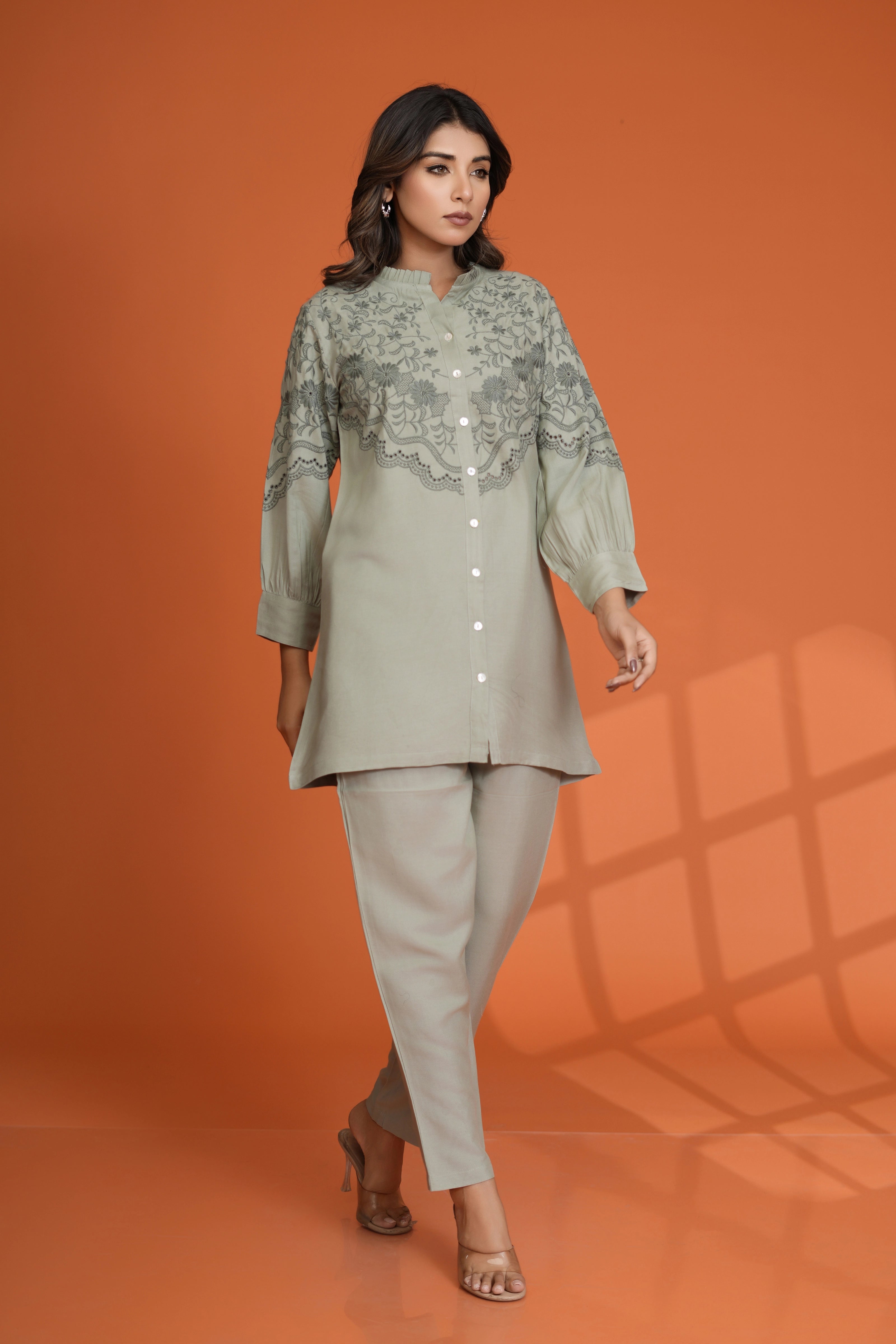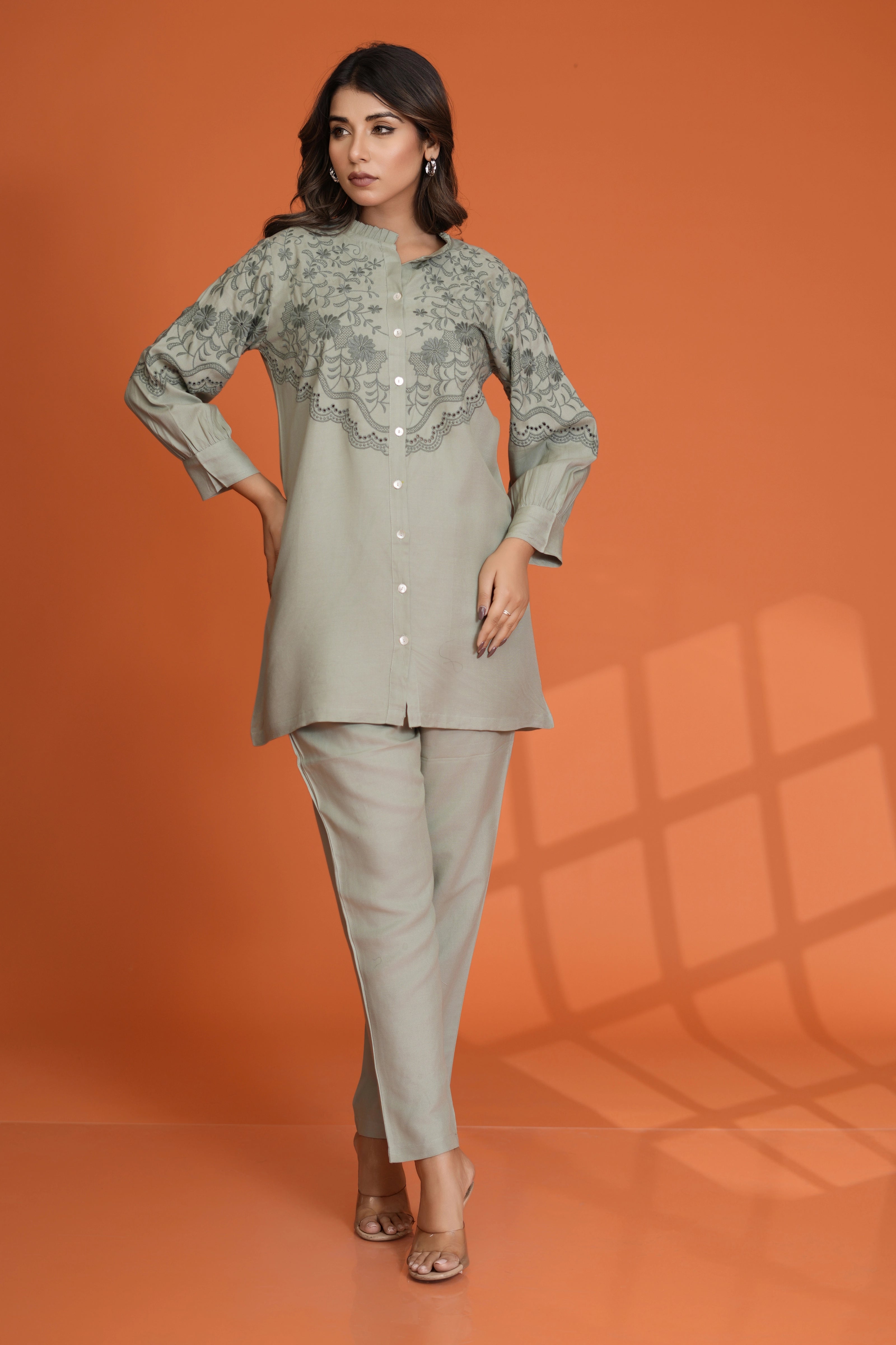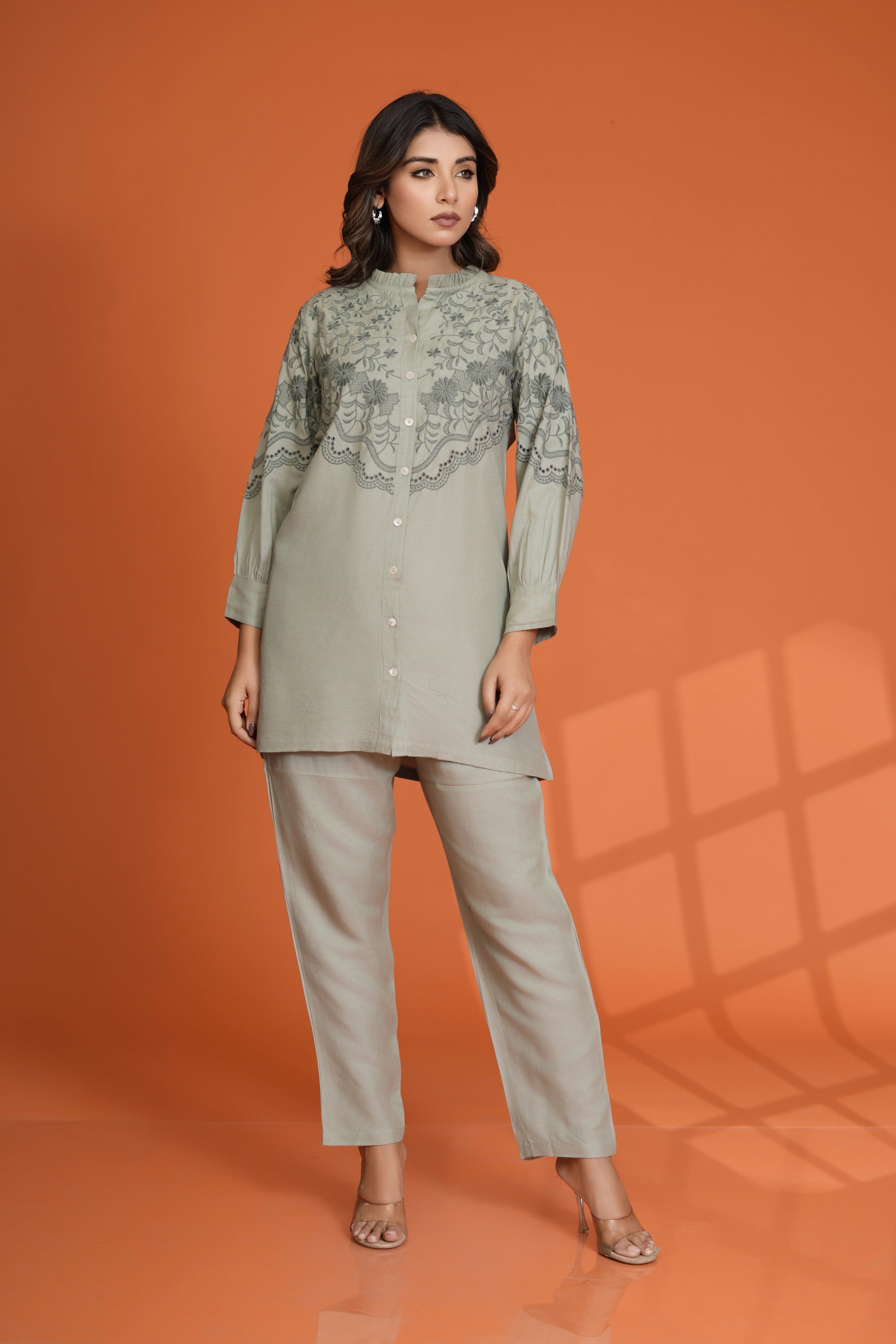 Timeless Elegance: Sage Green Embroidered Button-Front Co-Ord Set in Viscose Rayon