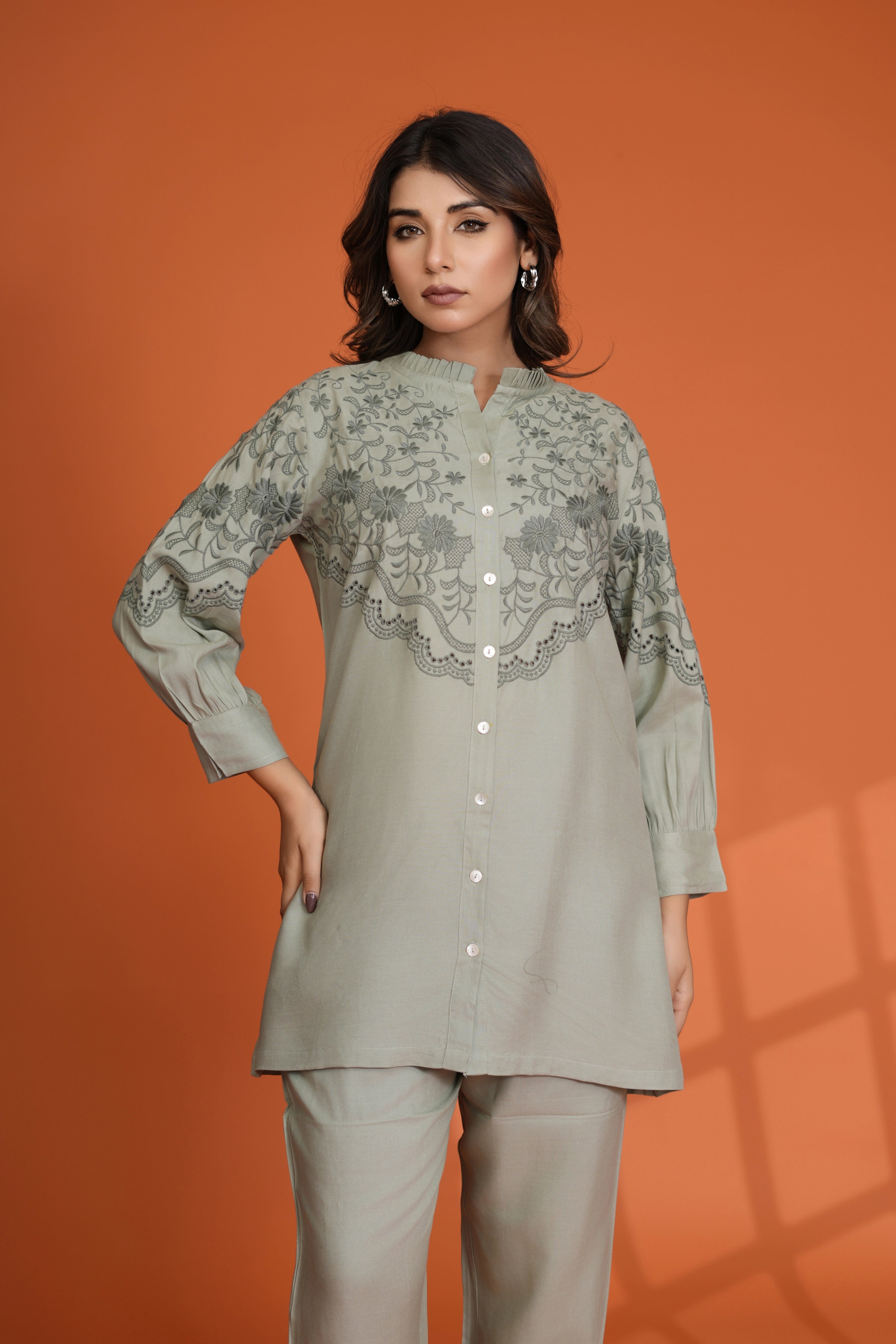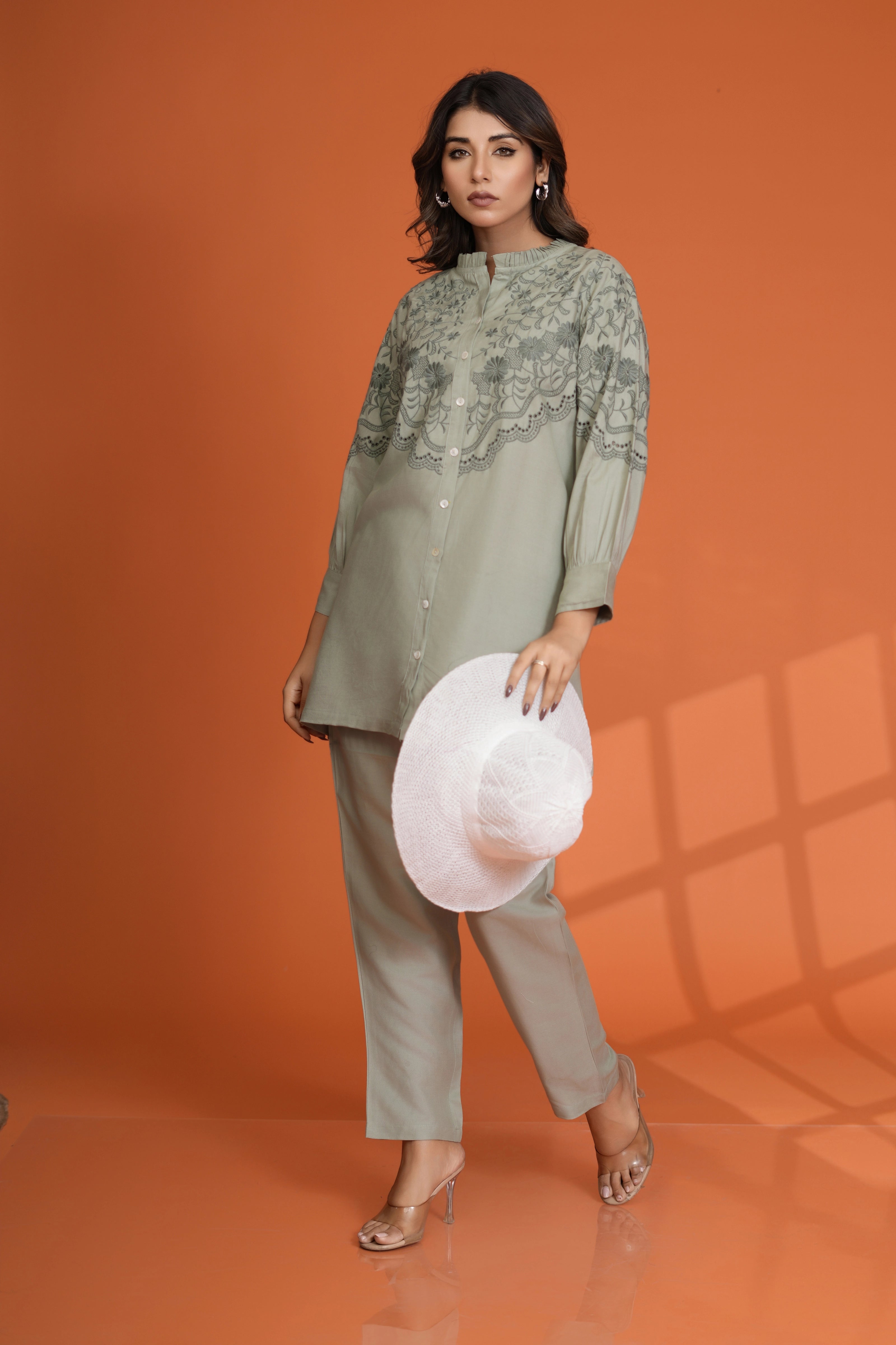 Effortlessly stylish and endlessly versatile, this Sage Green Embroidered Co-Ord Set is your go-to outfit for refined comfort and modern sophistication.