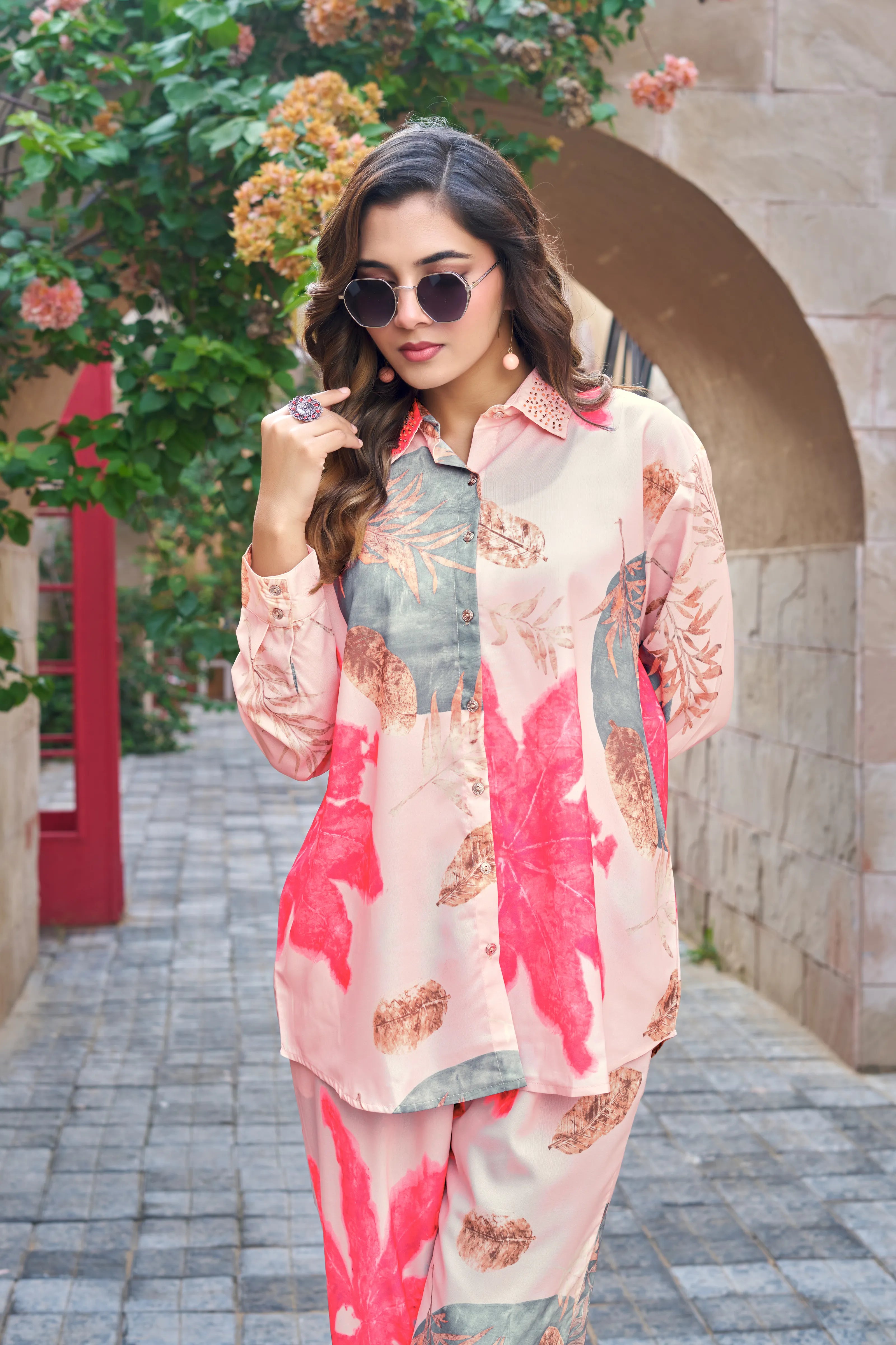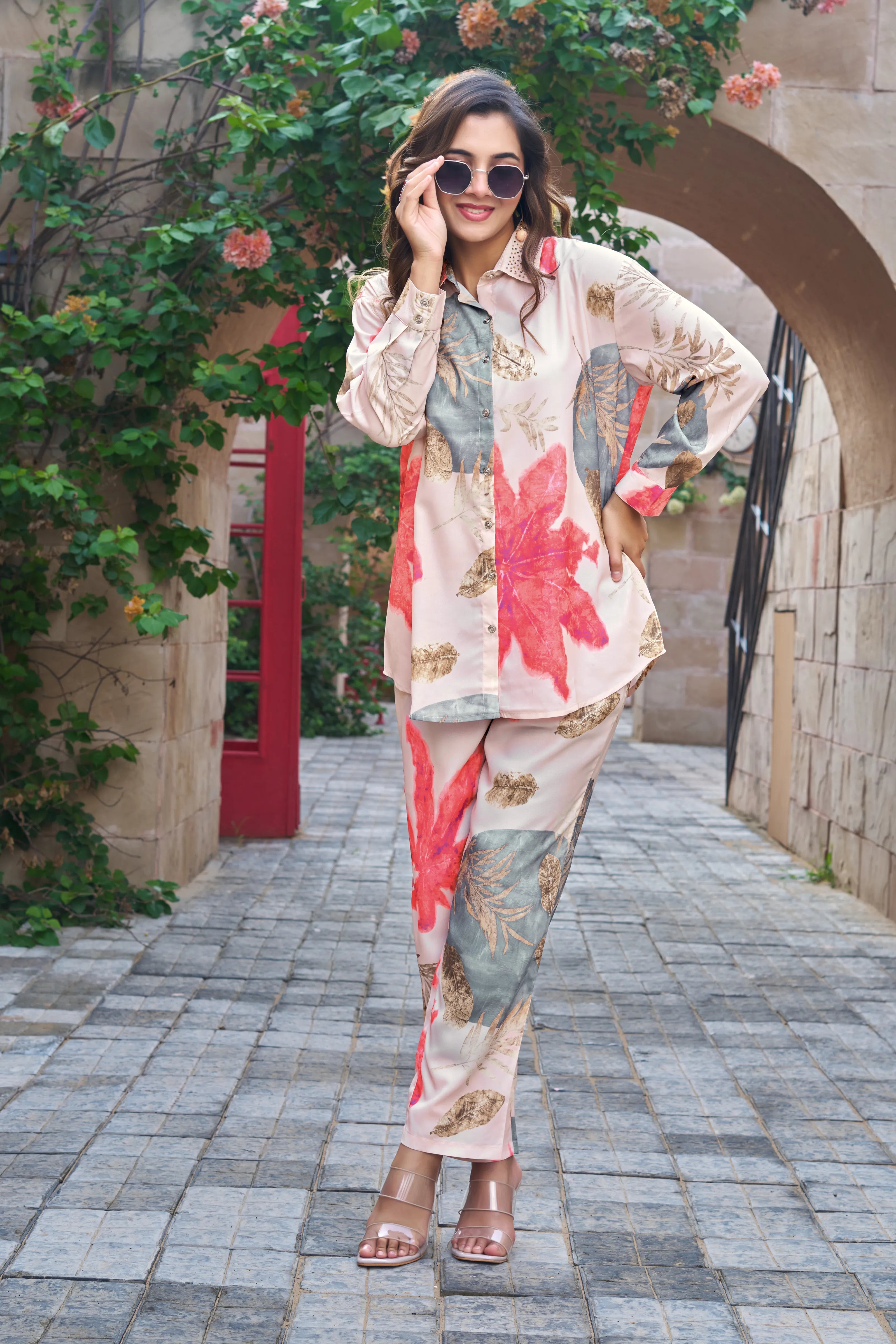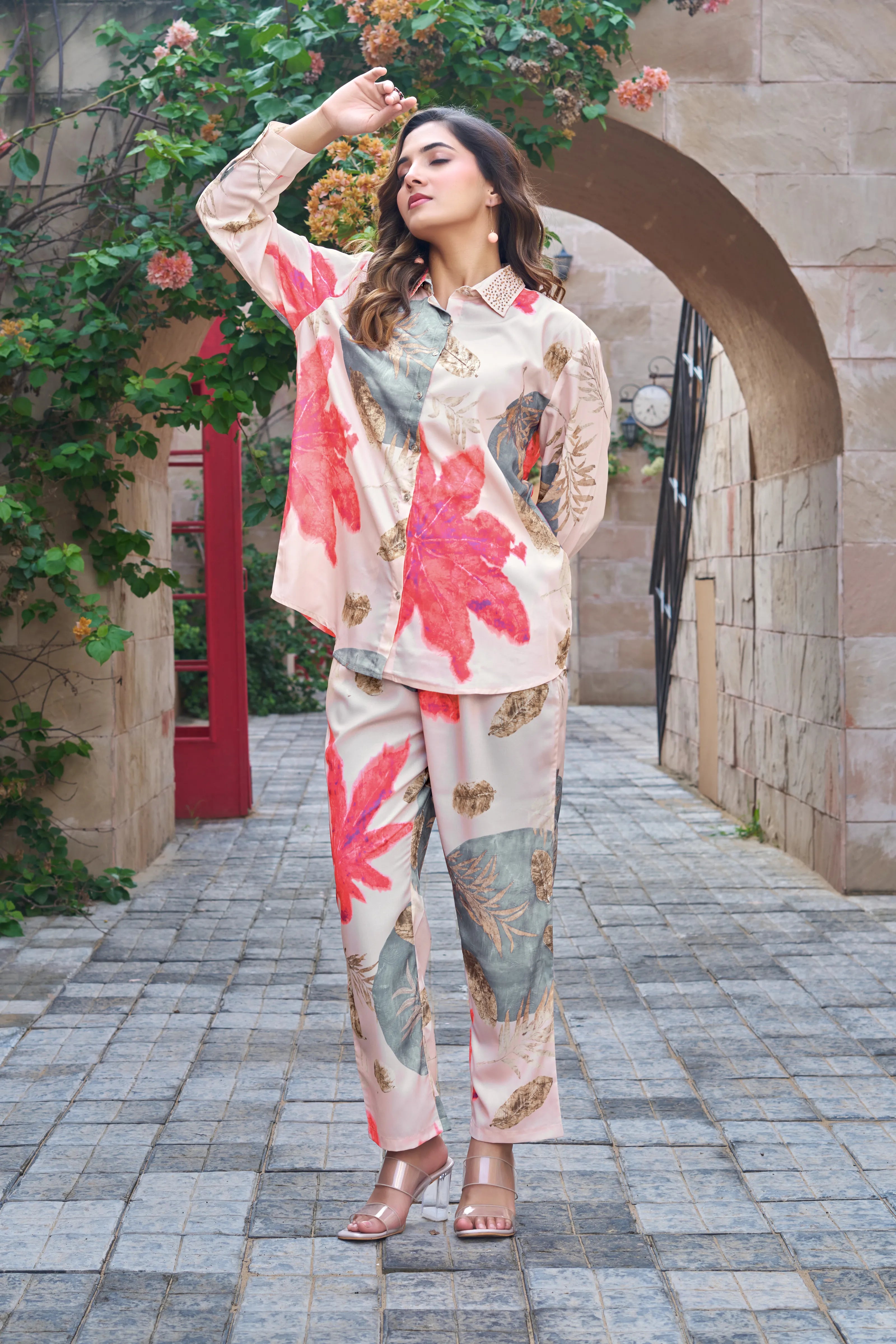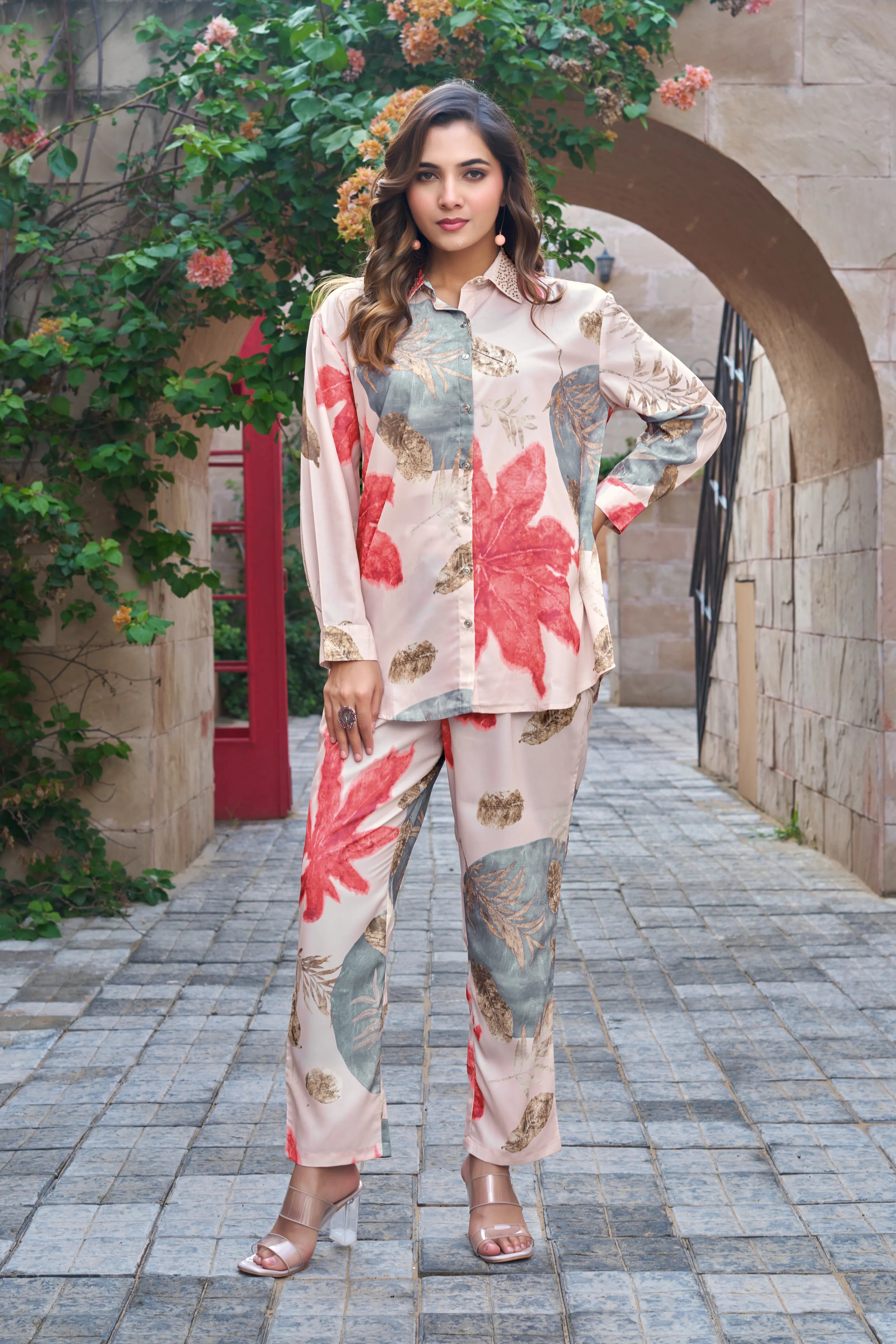 Tropical Bloom: Sand & Coral Print Embellished Co-ord Set