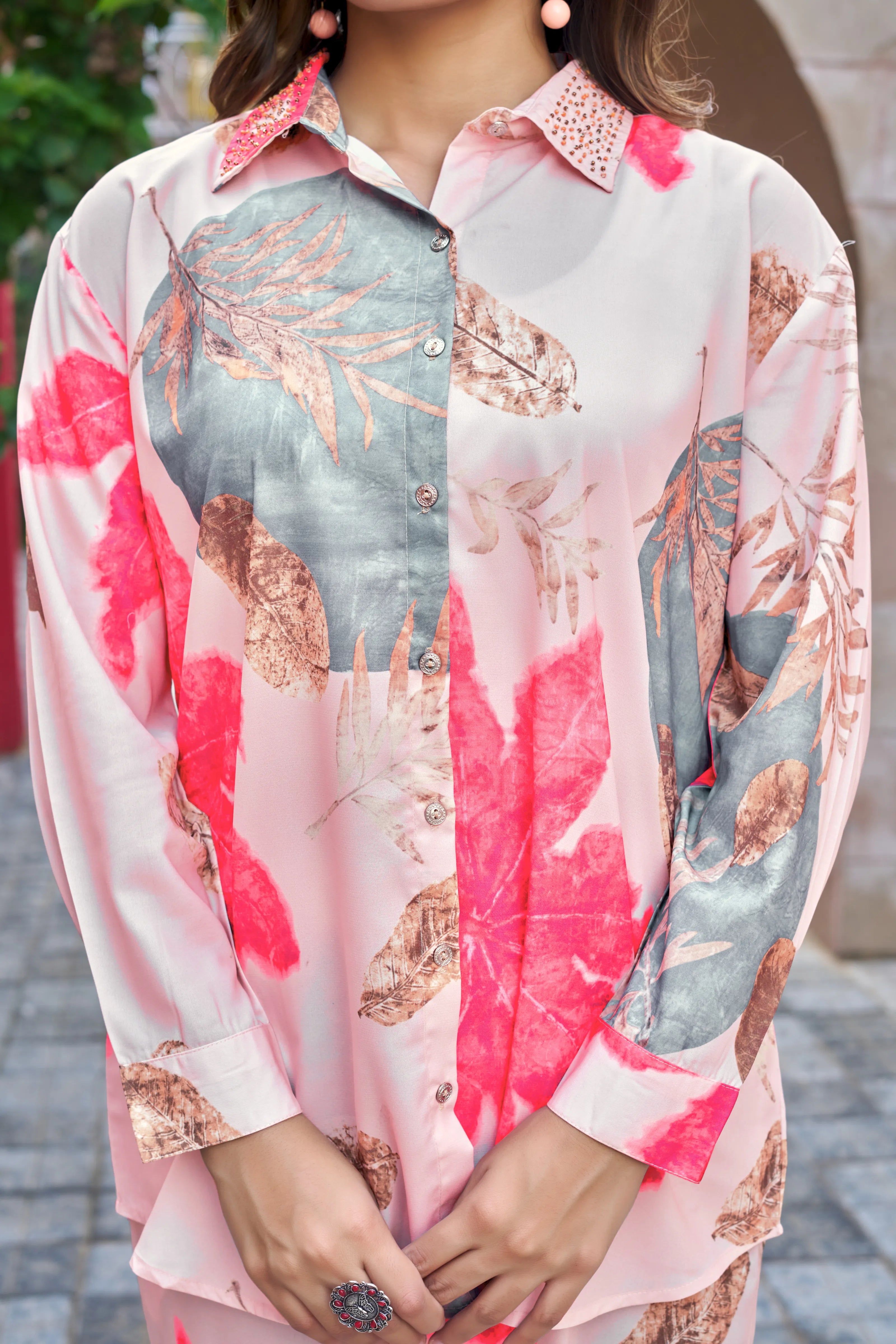 Let your wardrobe bloom with Tropical Bloom, a vibrant co-ord set designed to echo exotic vacation vibes. Crafted from breathable poly muslin, this sand-toned ensemble is enhanced with bold grey and pink tropical leaf prints and delicate embellishments. The shirt-style top features a collared neckline, full sleeves with cuff-button detail, and elegant silver metal buttons. Paired with straight-fit elasticated pants with a handy side pocket, this set is your go-to for an elevated yet relaxed look.