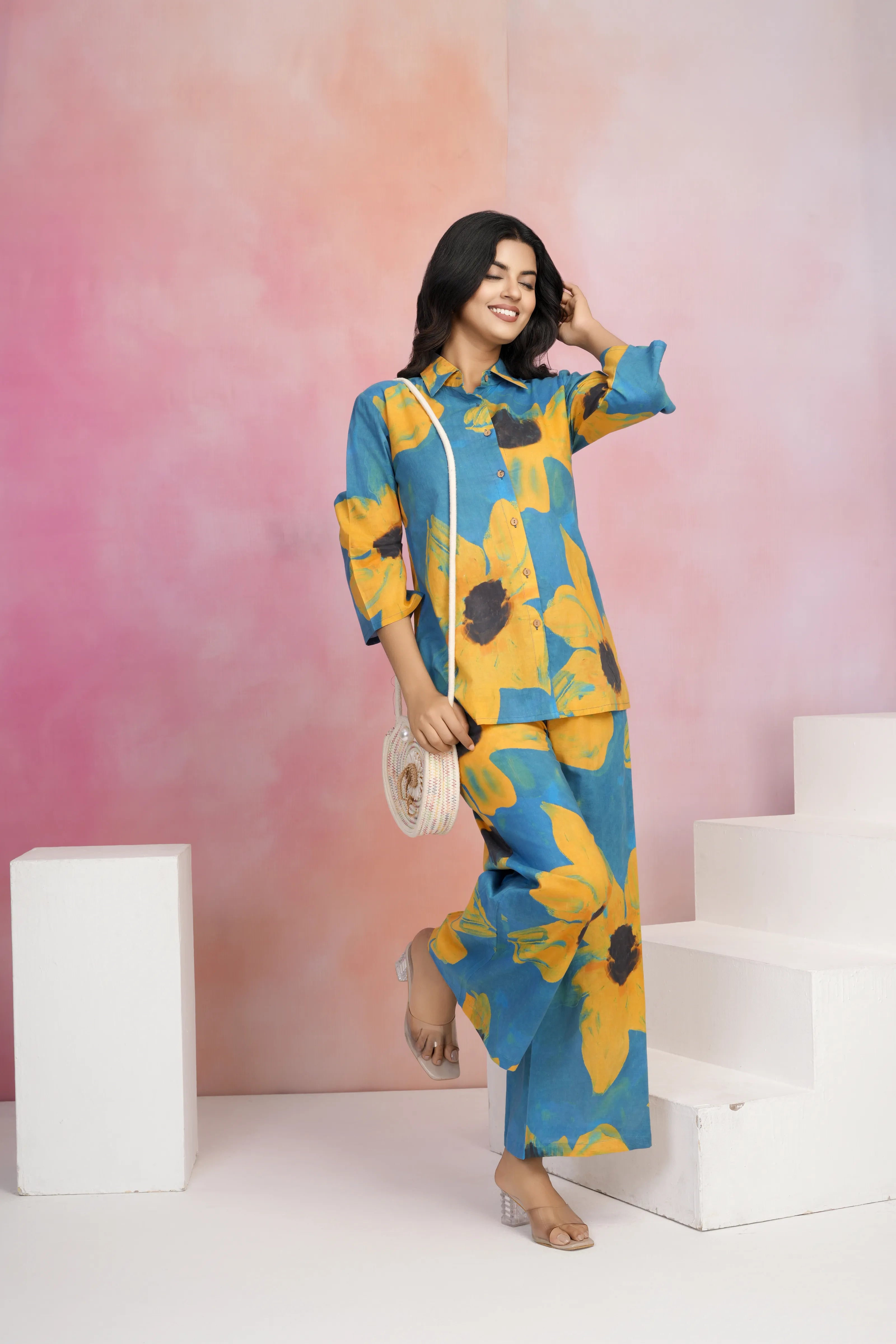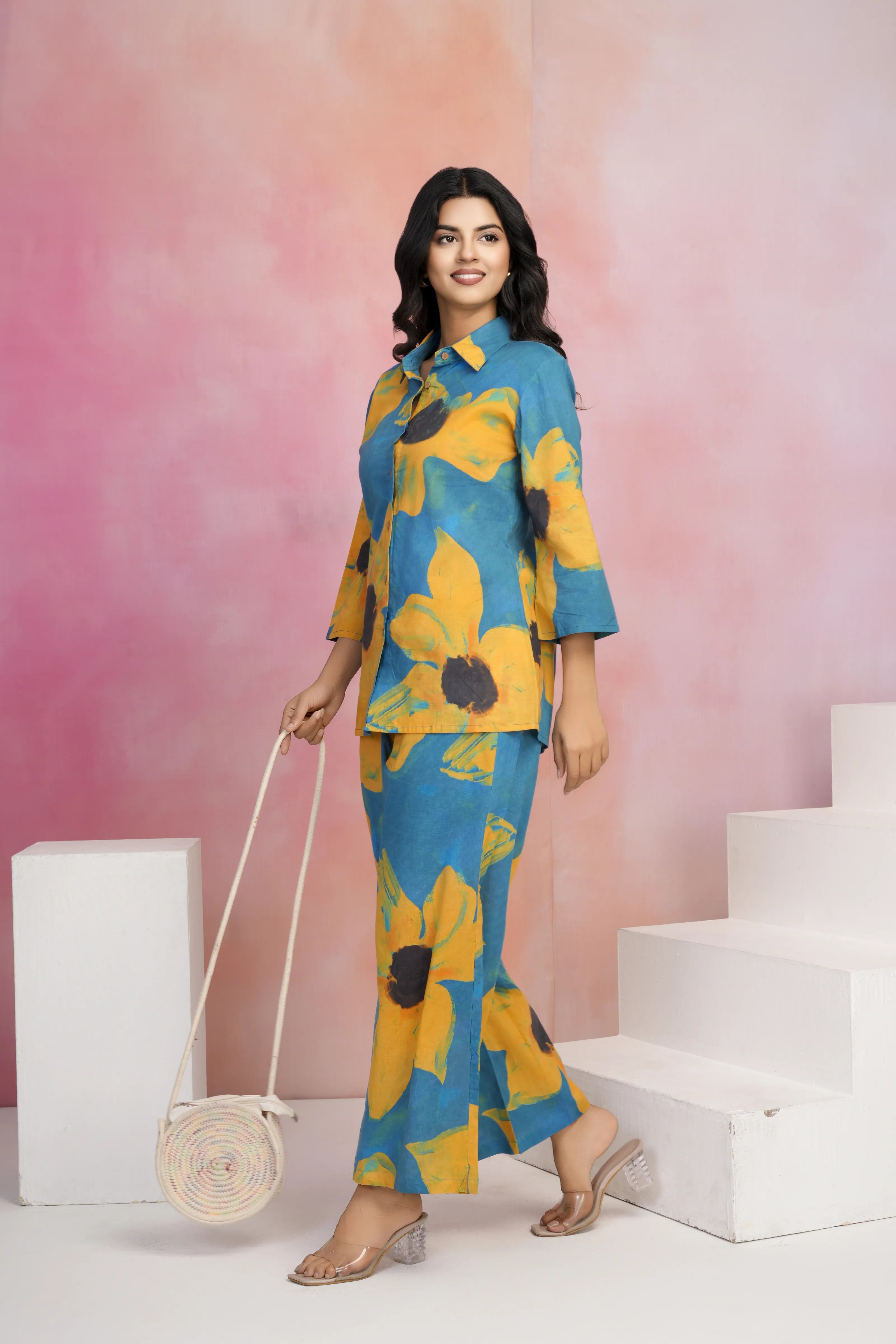 Sunset Bloom: Sunflower Motif Shirt Collar Co-ord Set in Cotton Cambric
