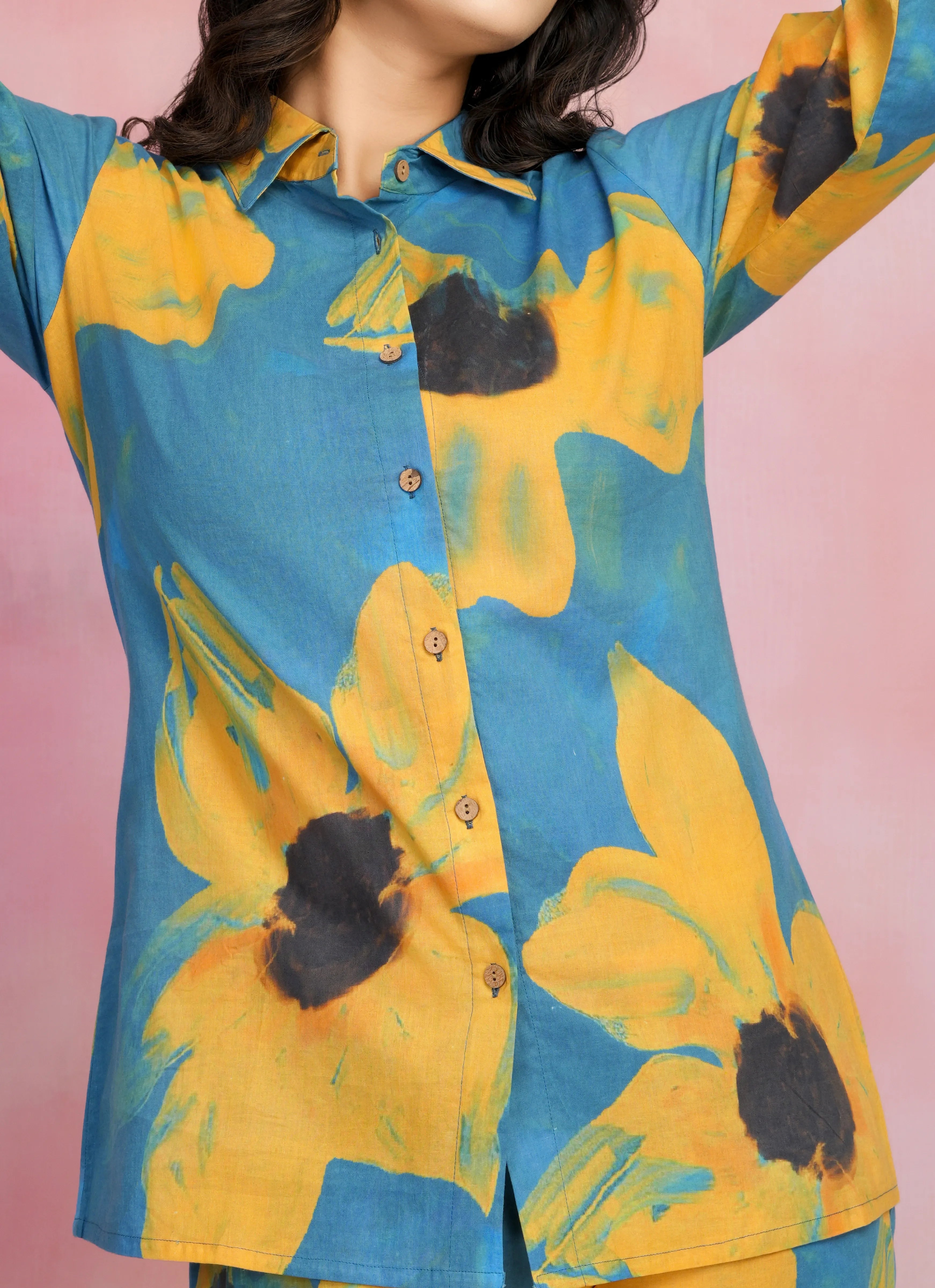 Sunflower Motif Shirt Collar Co-ord Set in Cotton Cambric