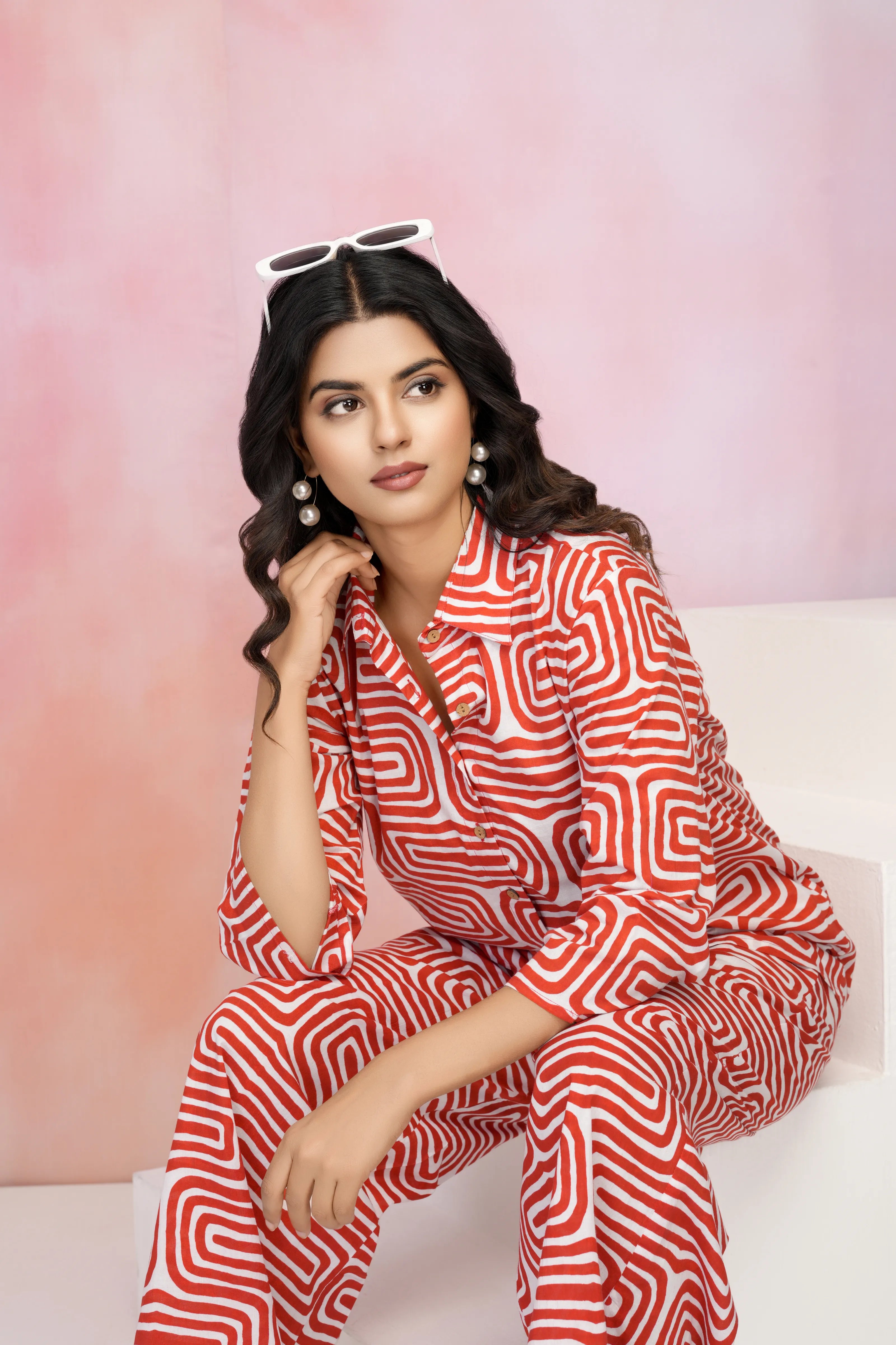 Make a style statement with this breezy swirl-printed co-ord set, tailored in soft and breathable cotton cambric. Featuring a relaxed-fit wooden button front top with 3/4th sleeves, and matching wide-leg pants, this set is a perfect blend of comfort and effortless flair.