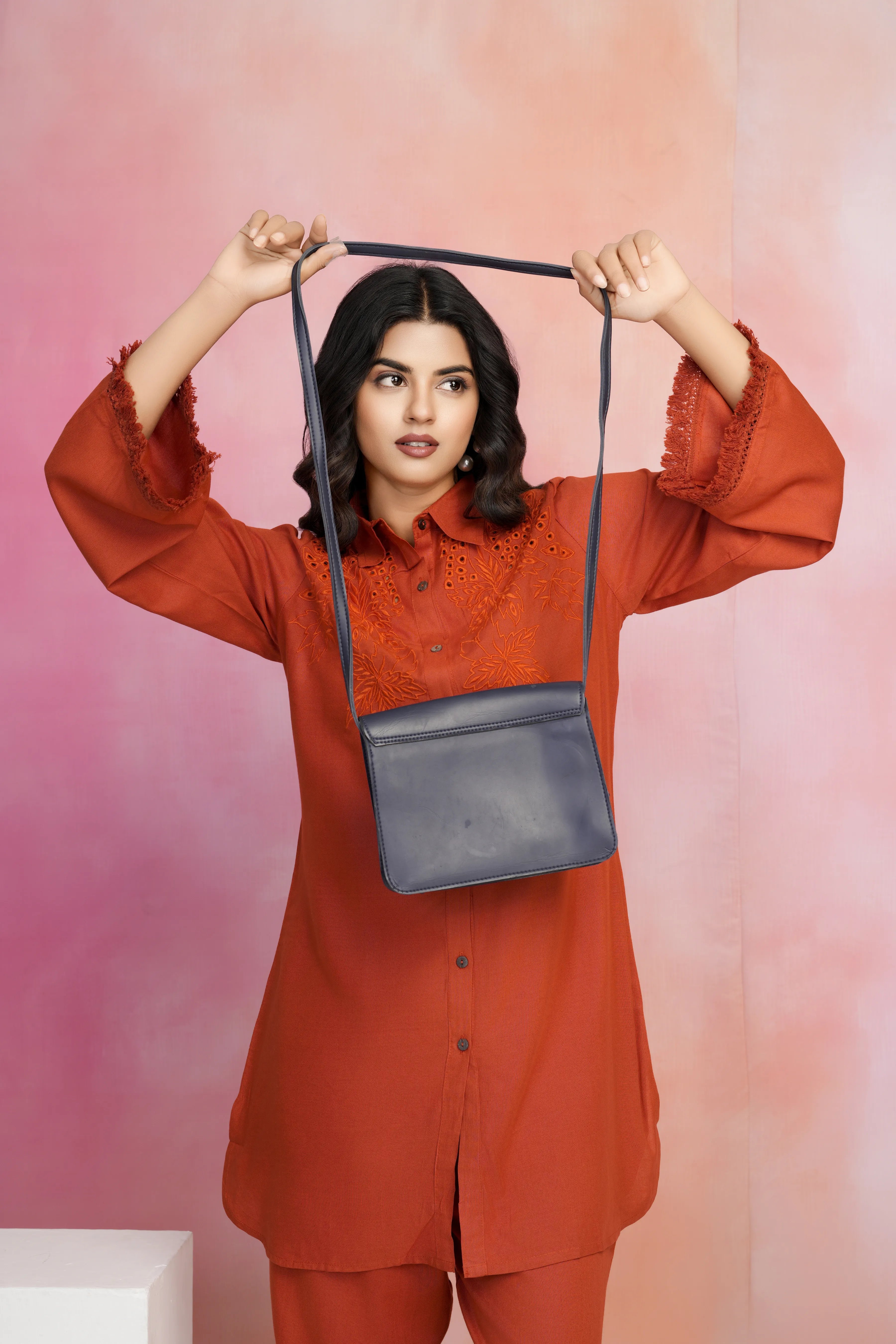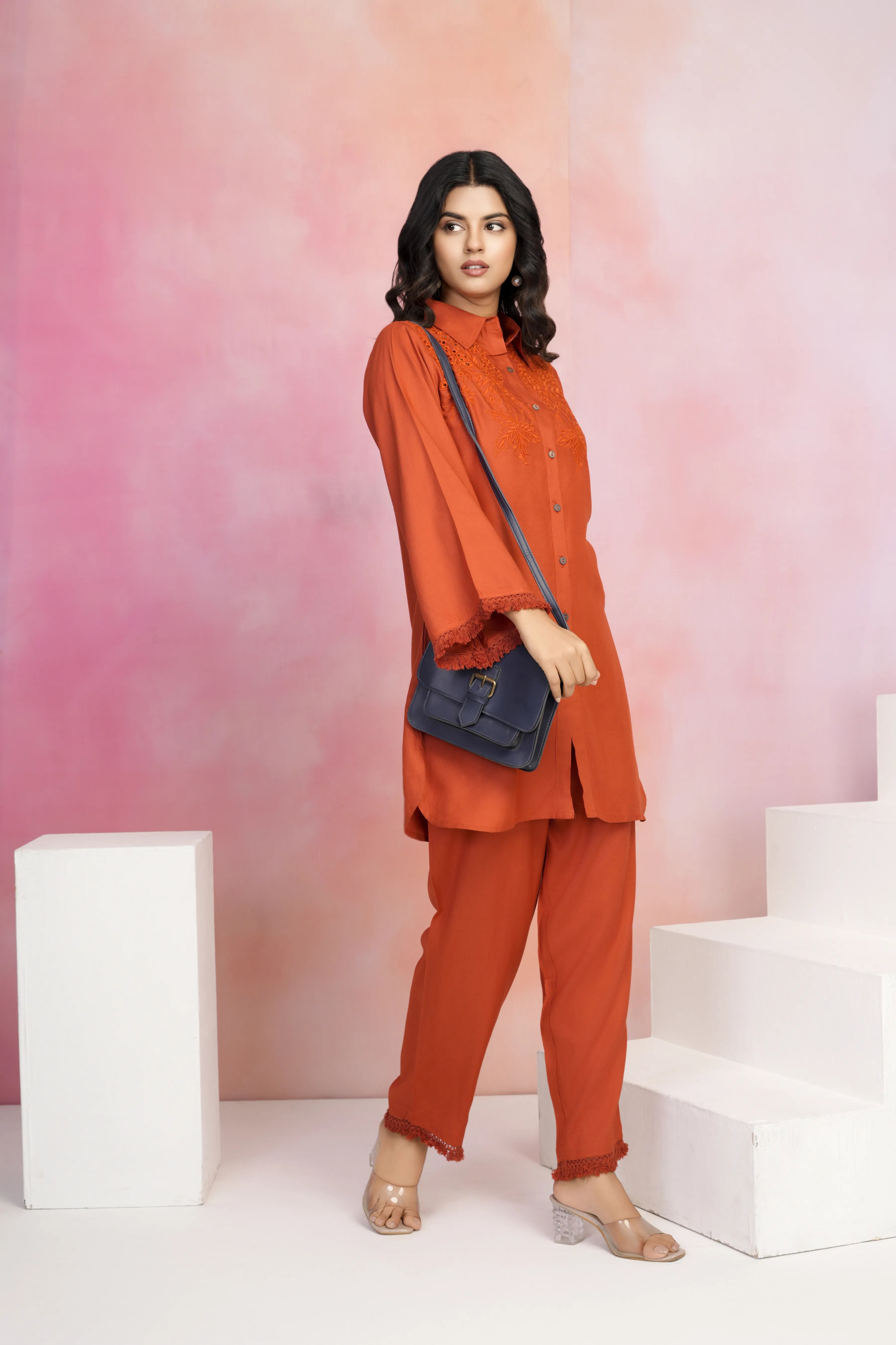 Brighten your wardrobe with this chic tangerine co-ord set, crafted from soft and breathable Viscose rayon for all-day comfort. Featuring intricate embroidery on the front, elegant wooden button details, and delicate lace accents, this ensemble exudes effortless charm. The full sleeves add a refined touch, making it a versatile choice for both casual and semi-formal occasions.