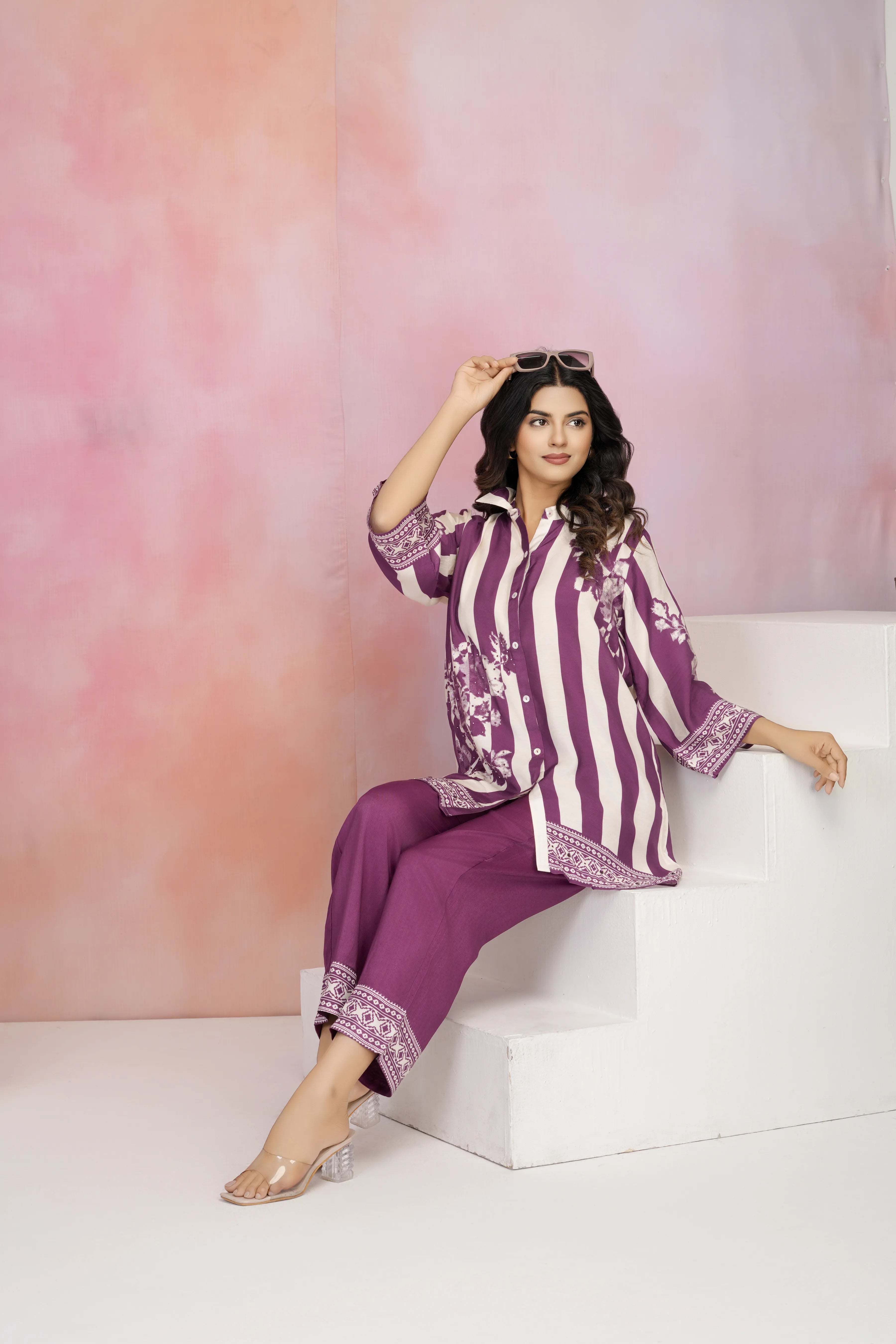 Sophisticated Elegance: Violet & Cream Striped Floral Print Co-Ord Set in Muslin