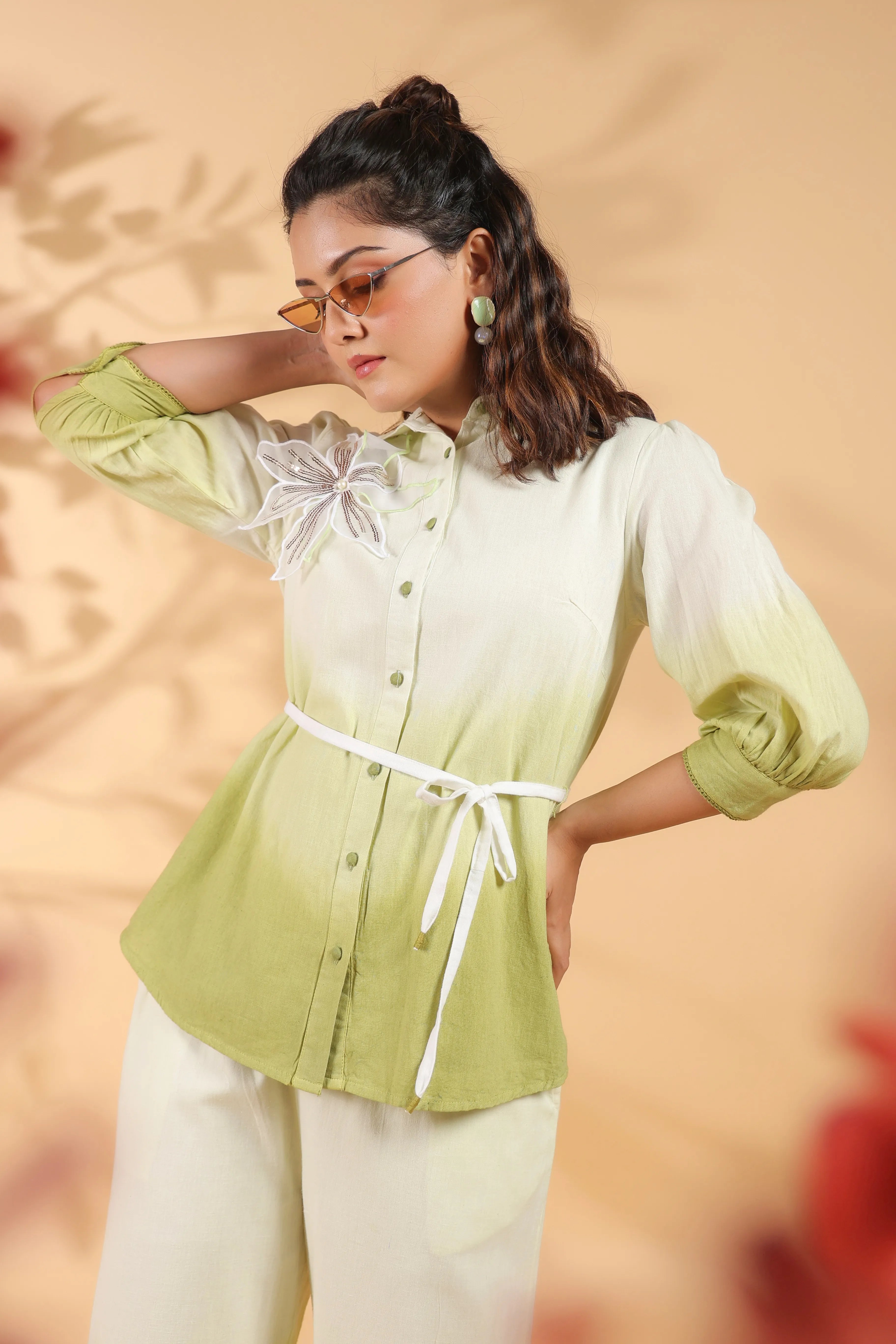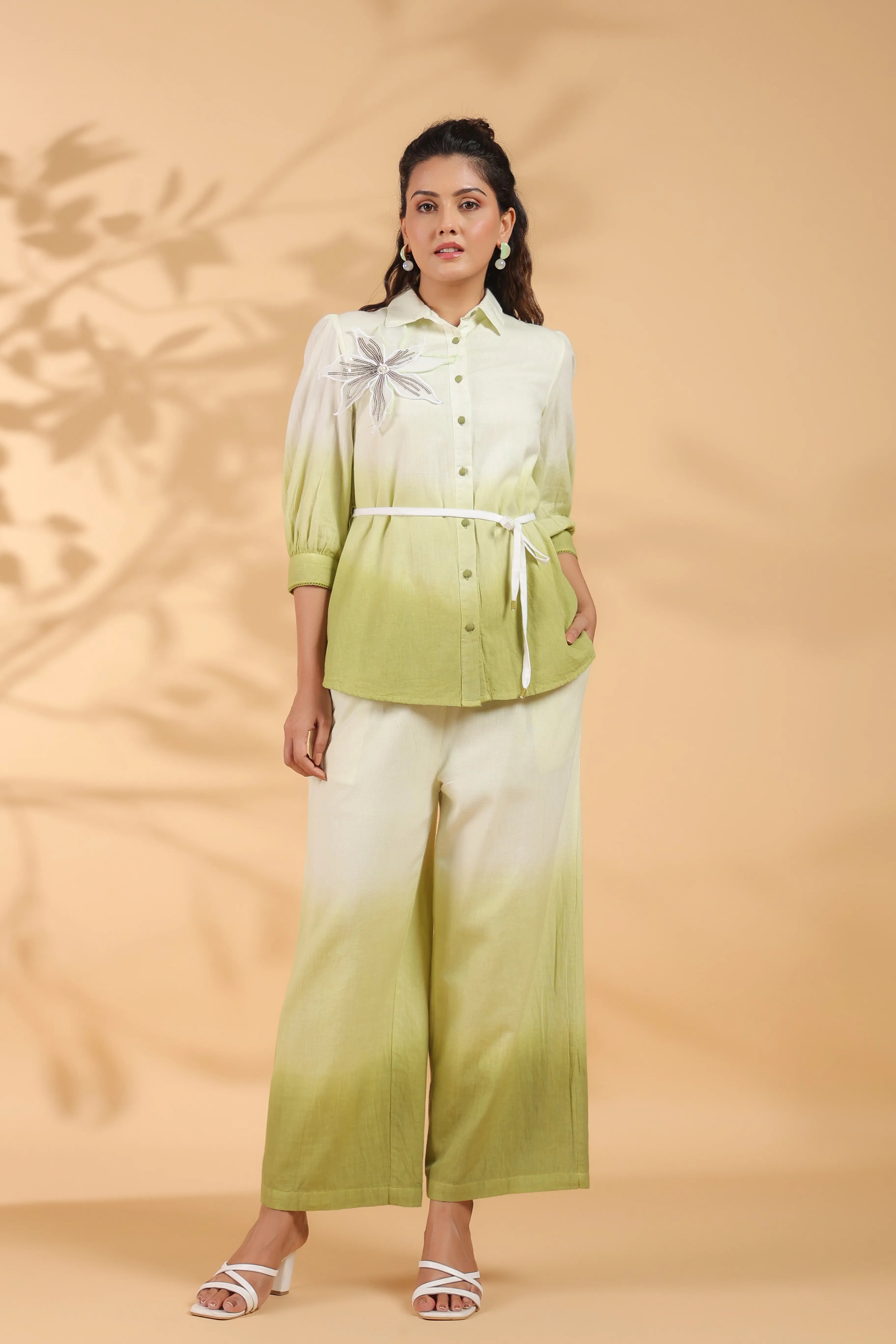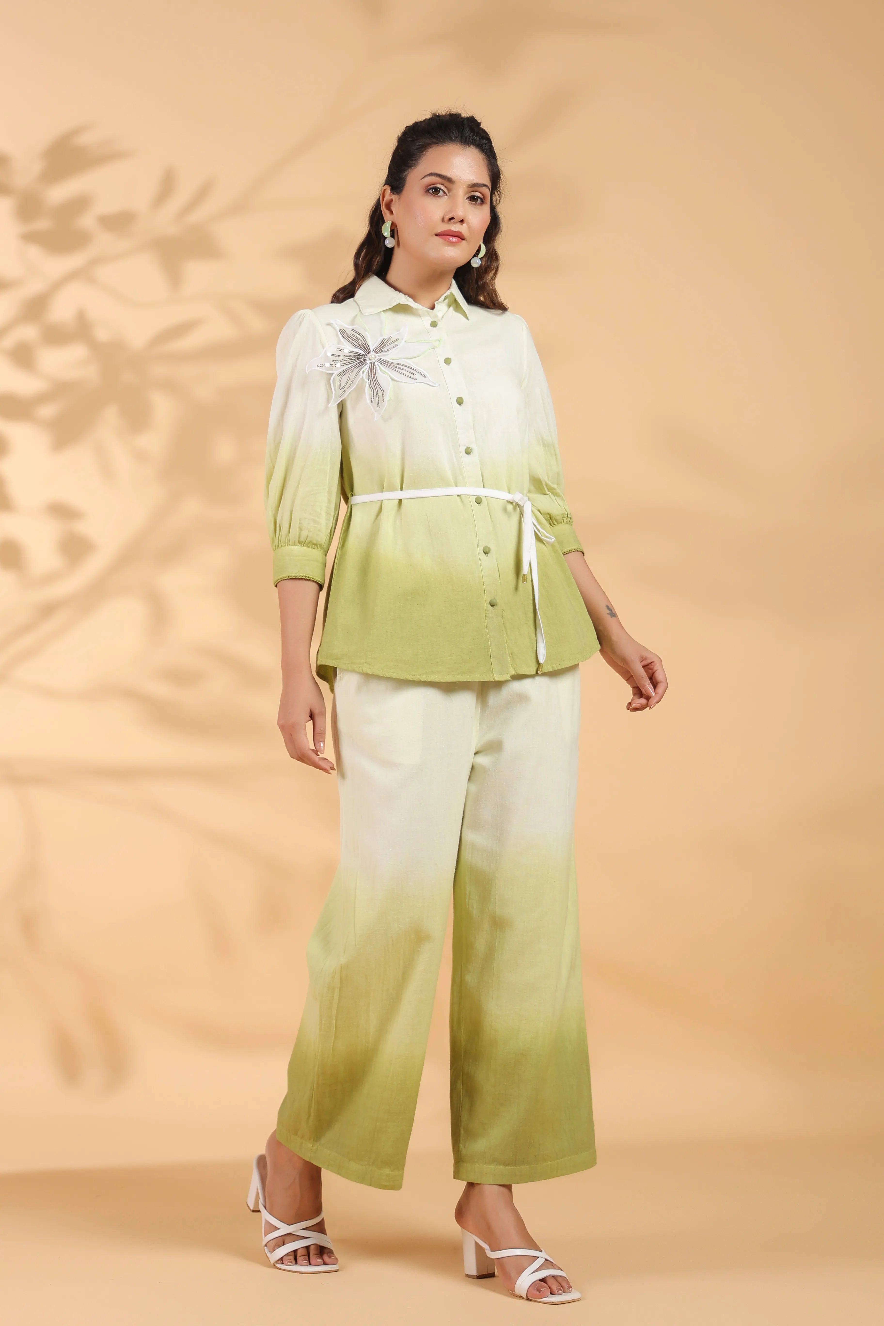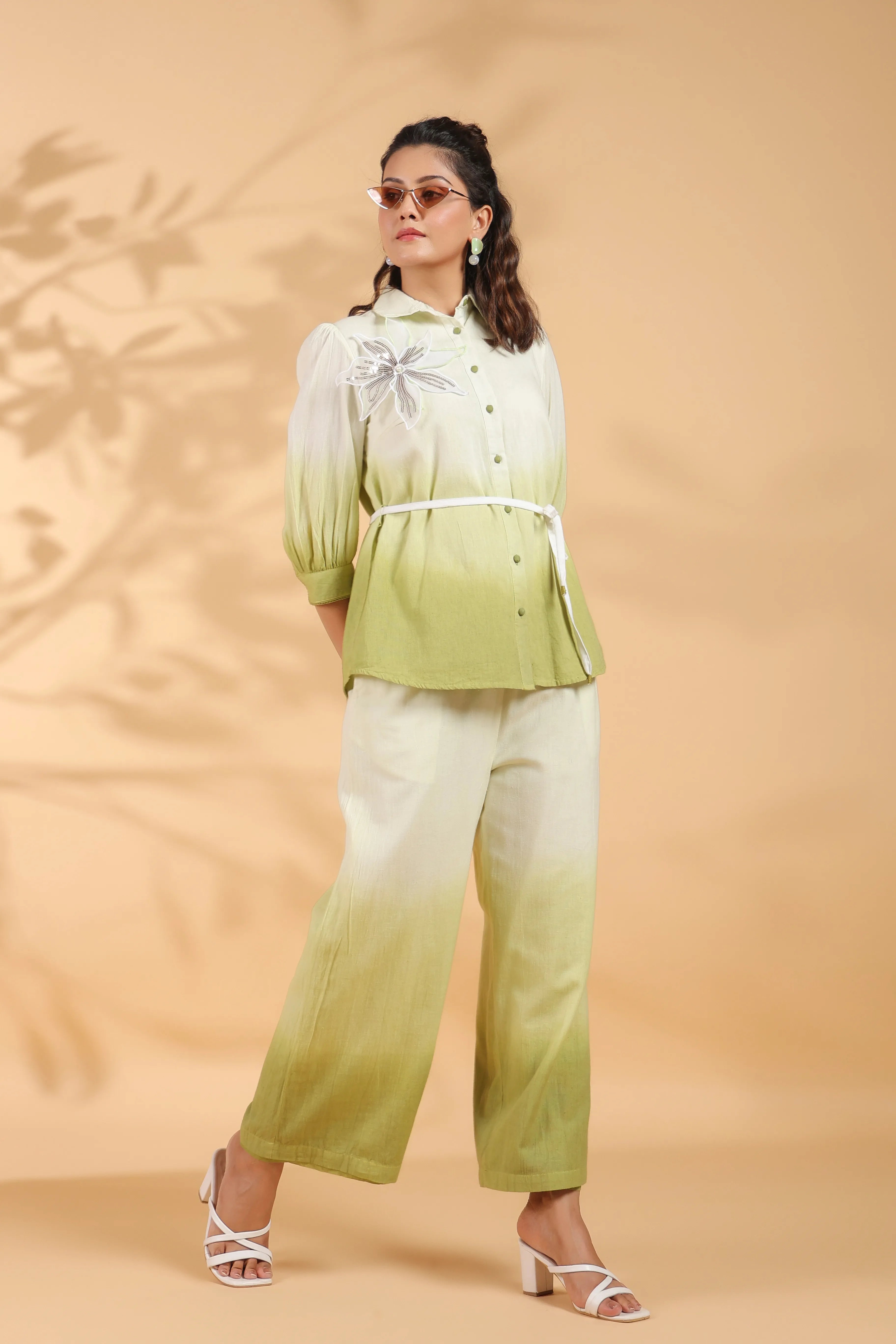 Bring an elegant touch to your wardrobe with this soothing white and sage green co-ord set, crafted from breathable and lightweight cotton flex. Featuring a chic dip-dye effect and delicate applique flower embroidery, this set strikes the perfect balance between sophistication and comfort.
