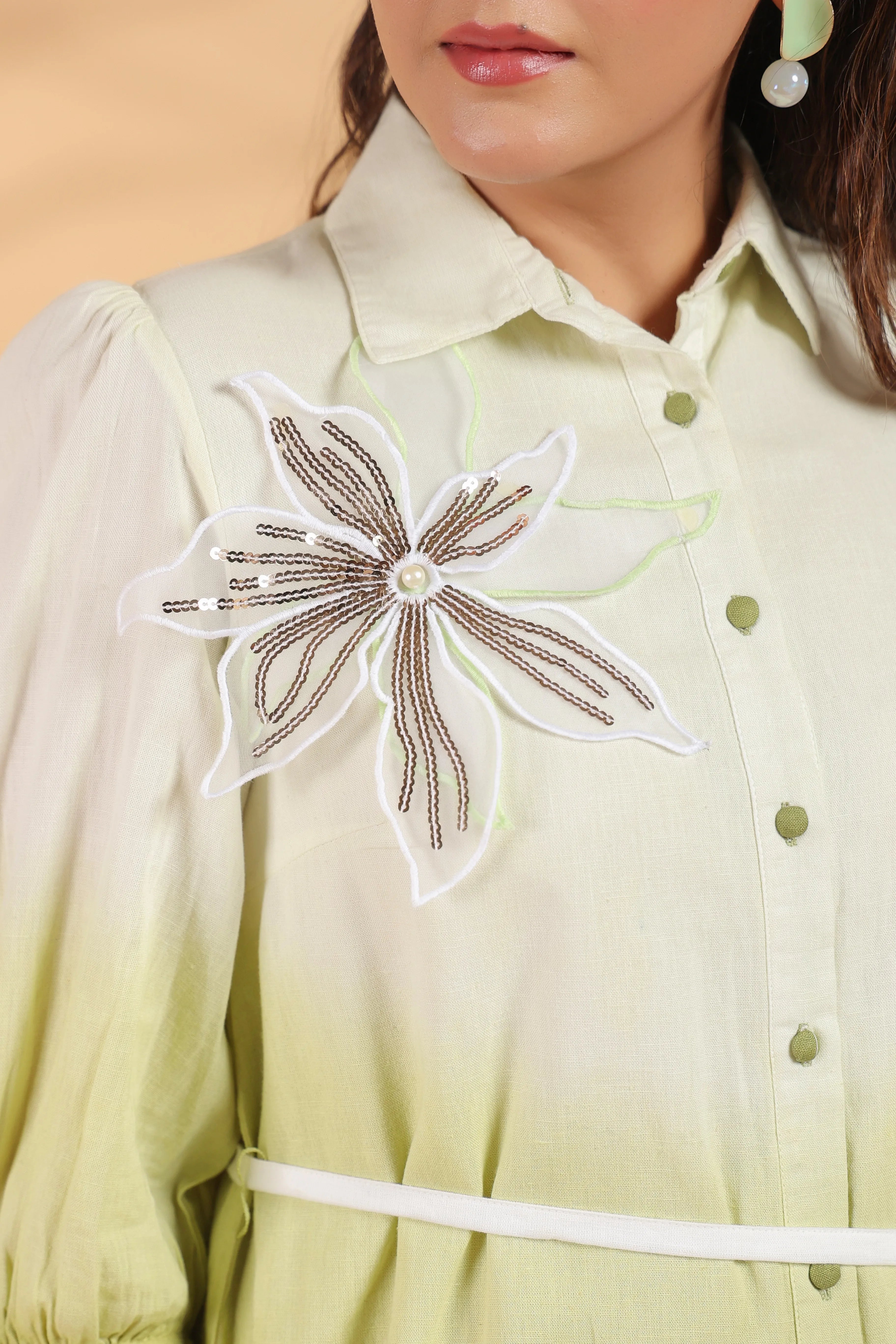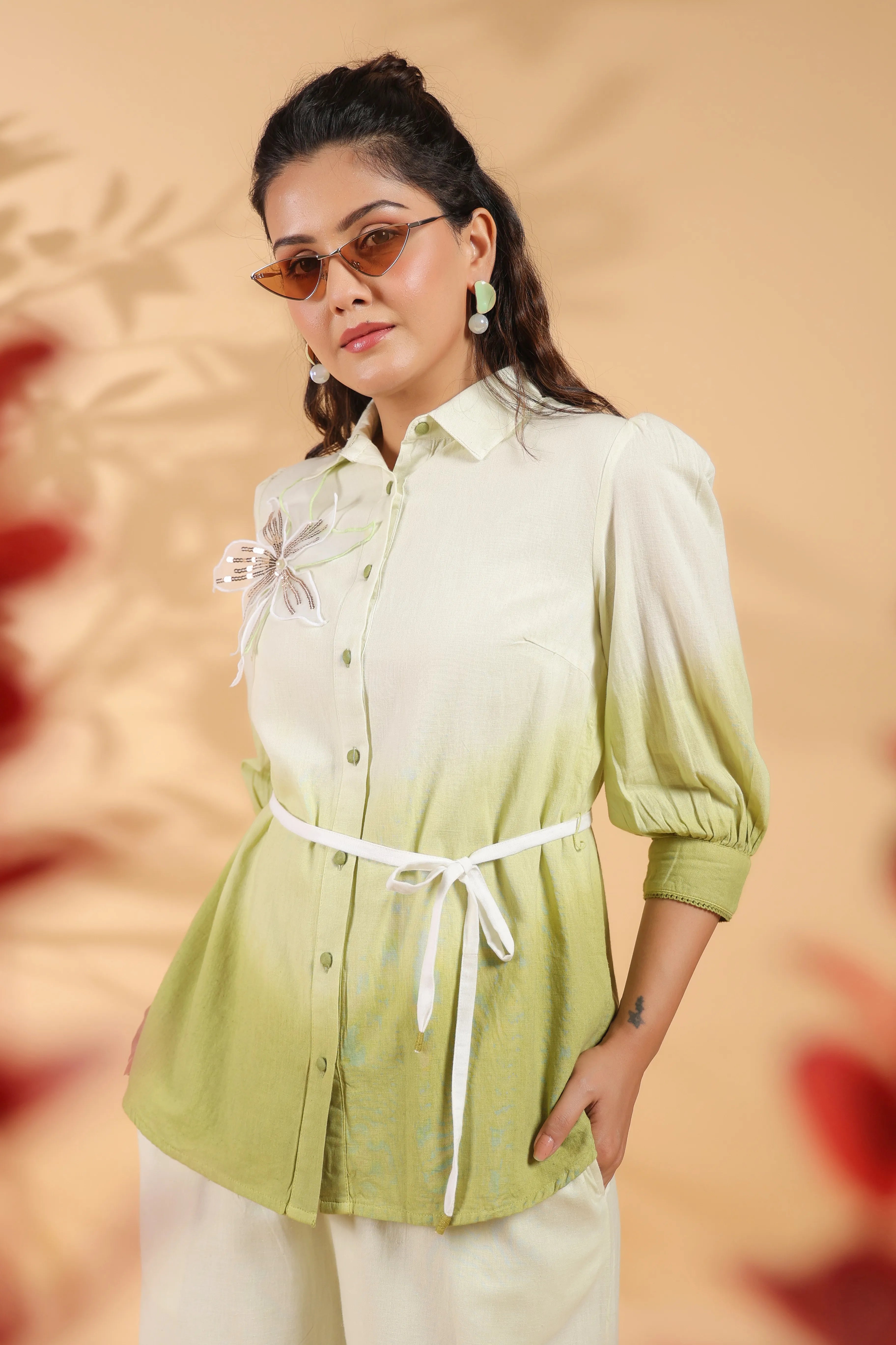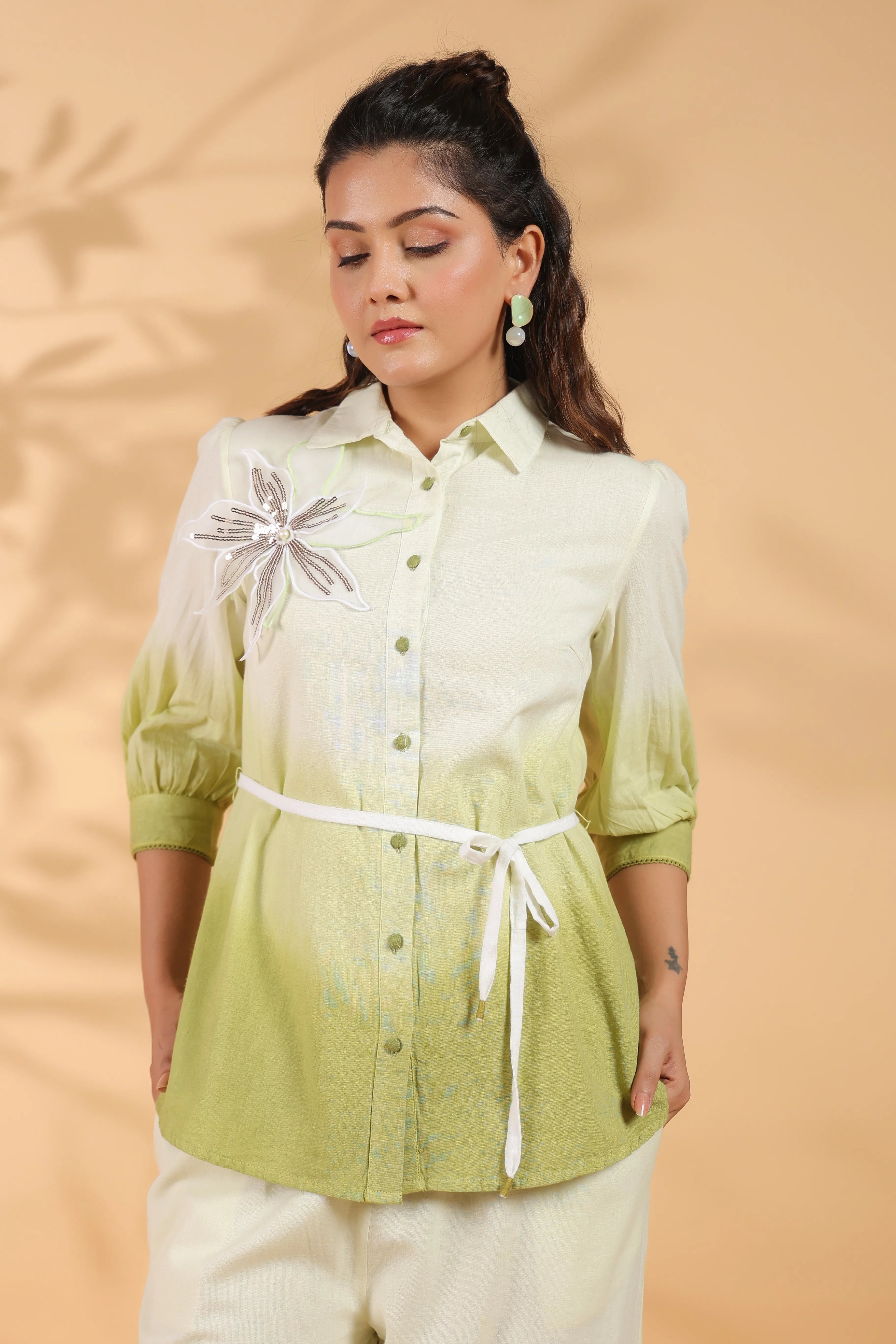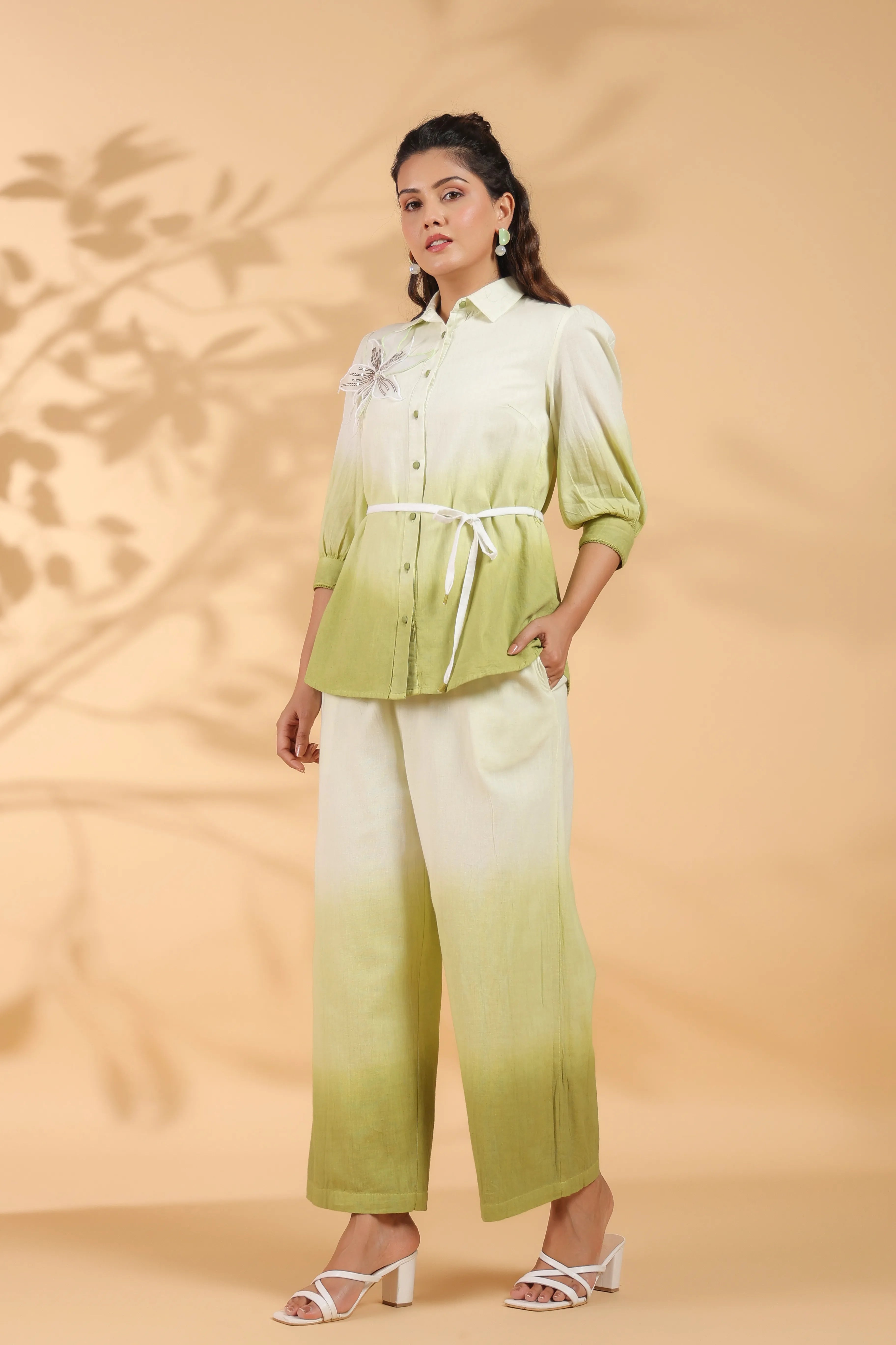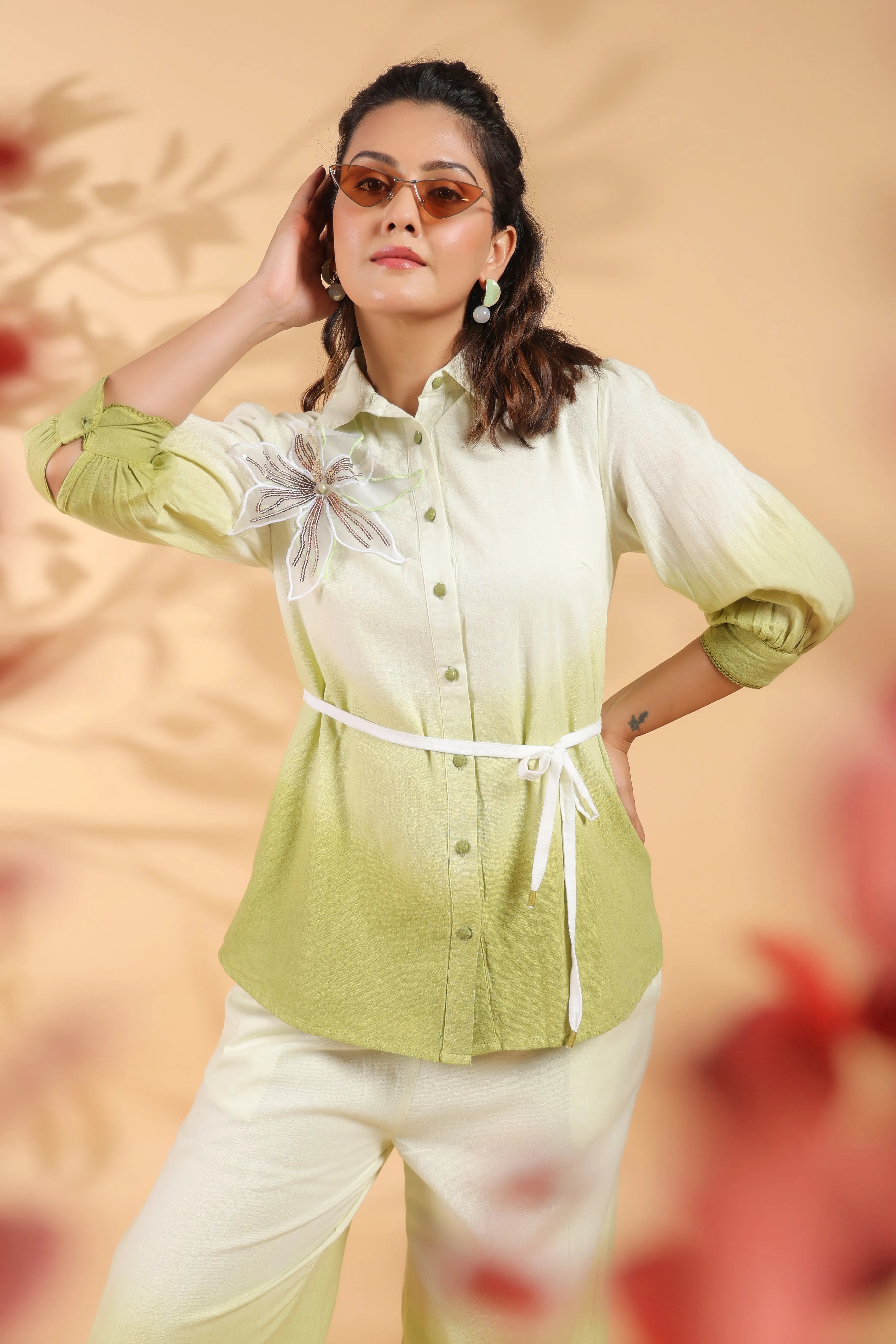 Bring an elegant touch to your wardrobe with this soothing white and sage green co-ord set, crafted from breathable and lightweight cotton flex. Featuring a chic dip-dye effect and delicate applique flower embroidery, this set strikes the perfect balance between sophistication and comfort.