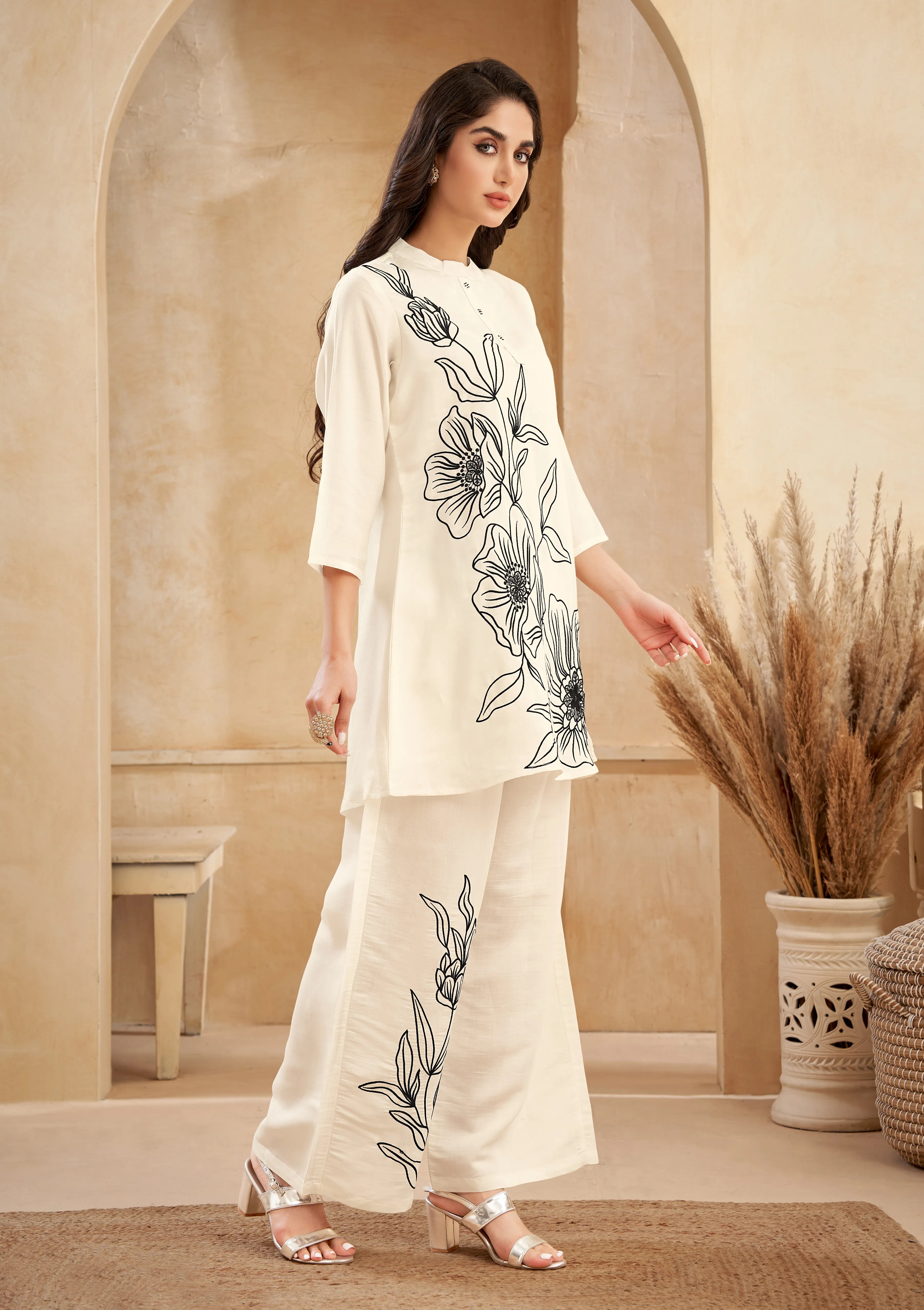 Add a graceful touch to your wardrobe with the White Big Floral Embroidered Chinon Co-Ord Set. This elegant ensemble features a classic round neck paired with bold floral embroidery for a modern yet timeless look. Crafted from lightweight chinon fabric, the set is both breathable and luxurious. The 3/4th sleeves and wide-leg pants create a relaxed and comfortable fit, making this set perfect for a variety of occasions.