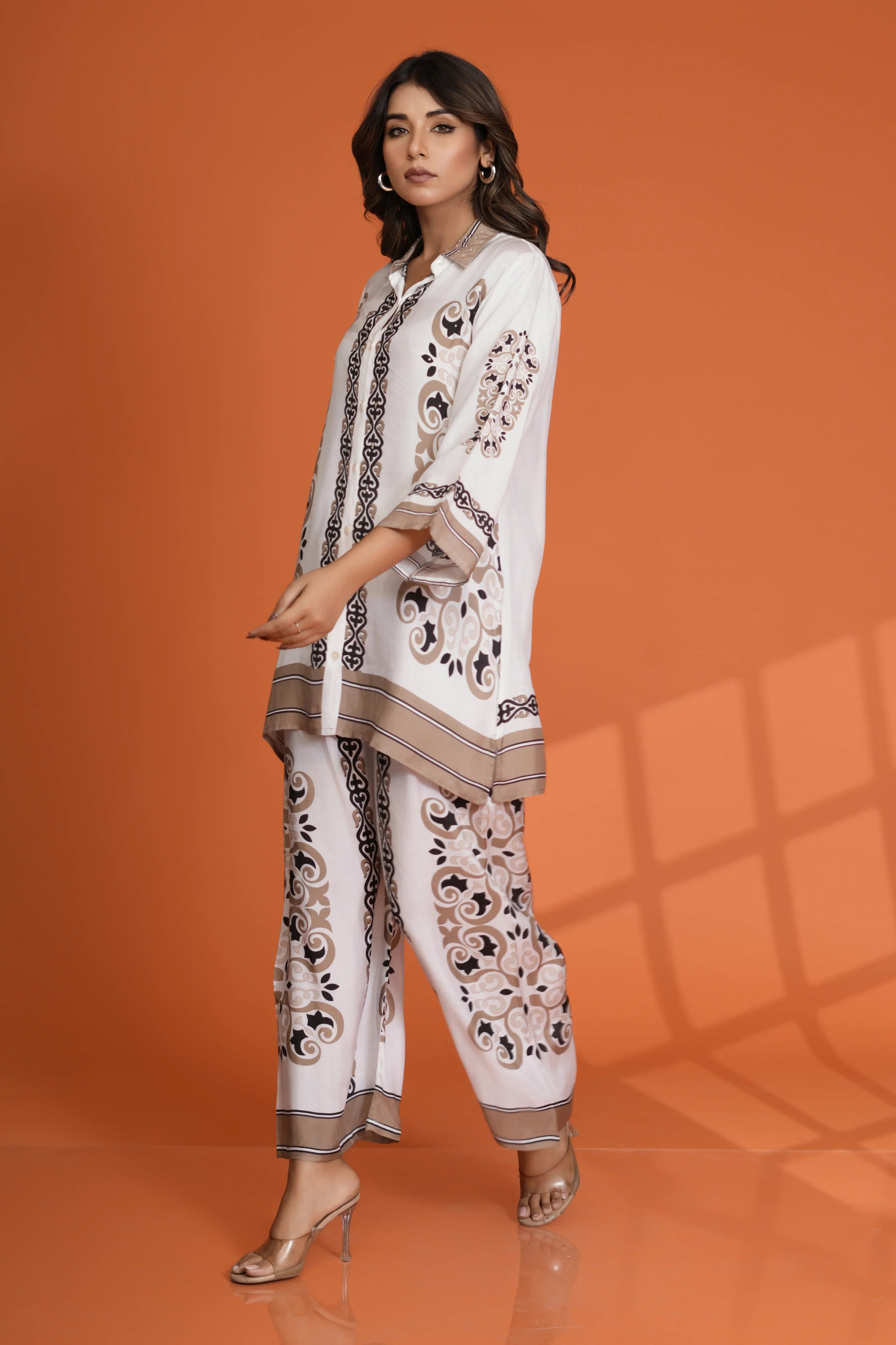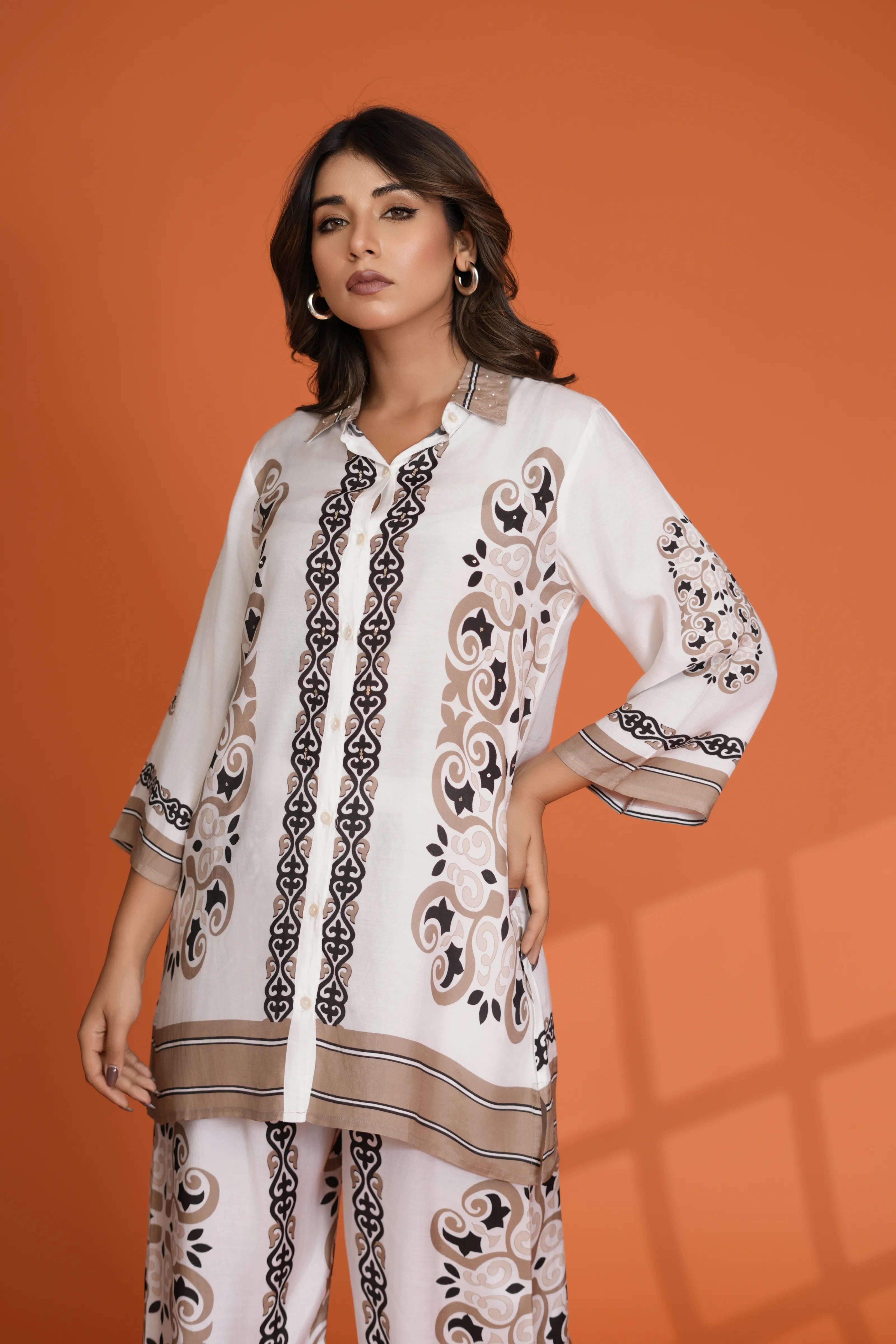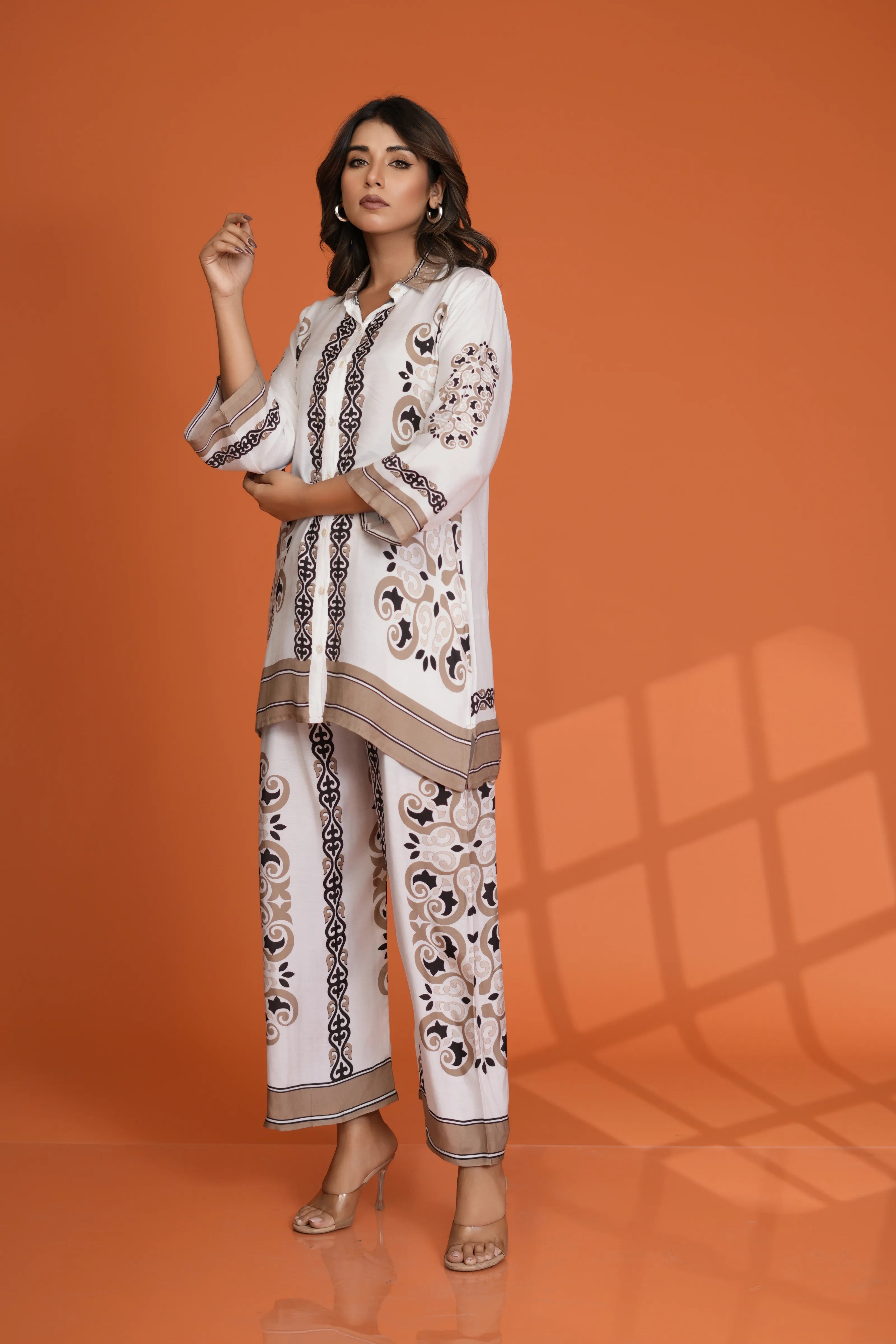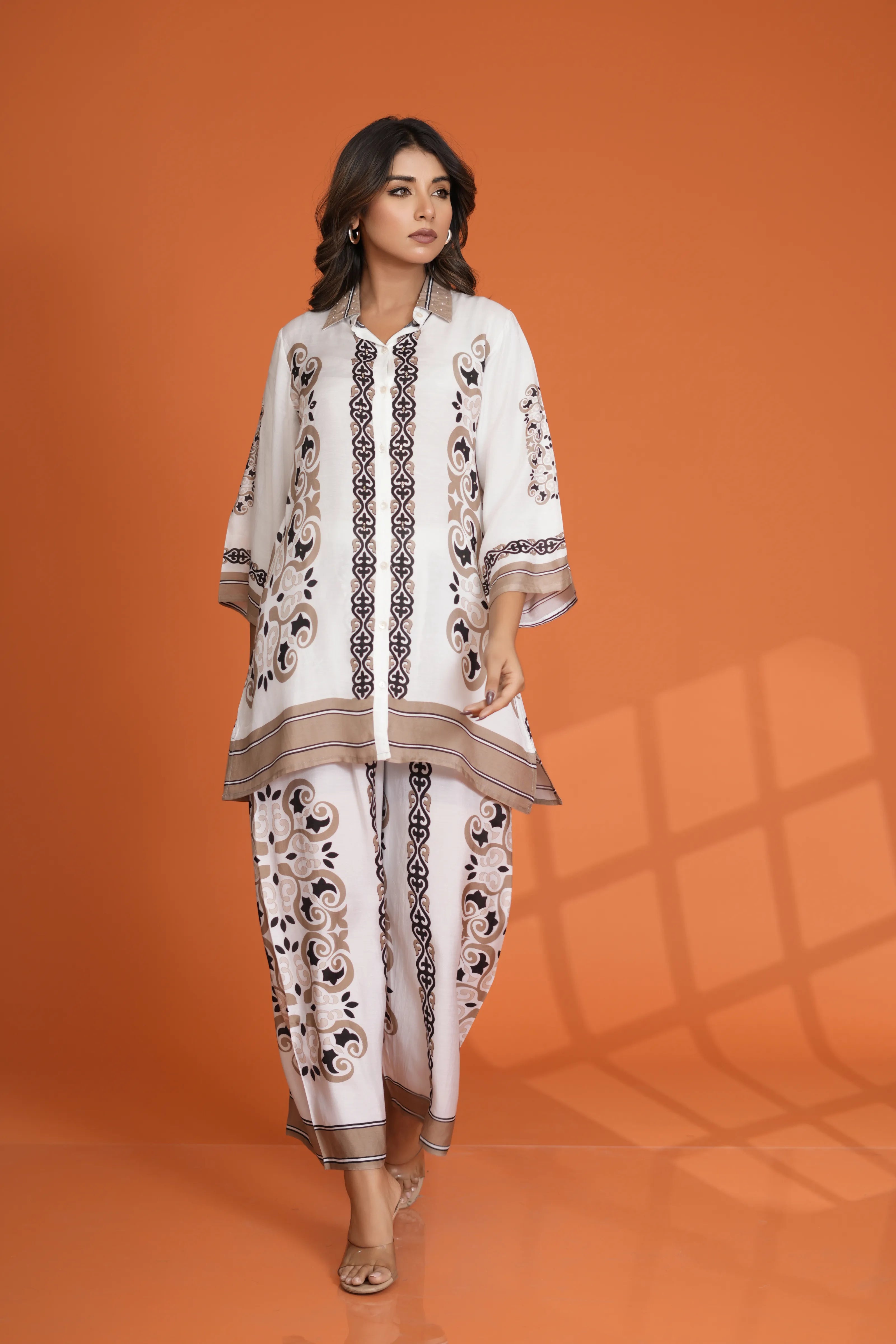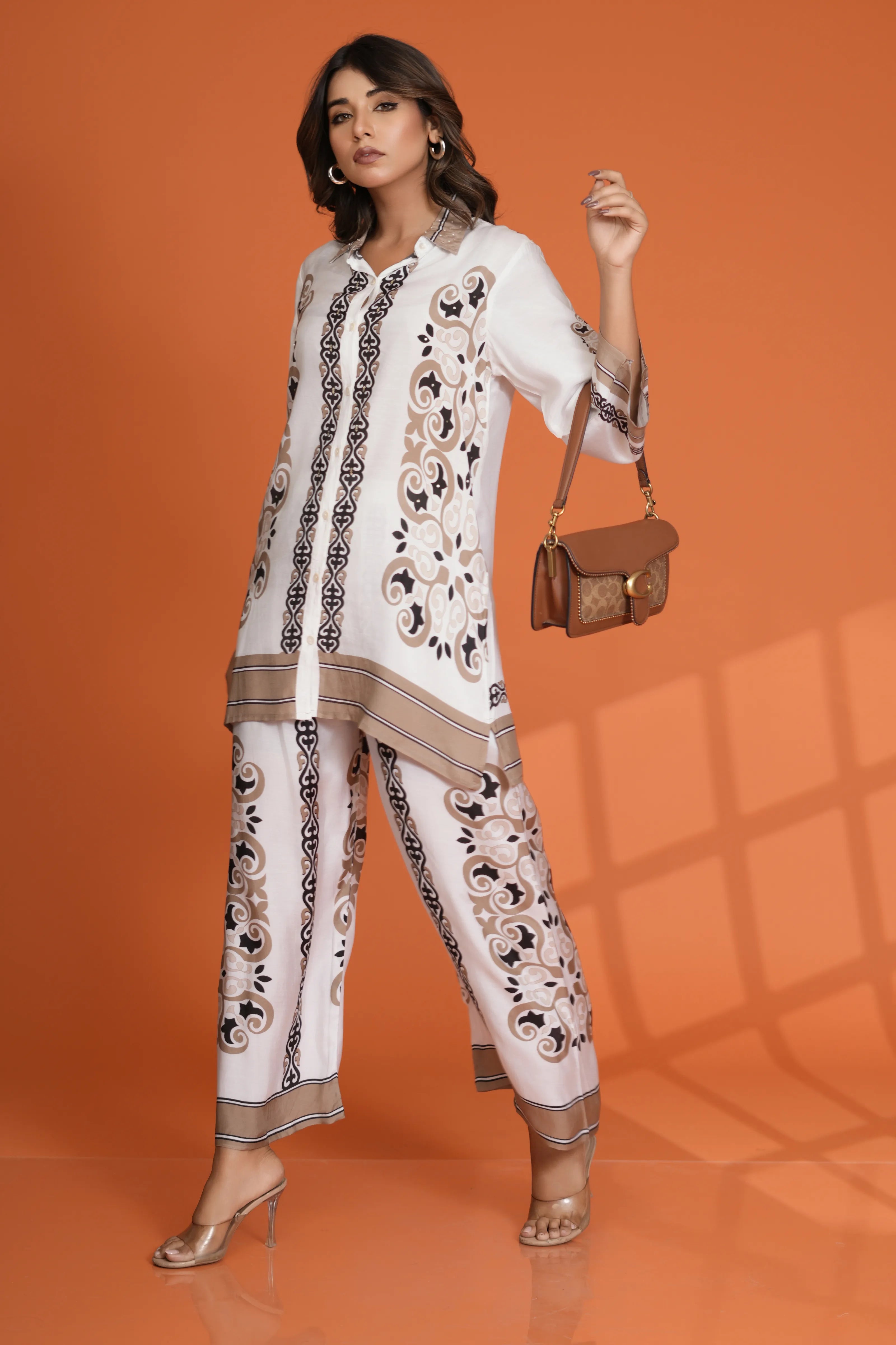 Desert Bloom: White & Brown Floral Placement Print Co-ord Set in Muslin