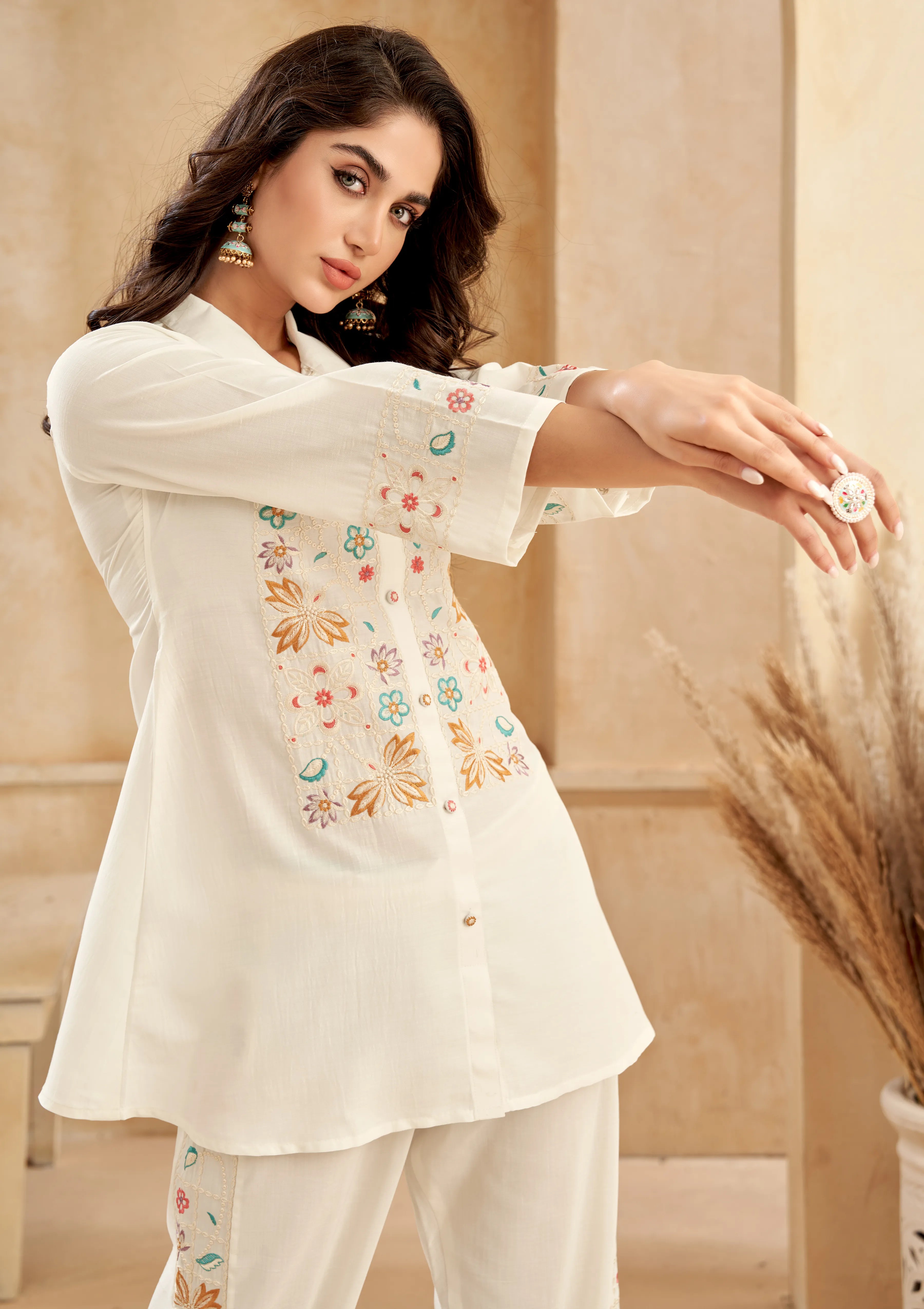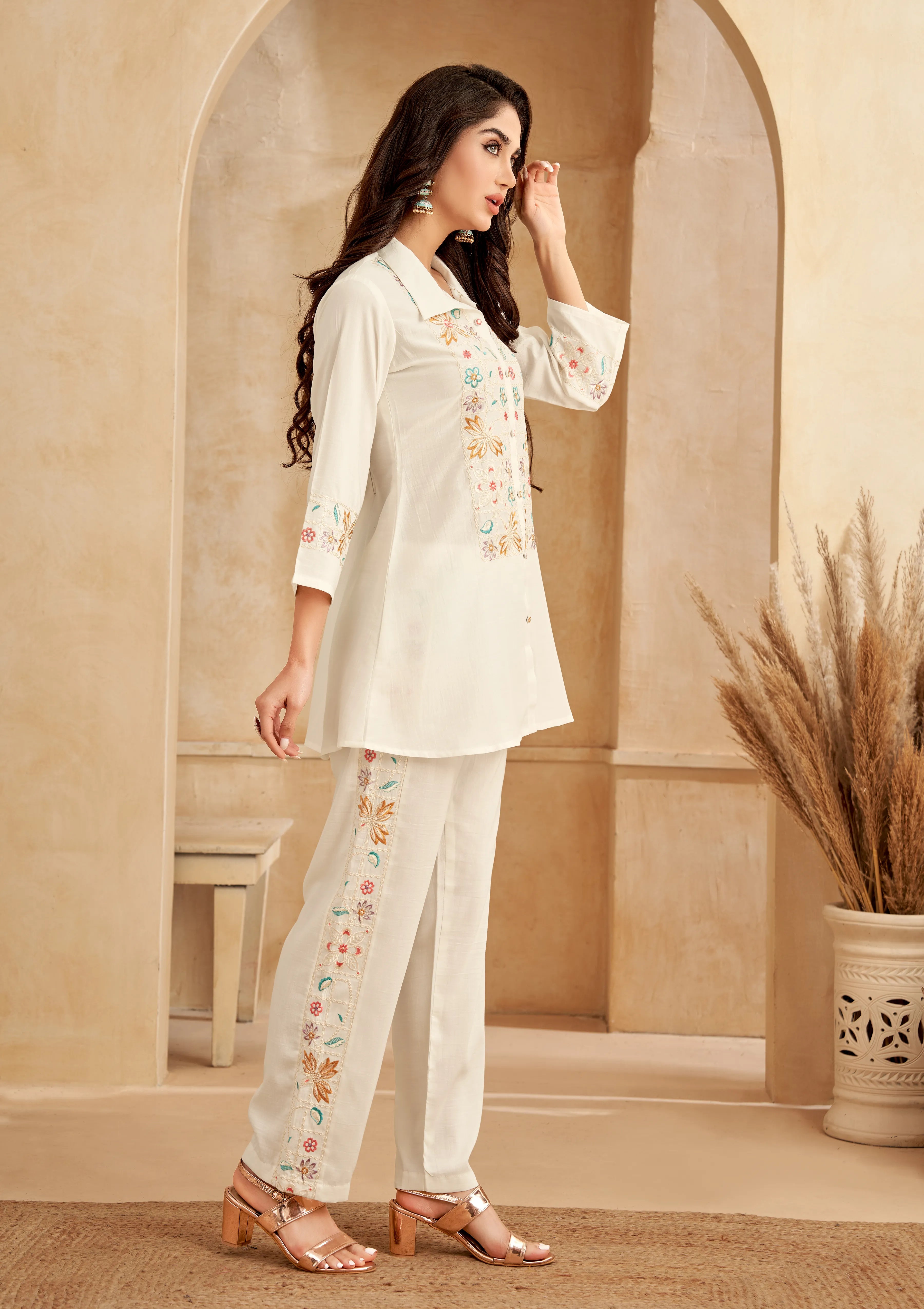 - Design: White Co-Ord Set with Multi-Color Floral Embroidery