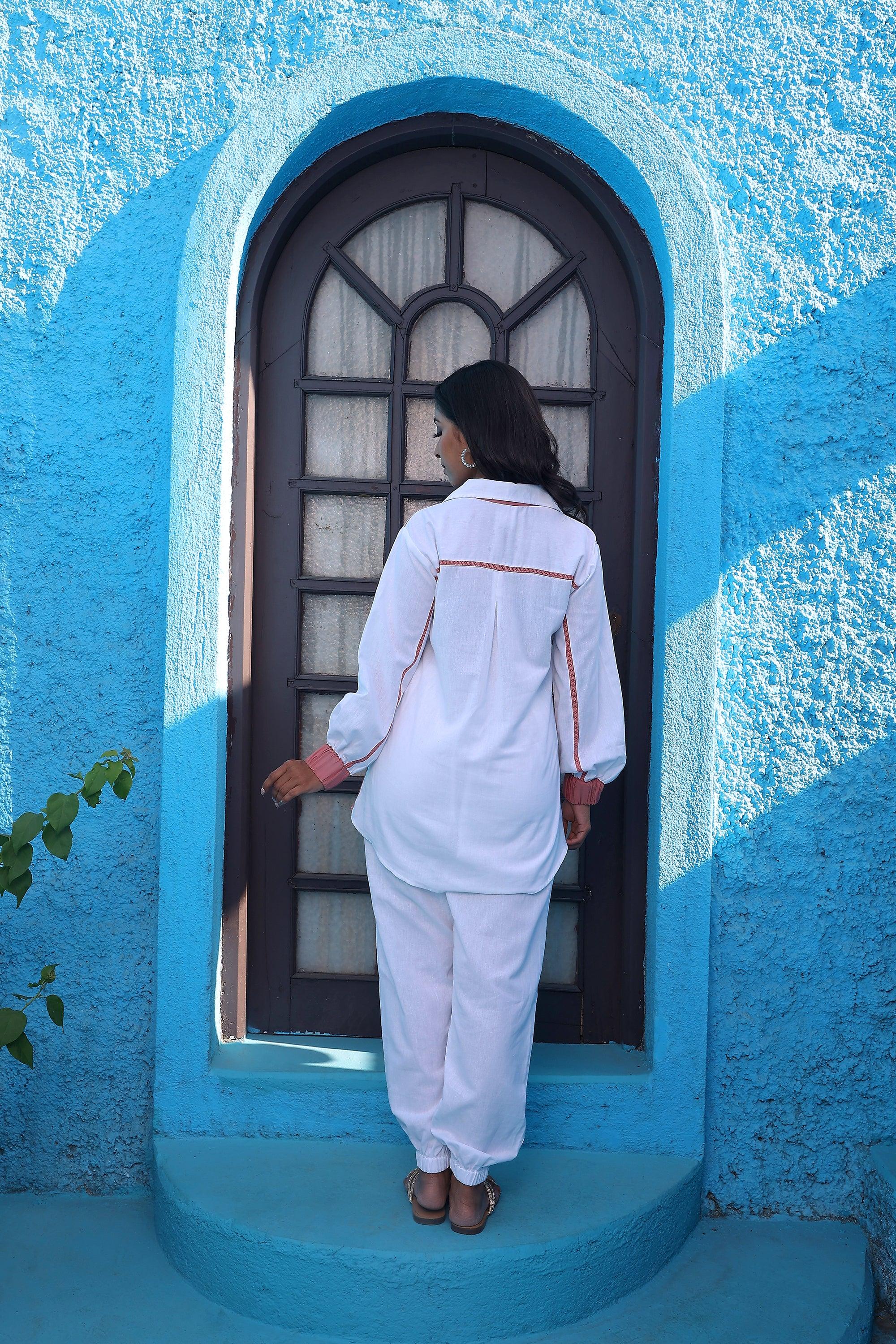 This white shirt-style tunic set is perfect for those who love a blend of relaxed yet elegant style, offering both versatility and class in one beautiful package.