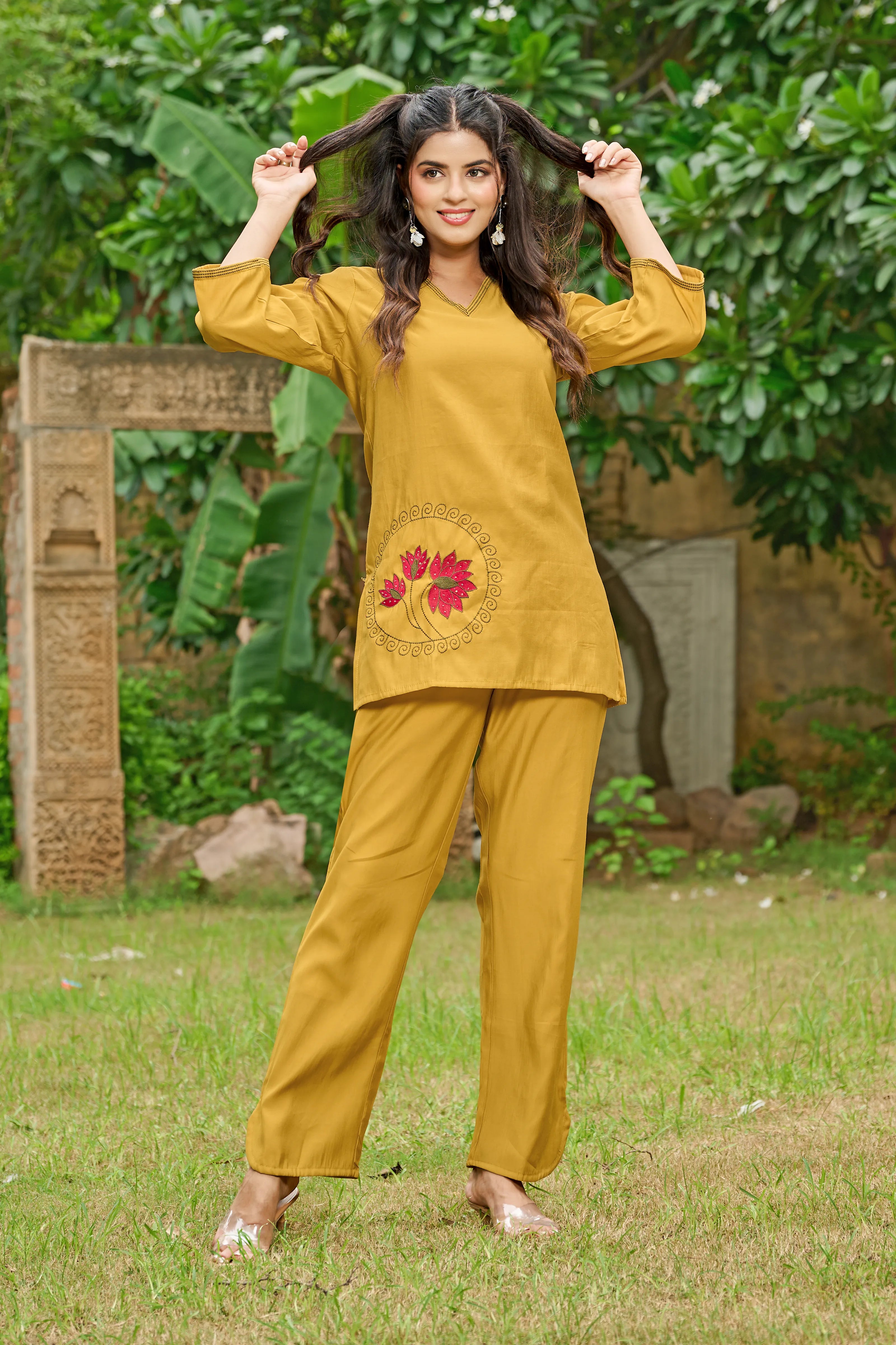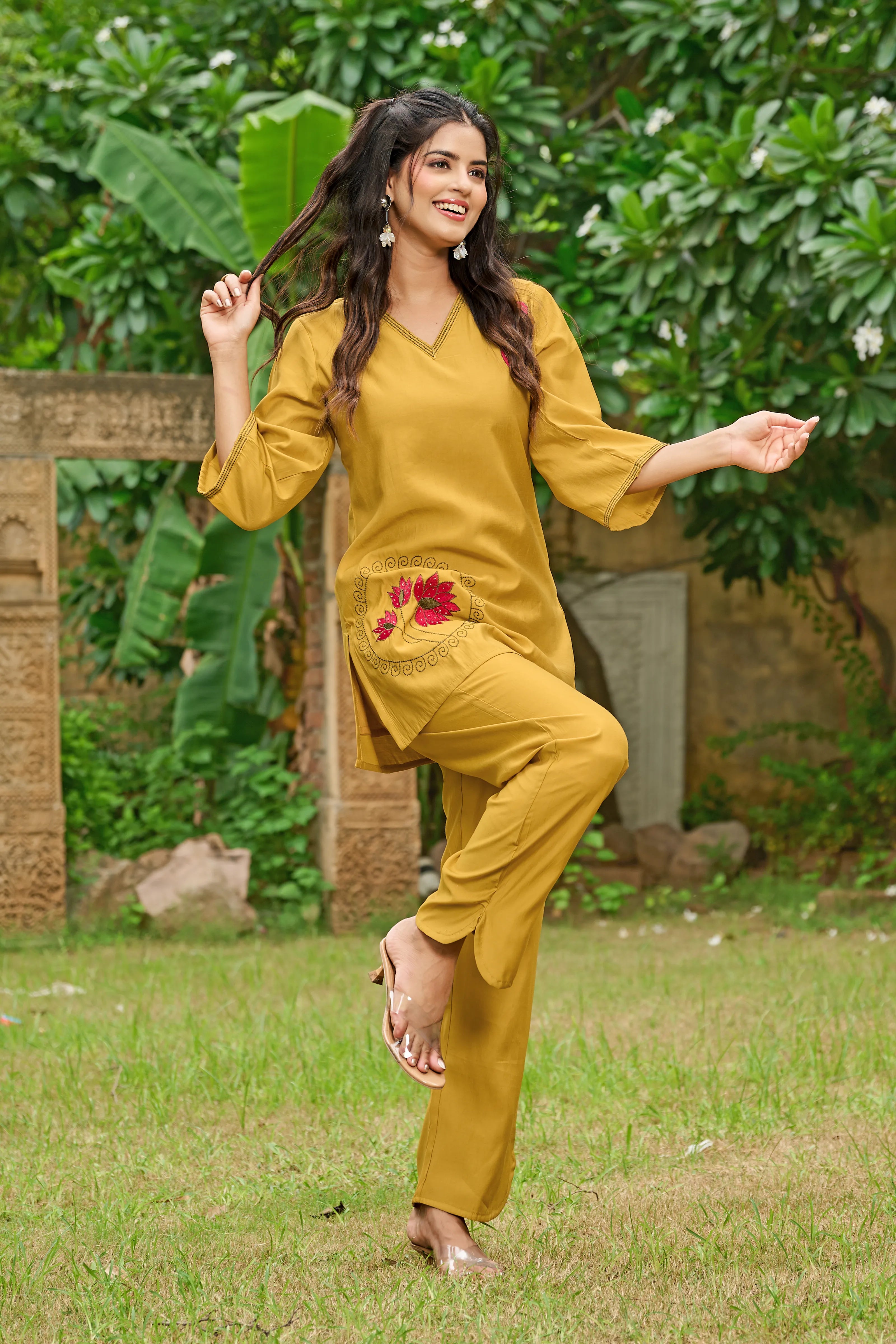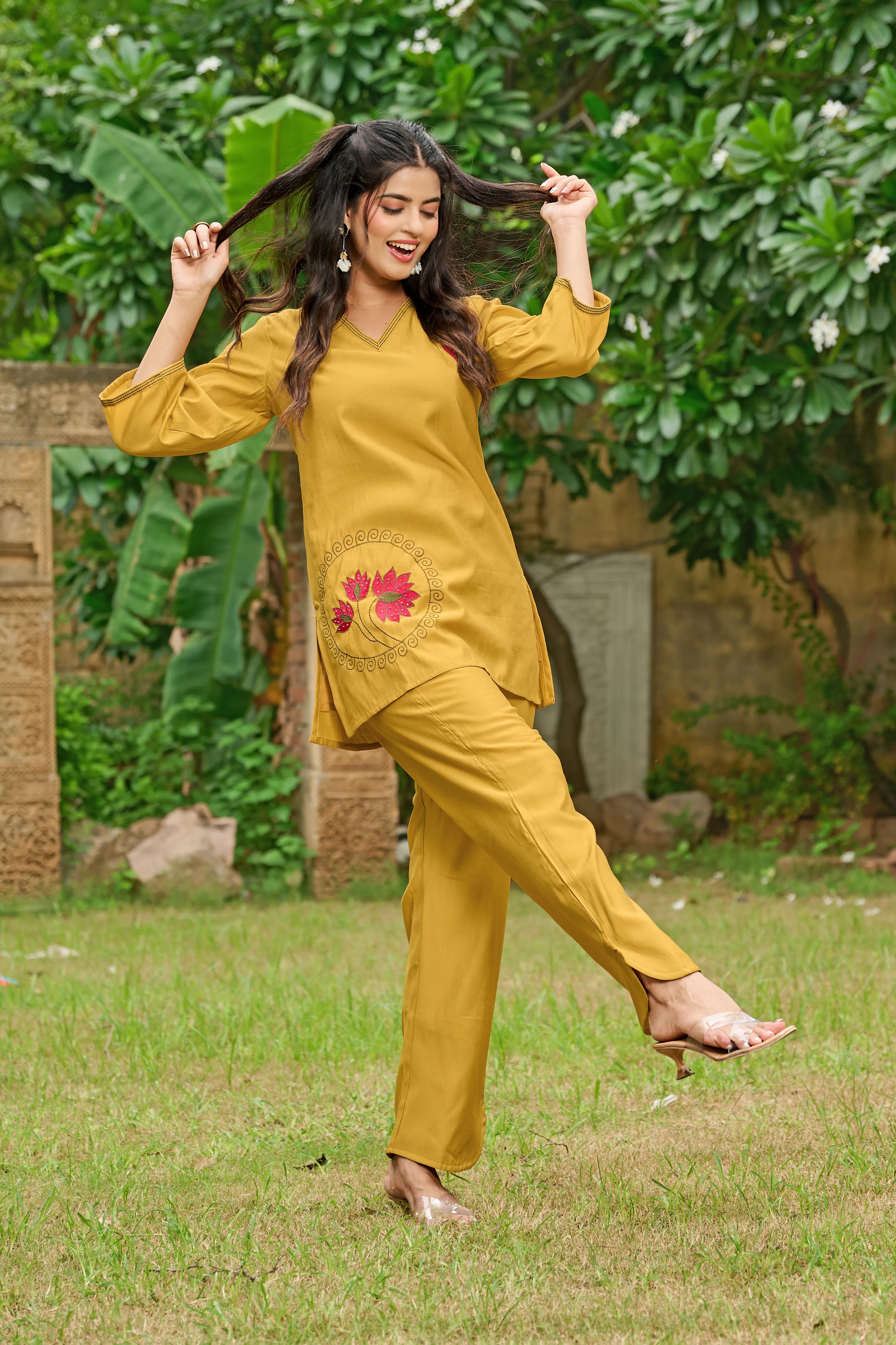A symbol of grace and serenity, Golden Bloom brings together tradition and elegance in a fresh mustard yellow hue. Crafted in luxe Roman silk, this co-ord set features a relaxed straight-cut kurta with dual-color lotus motif embroidery on the chest and hemline. The deep V-neckline and 3/4th sleeves add contemporary appeal, while the straight-leg pants complete the effortless silhouette.