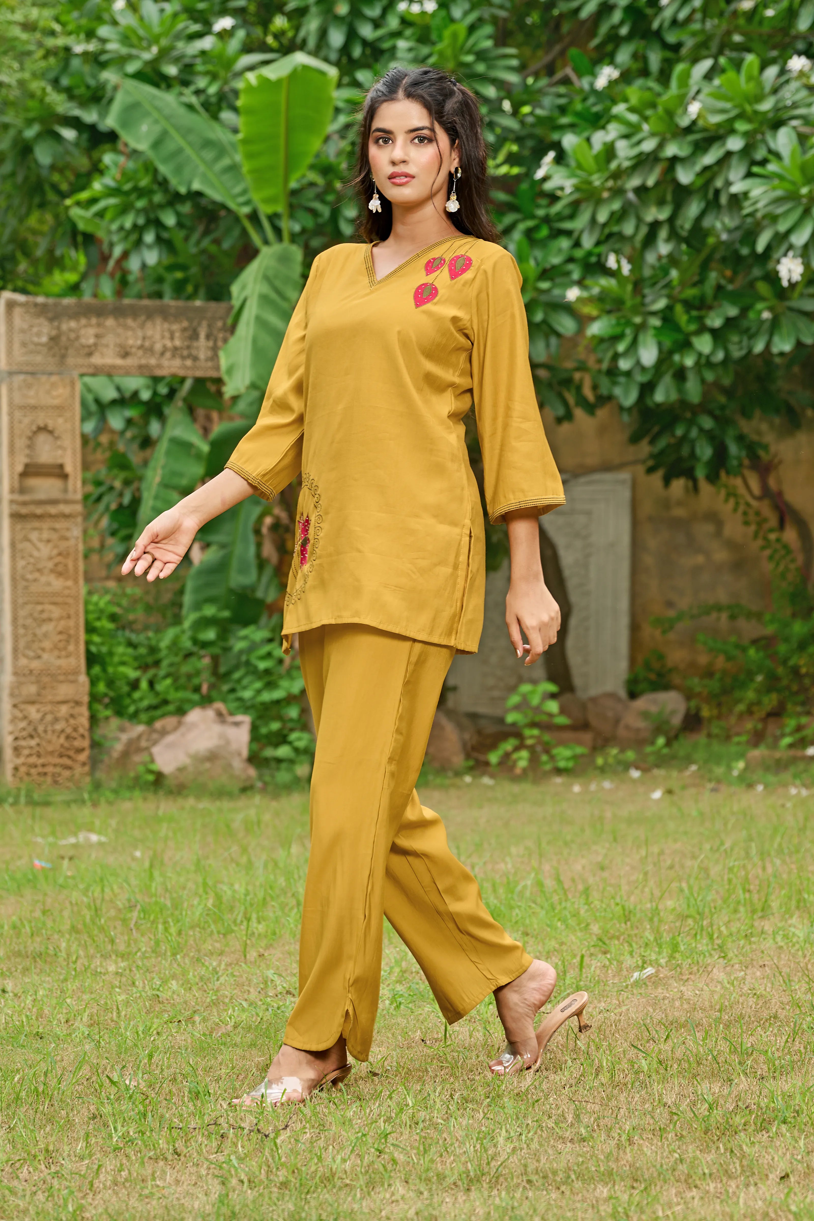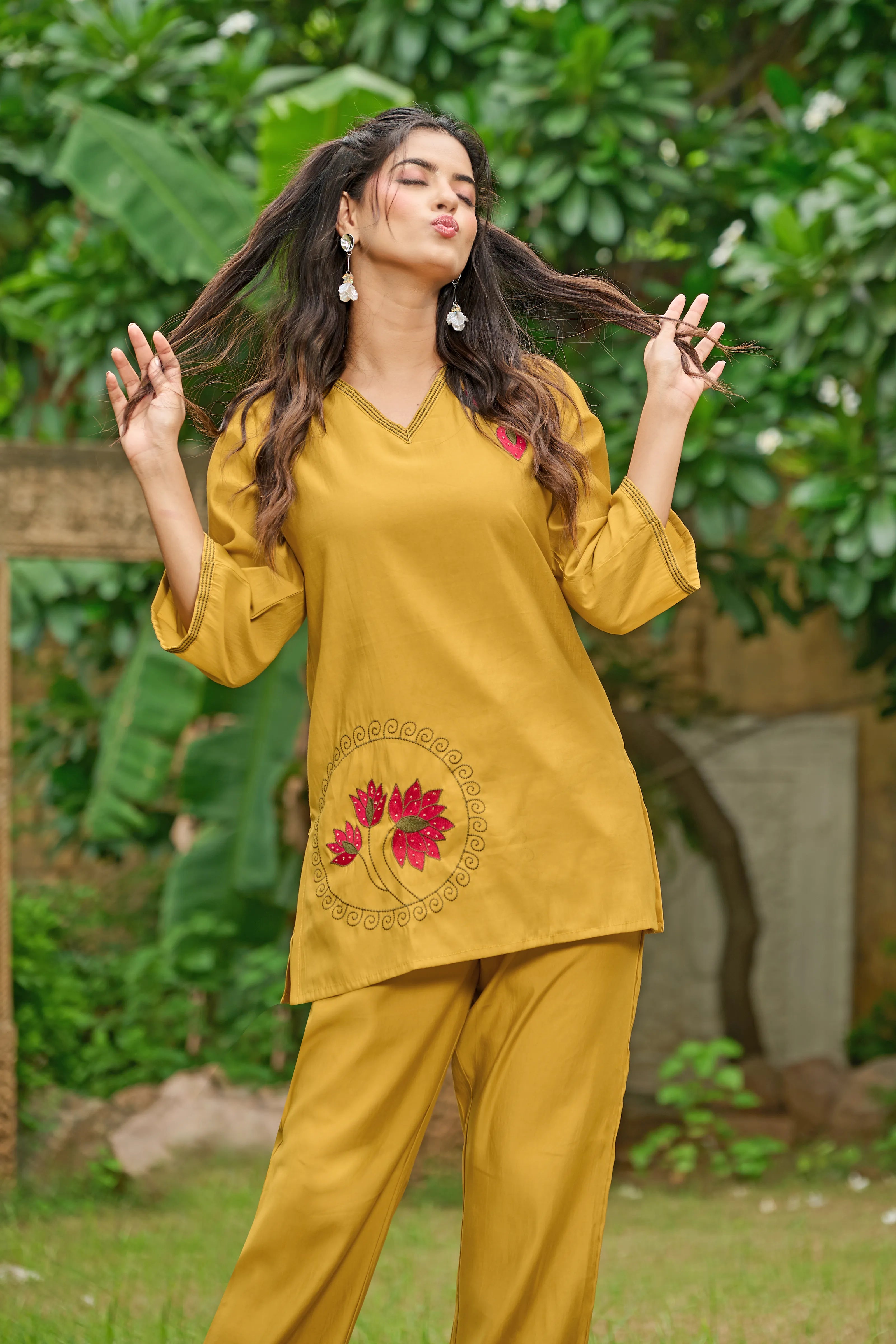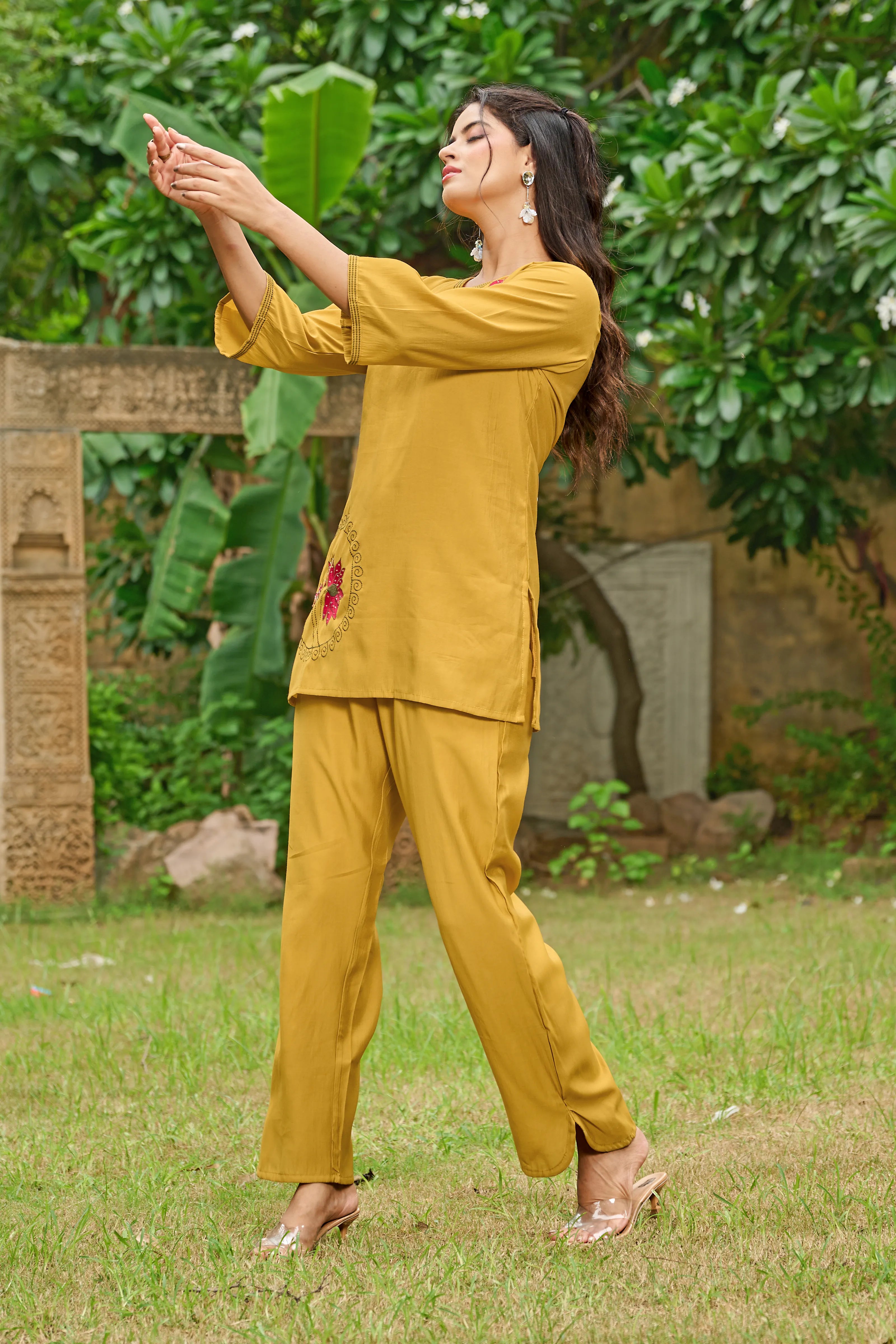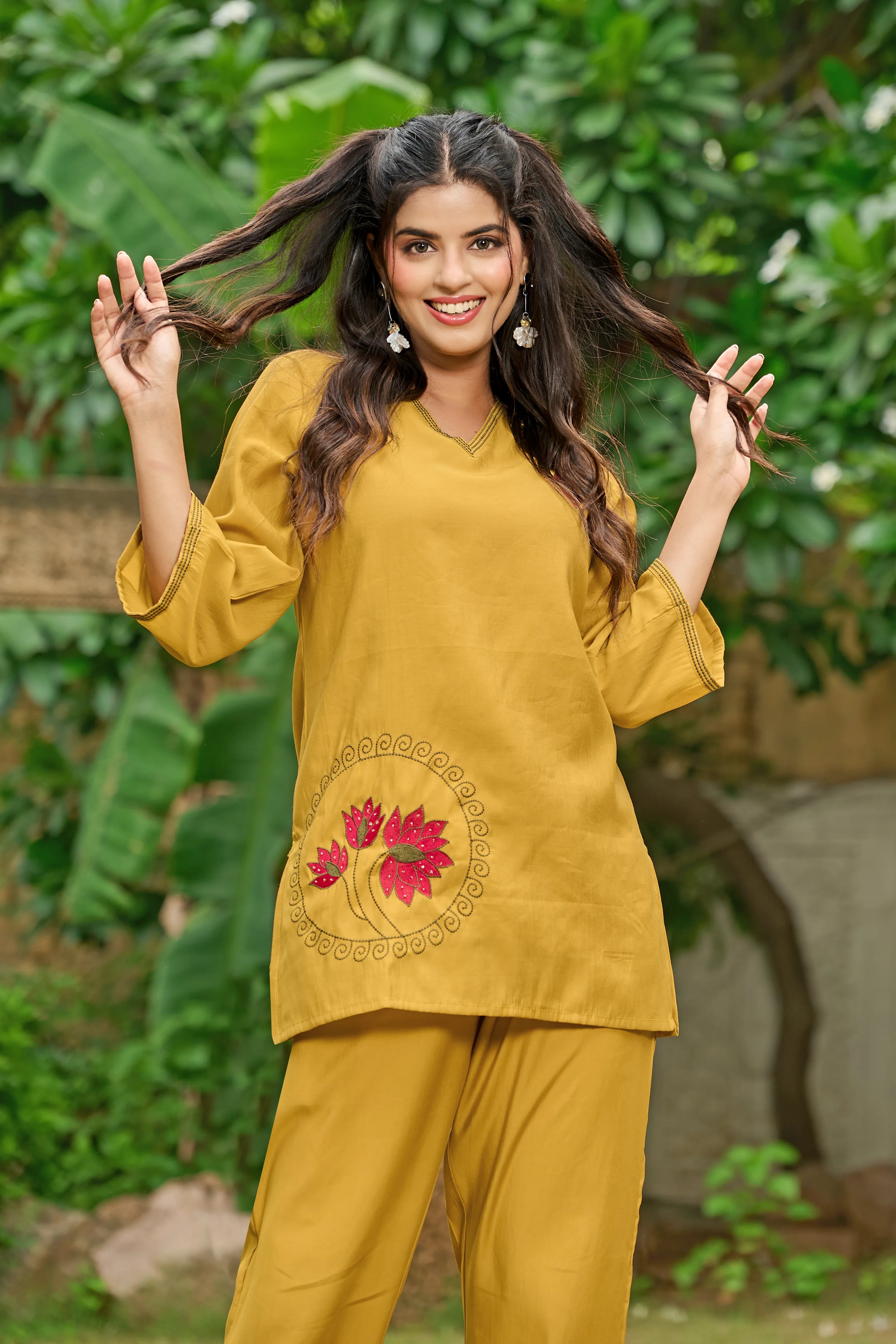A symbol of grace and serenity, Golden Bloom brings together tradition and elegance in a fresh mustard yellow hue. Crafted in luxe Roman silk, this co-ord set features a relaxed straight-cut kurta with dual-color lotus motif embroidery on the chest and hemline. The deep V-neckline and 3/4th sleeves add contemporary appeal, while the straight-leg pants complete the effortless silhouette.
