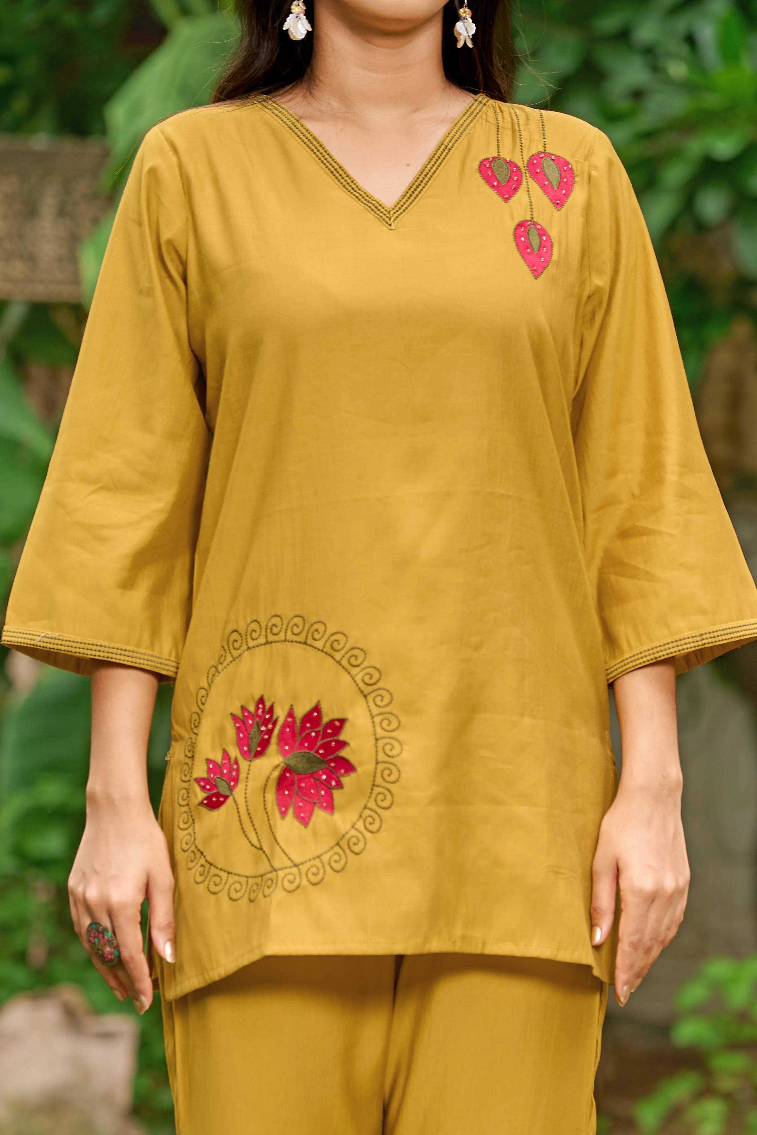 Color: Mustard yellow with red-pink lotus embroidery