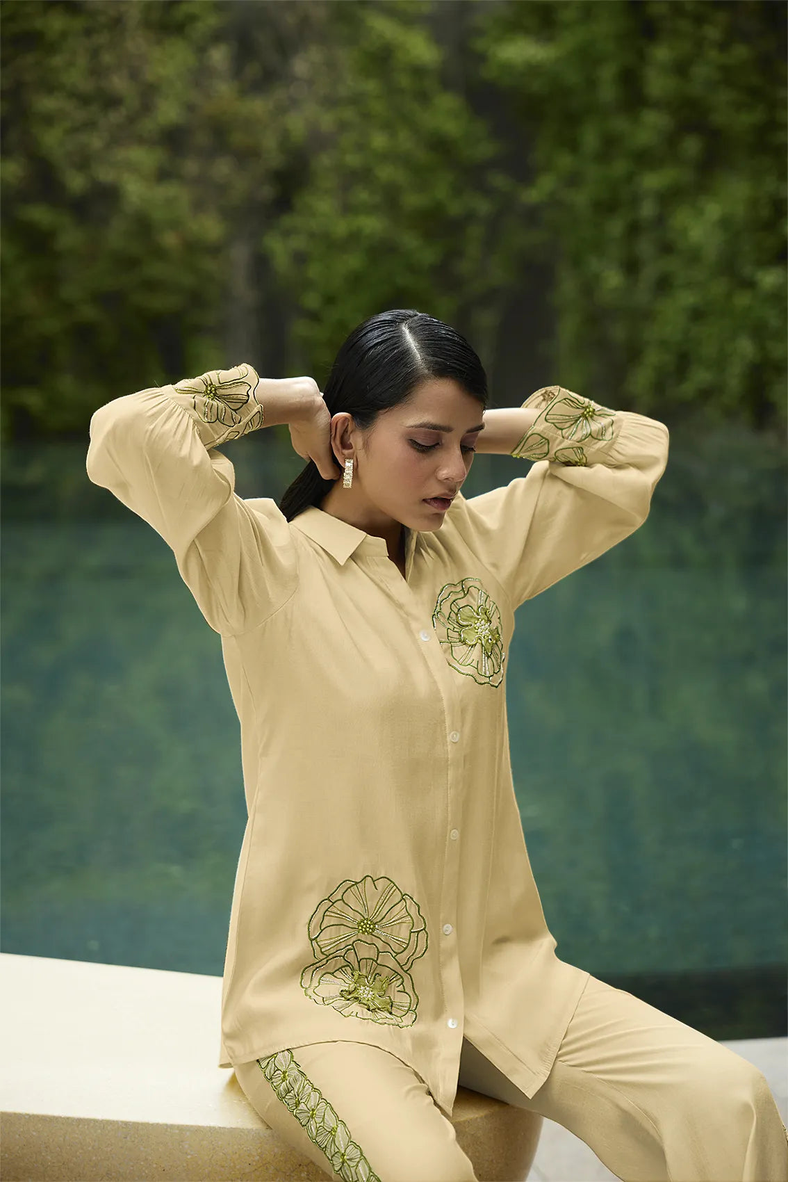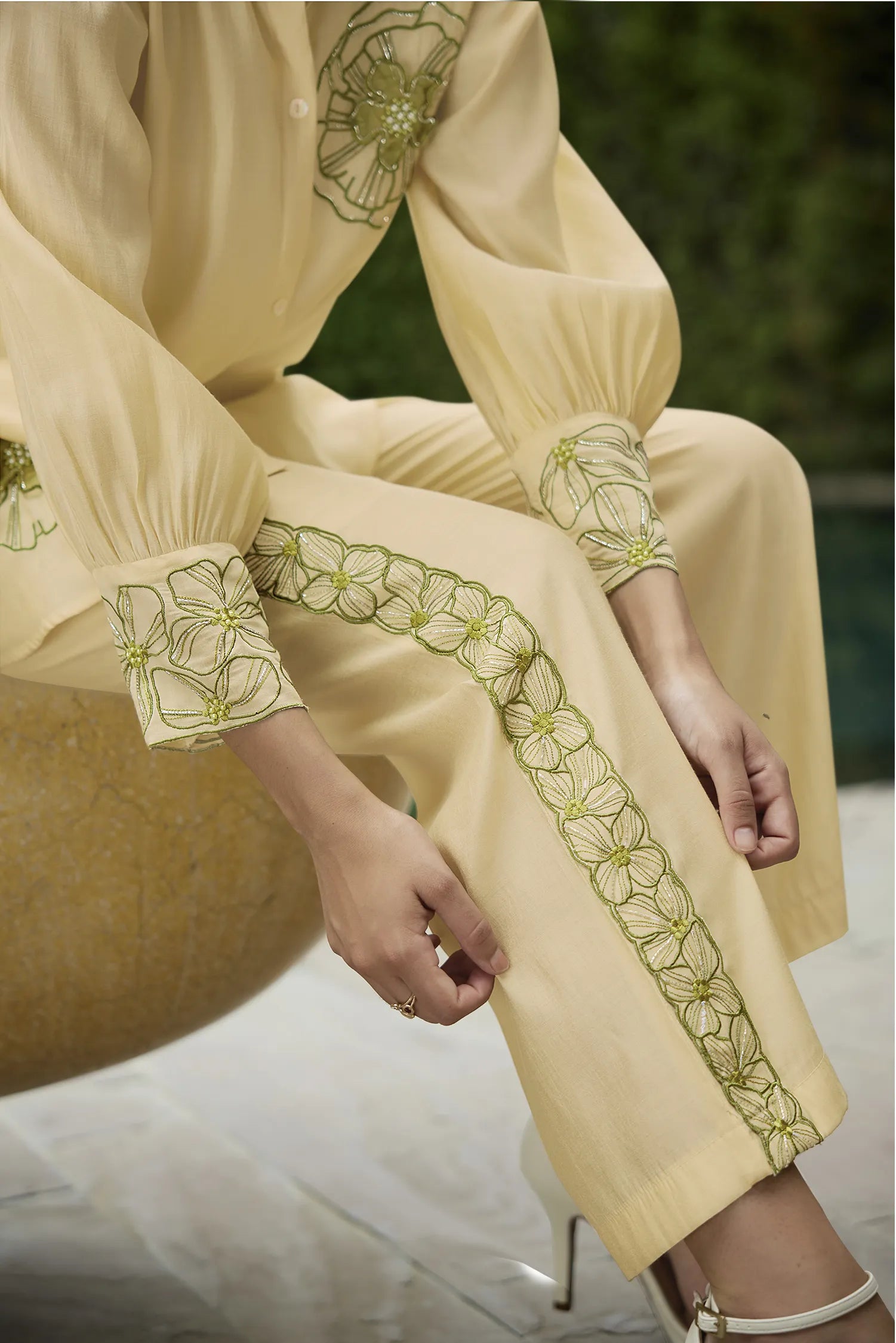 Bright and Elegant: Yellow Creme Embroidered Viscose Shirt with Pant