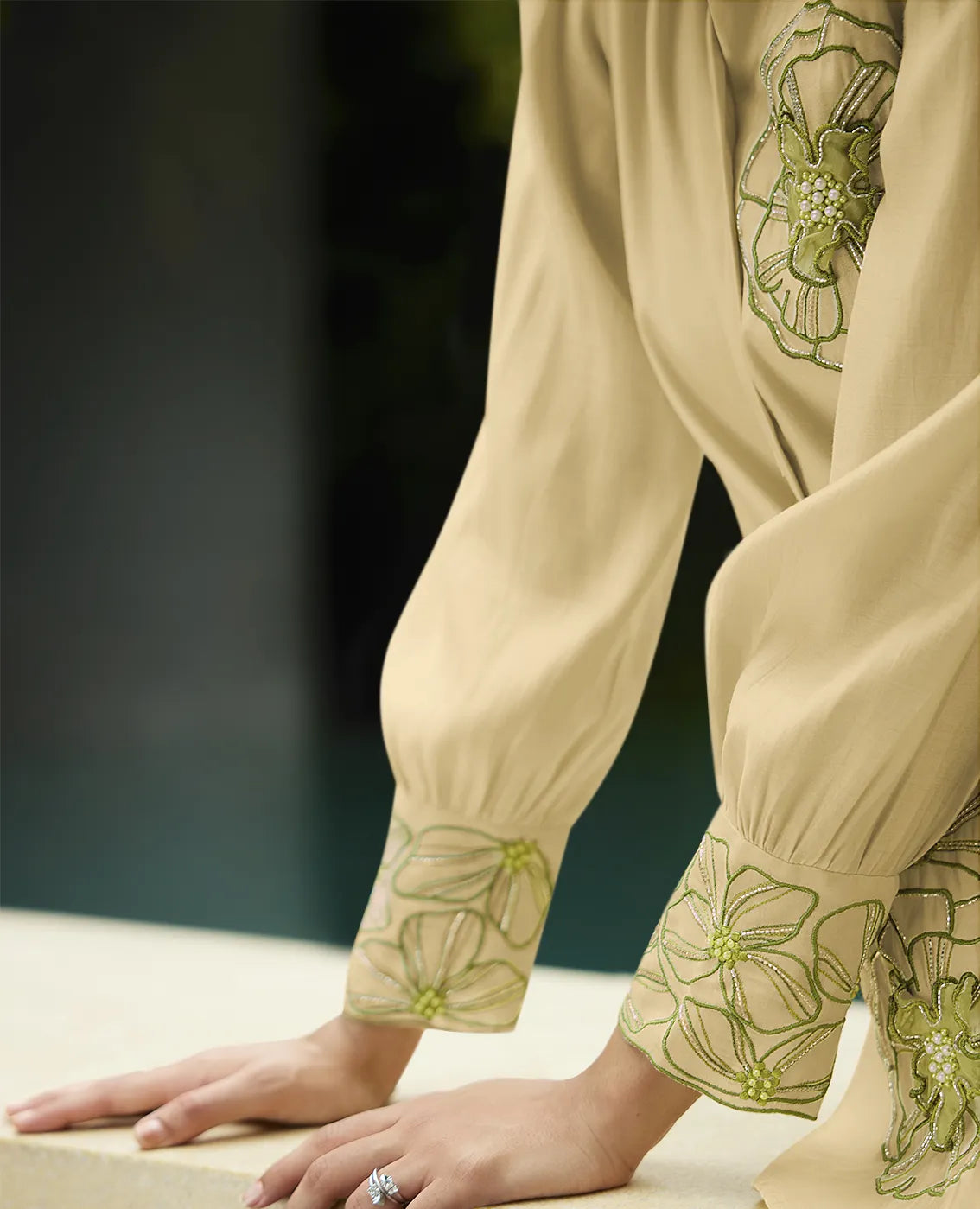 • Top Fabric: Viscose with delicate appliqué, embroidered puff sleeves, and embroidered cuffs