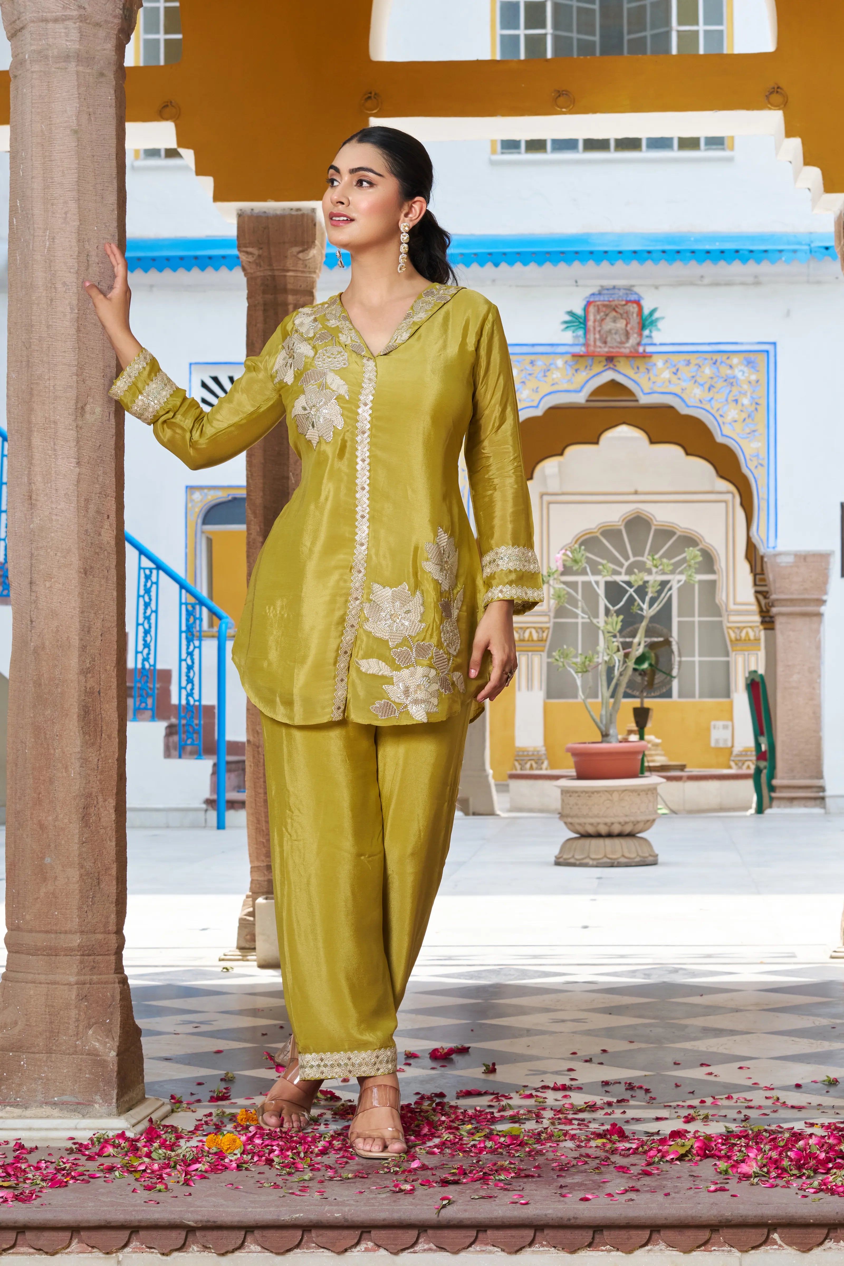 Golden Bloom: Yellow Floral Embroidered Chinon Co-ord Set
