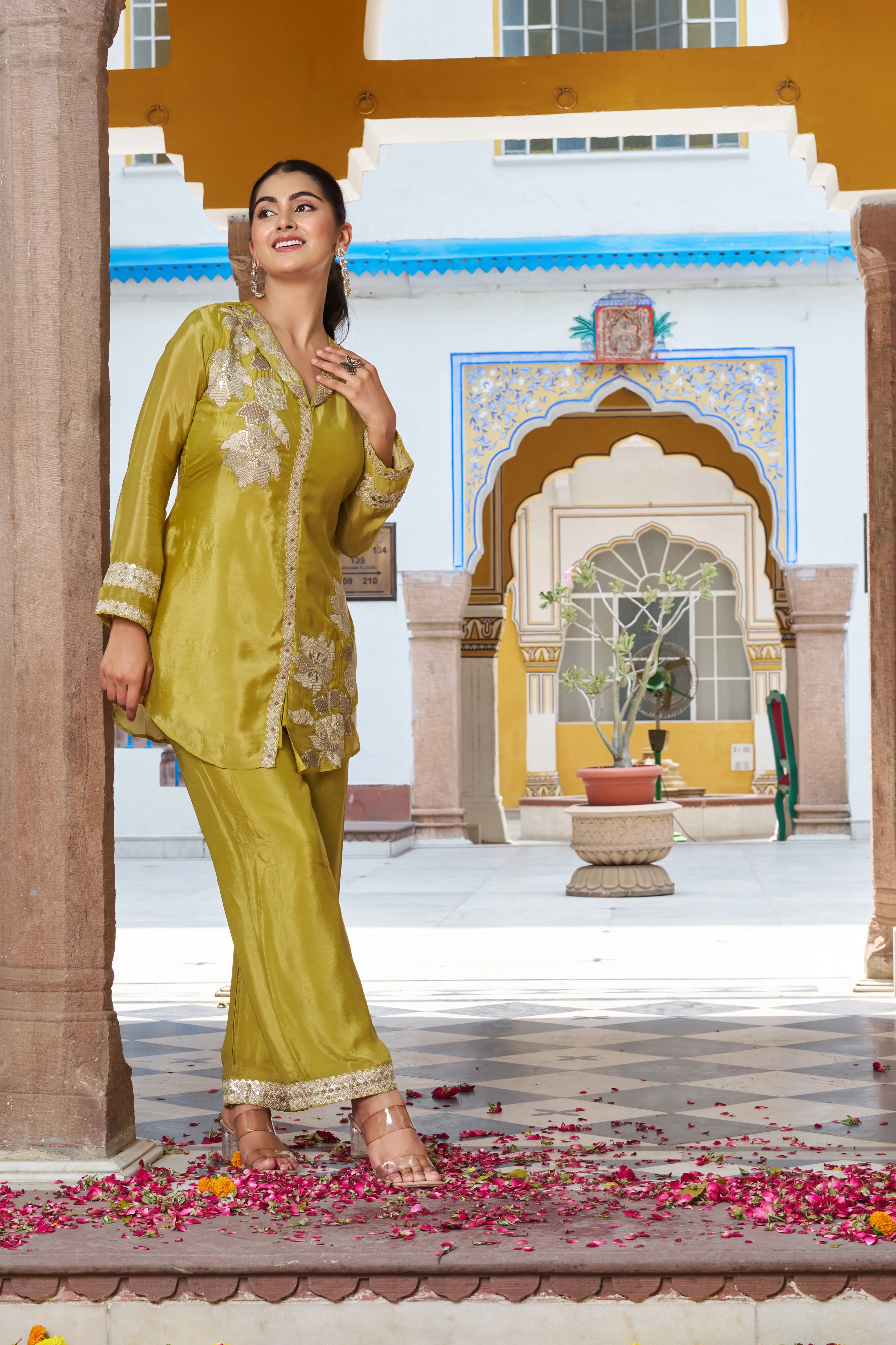 Embrace understated luxury with Golden Bloom, a radiant yellow co-ord set that fuses classic charm with festive finesse. Crafted in fluid chinon fabric, this ensemble shimmers subtly with antique gold threadwork and delicate sequin embroidery—perfect for those who like their celebrations refined yet radiant.