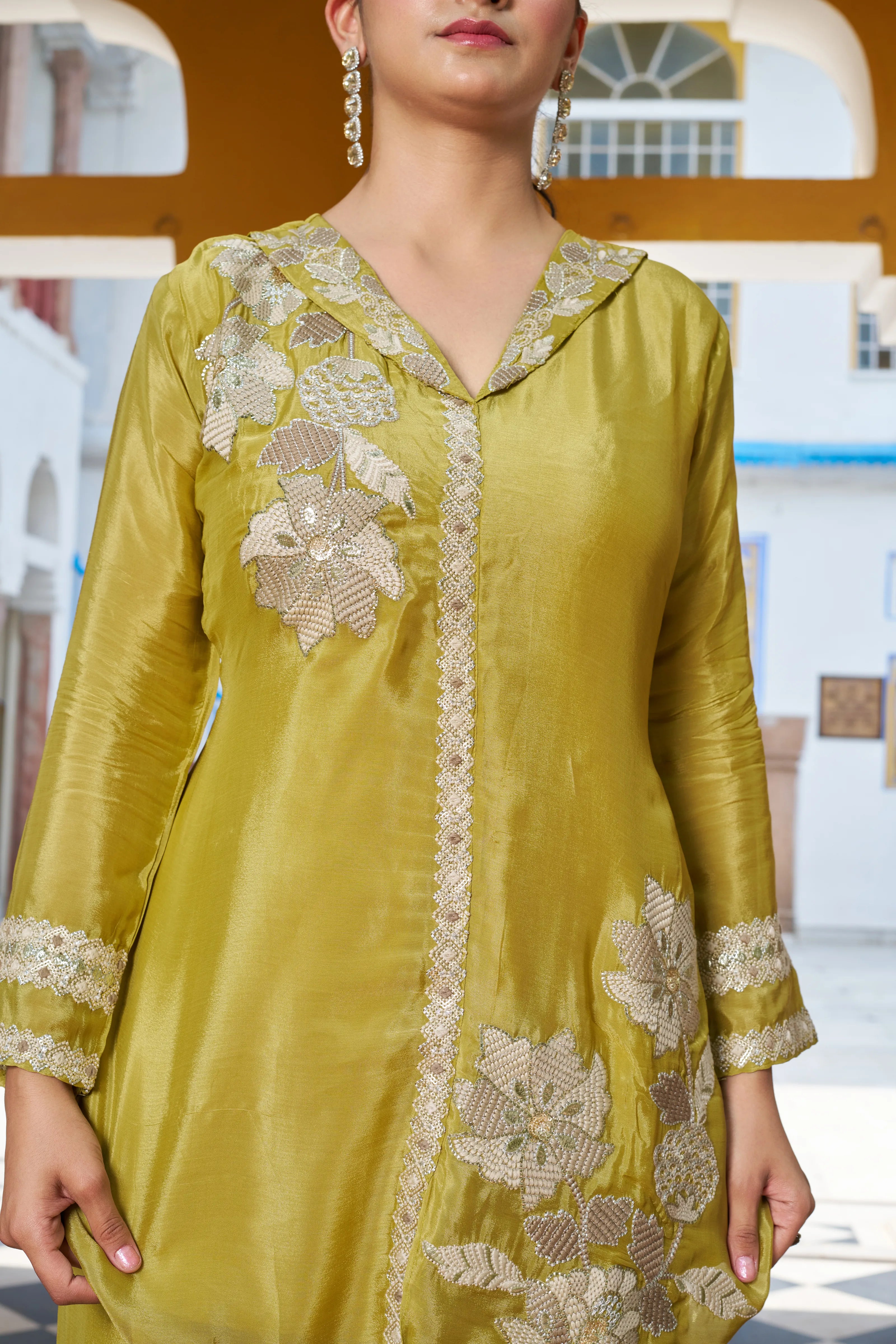 The full-sleeve kurta features graceful floral and leaf motifs placed asymmetrically along the front and sleeves, accentuated by a border of fine sequin lace. The V-neckline and soft silhouette lend a graceful fall to the kurta. Paired with straight pants detailed with matching lace at the hem, this set is effortlessly elegant.