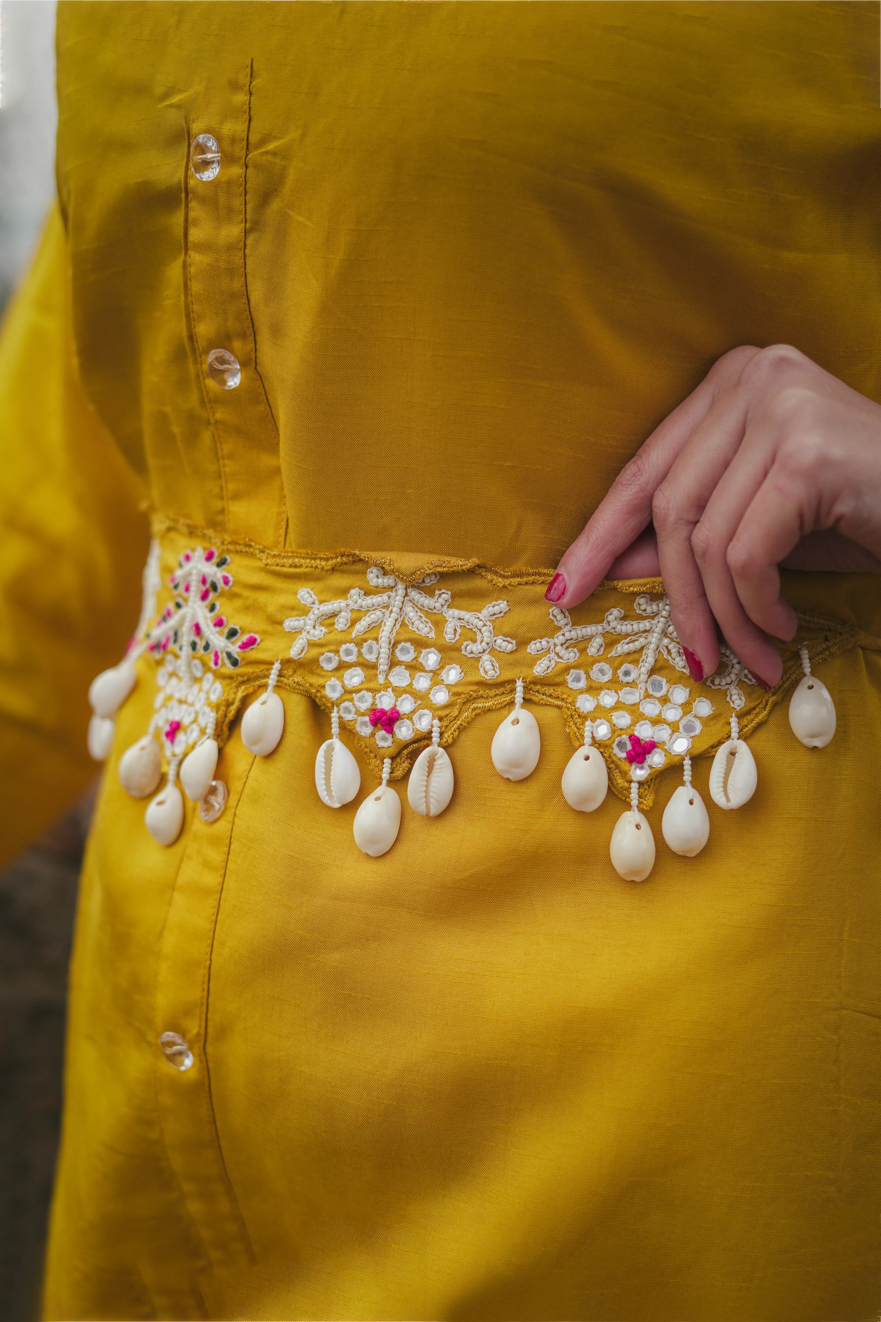 The Yellow Embroidered Dola Silk Co-Ord Set brings a vibrant and luxurious touch to your wardrobe. Crafted from premium Dola Silk, this set features exquisite seashell embroidery, a unique tassel belt, and intricate collar work. The design is completed with elegant 3/4th sleeves, offering a perfect blend of sophistication and comfort. Ideal for casual or semi-formal occasions, this ensemble radiates warmth and style.