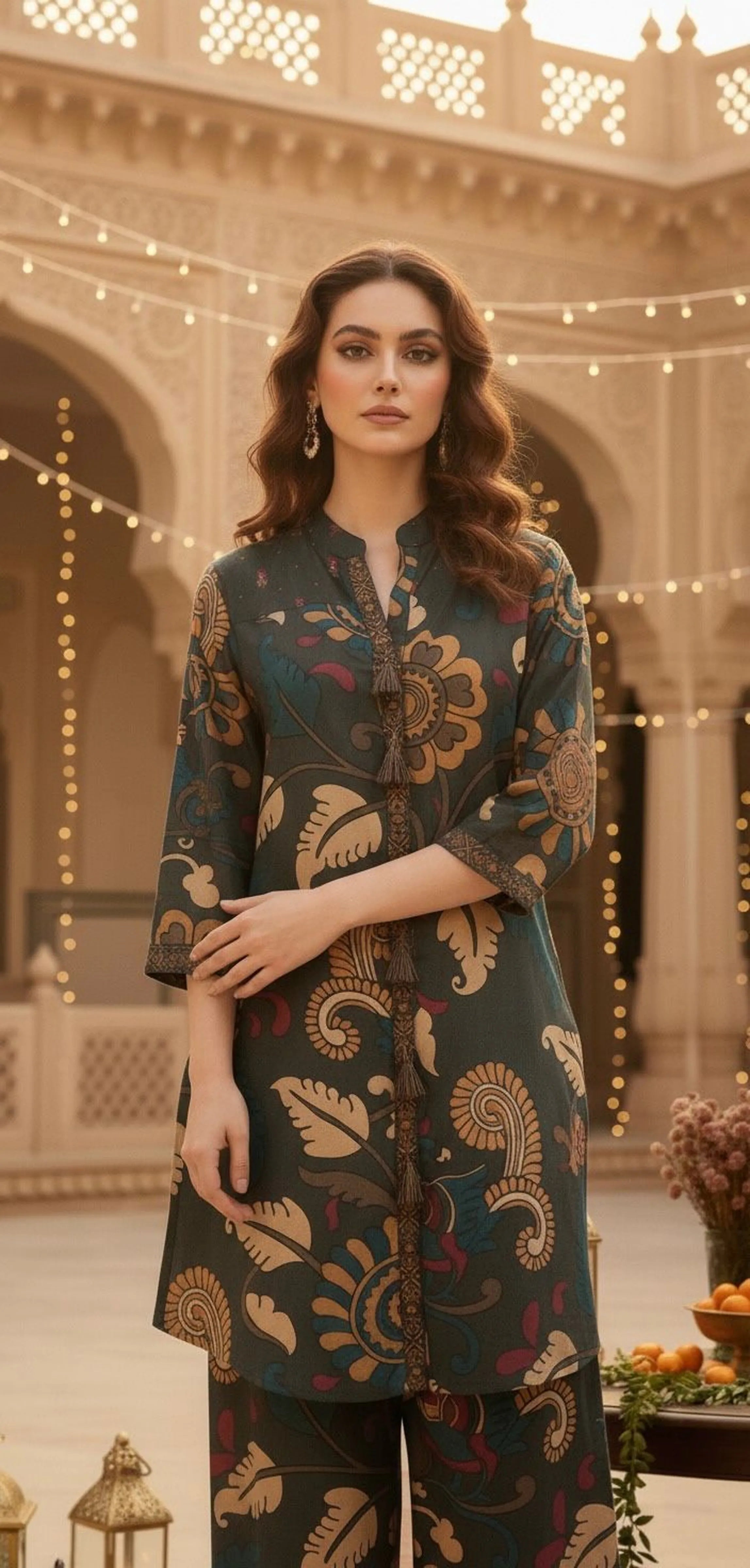 Khaki Brown, Black & Cream High-Low Co-ord Set with Metallic Tikli Embellishment