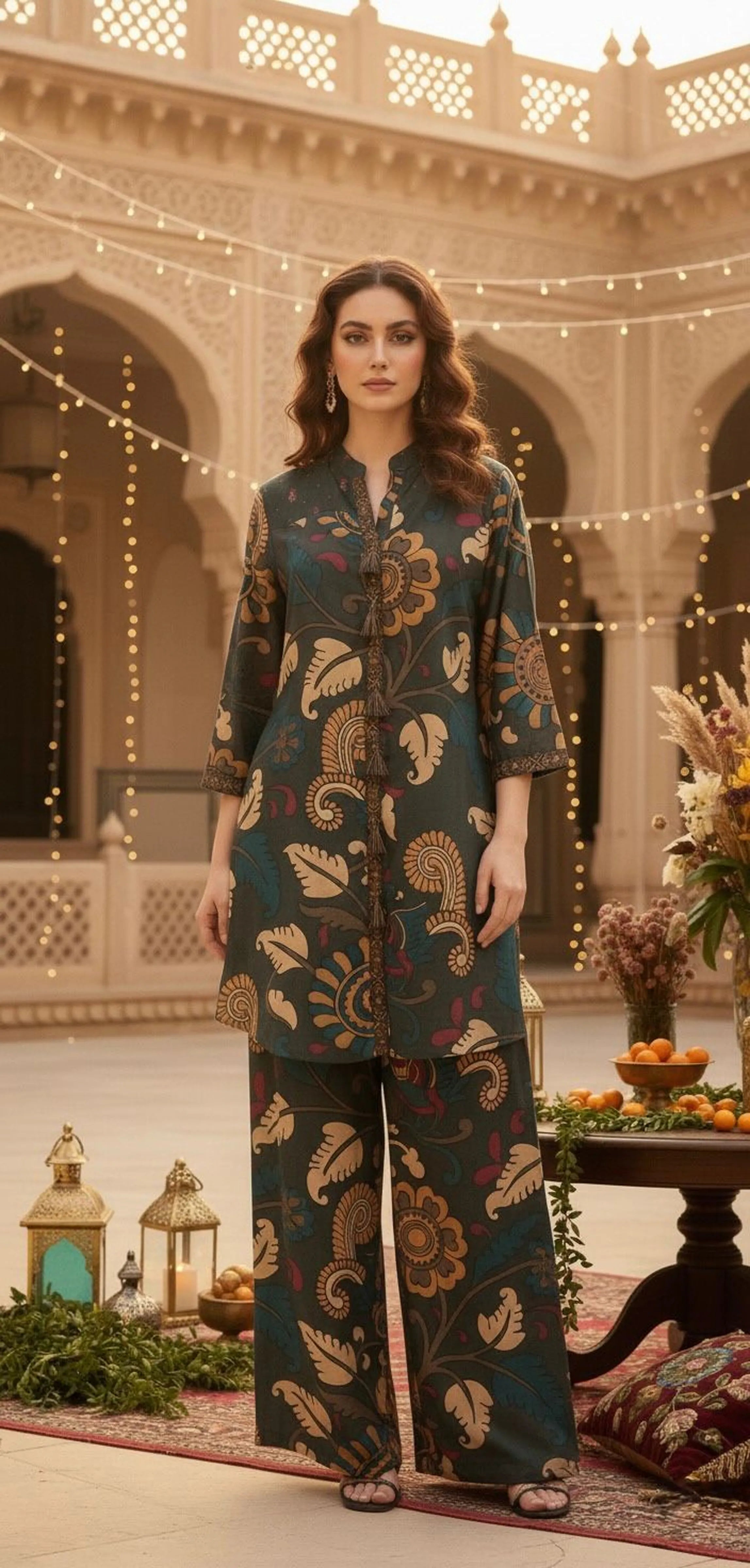 Peacock Blue With Village Story Print Embroidered Crepe Co-ord Set