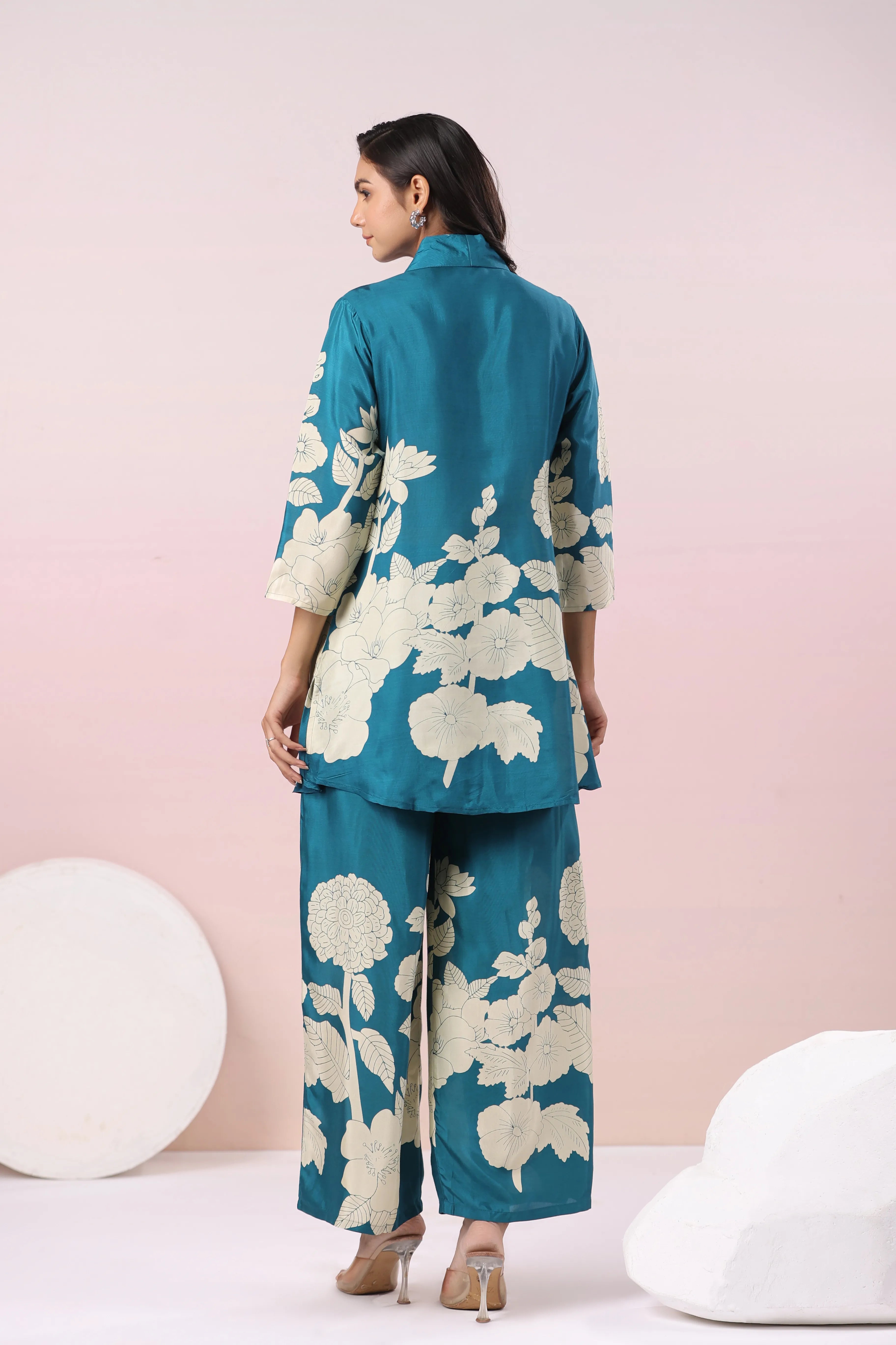 Teal Blue Bold Palm Russian Silk Print Co-Ord Set