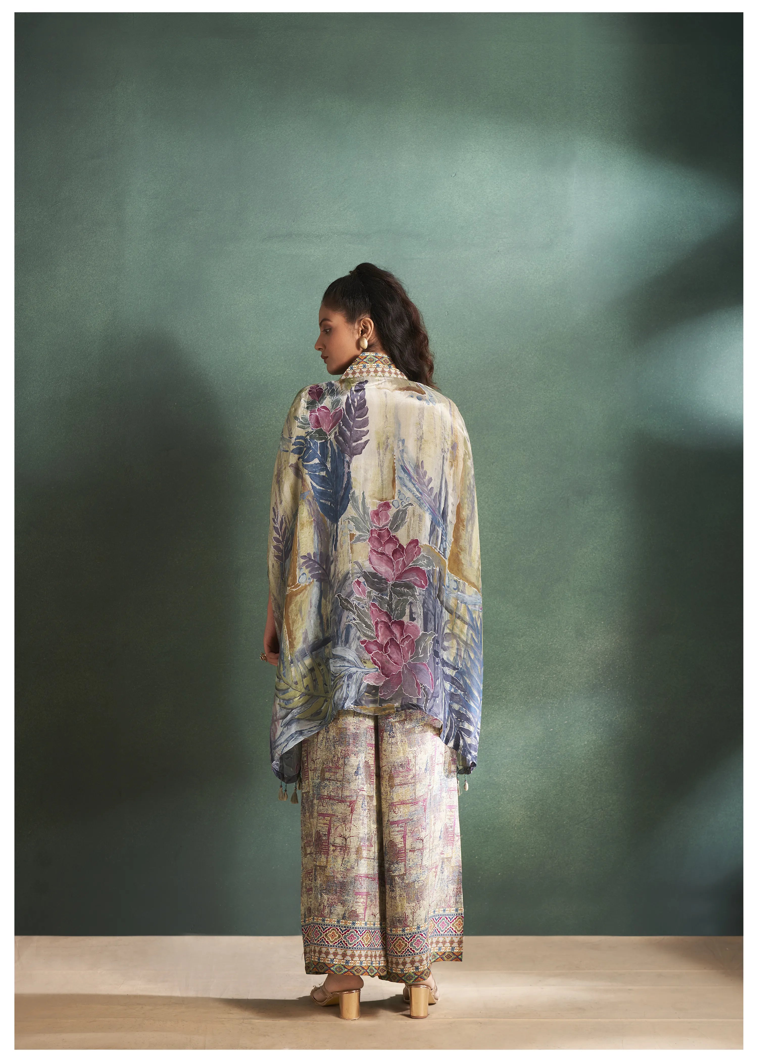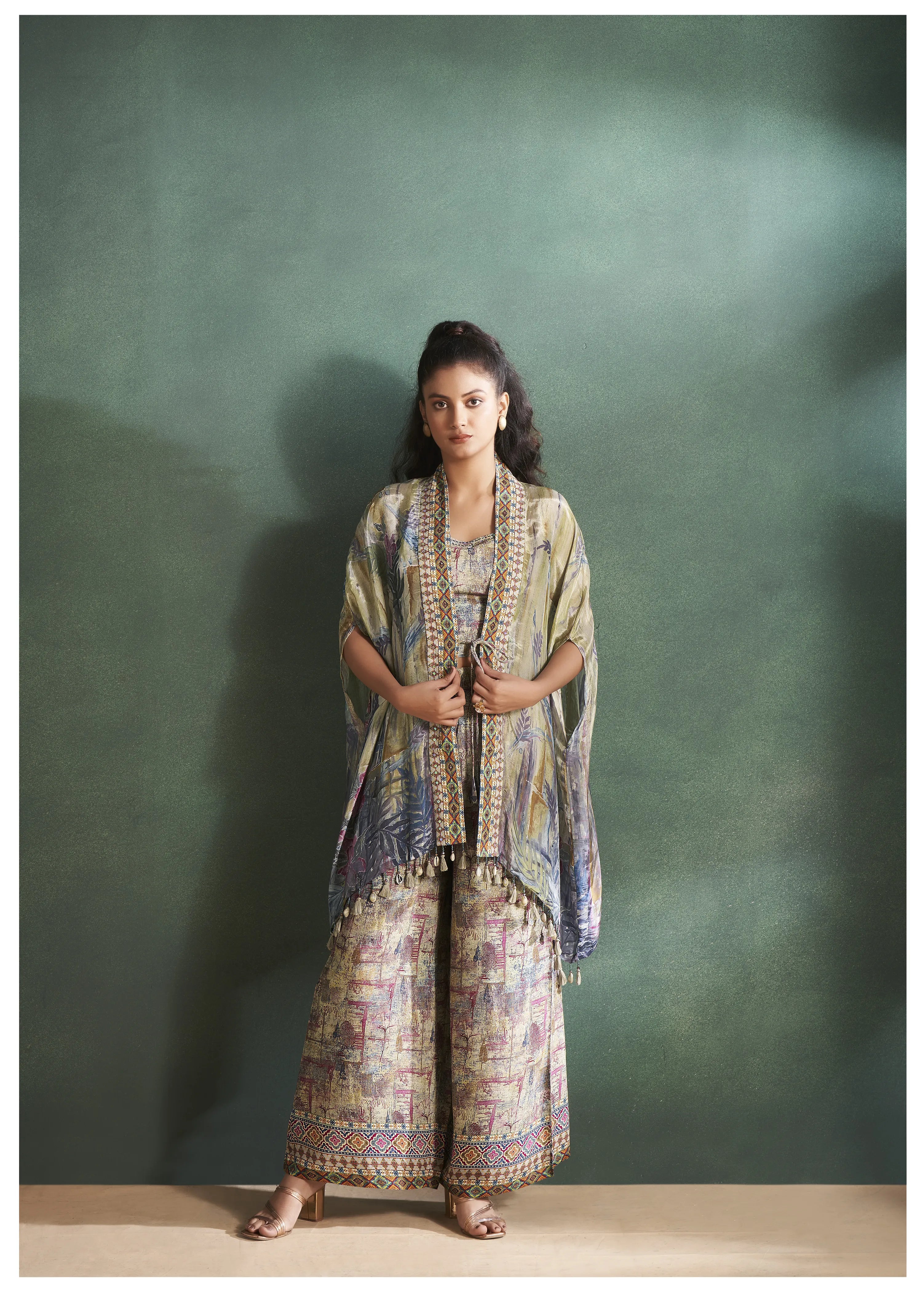 Olive Green Floral Muslin Cowrie-Detailed Shrug 3-Piece Set
