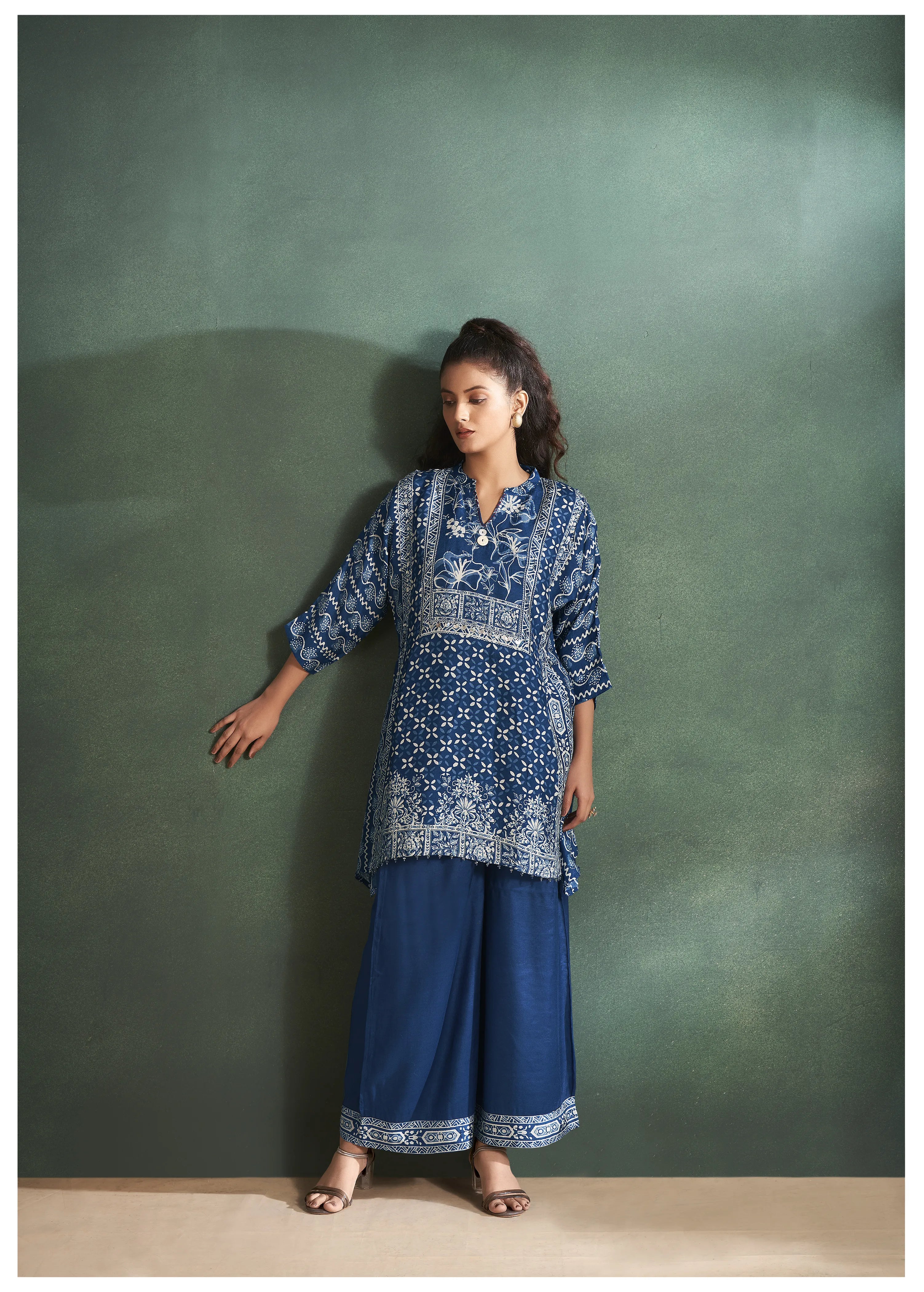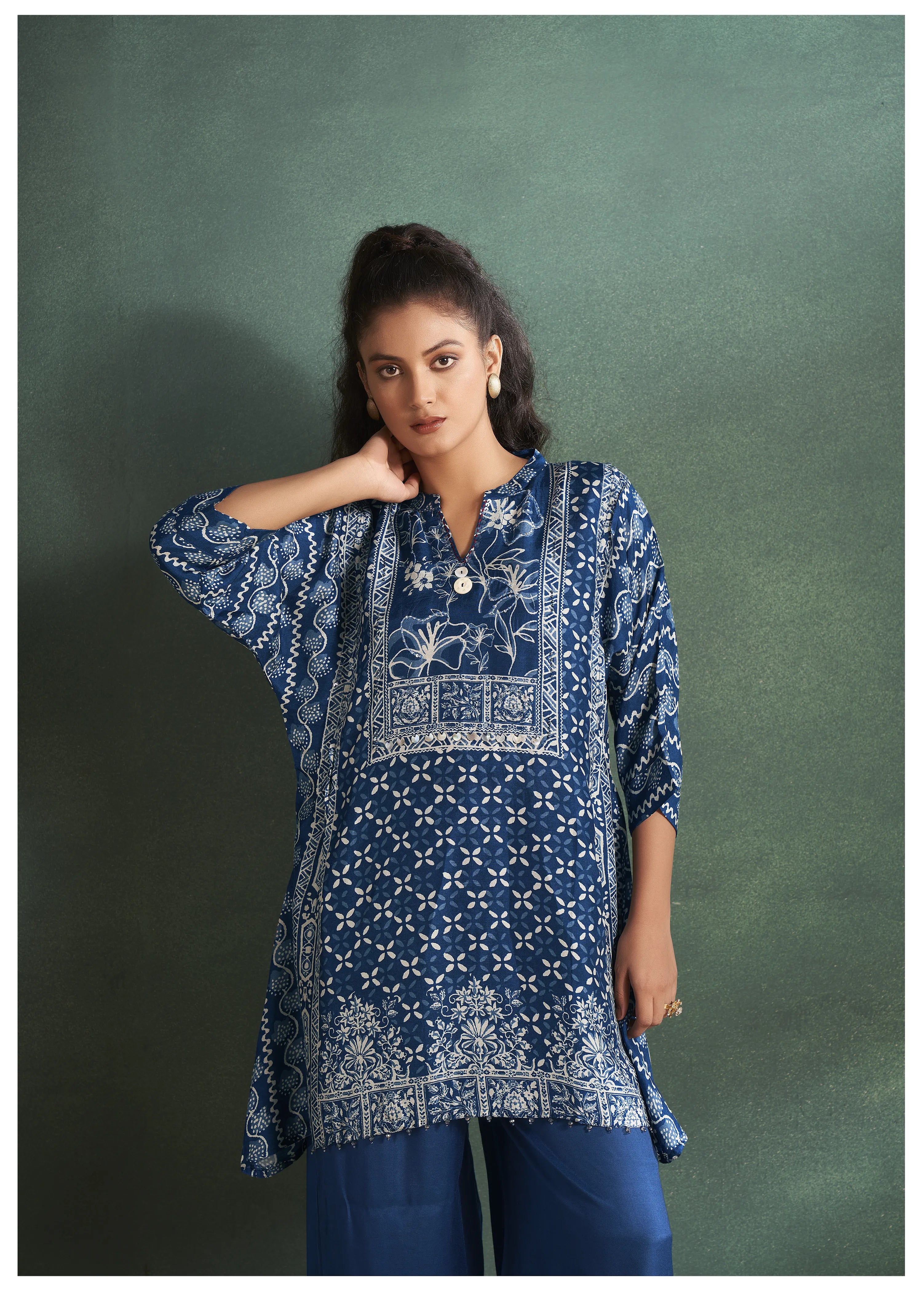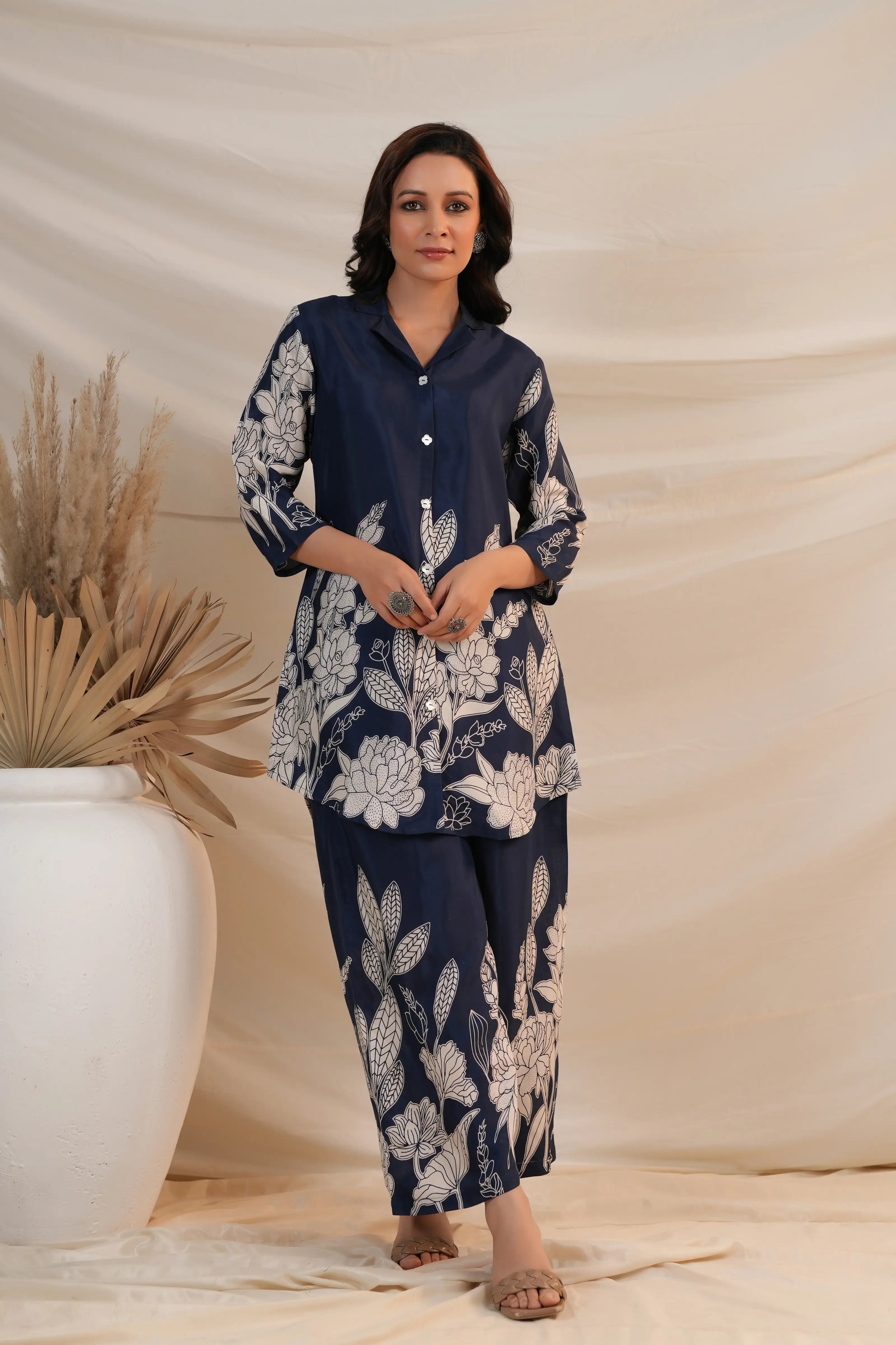 Royal Blue Floral Printed Russian Silk Co-Ord Set with Shell Button Embellishments