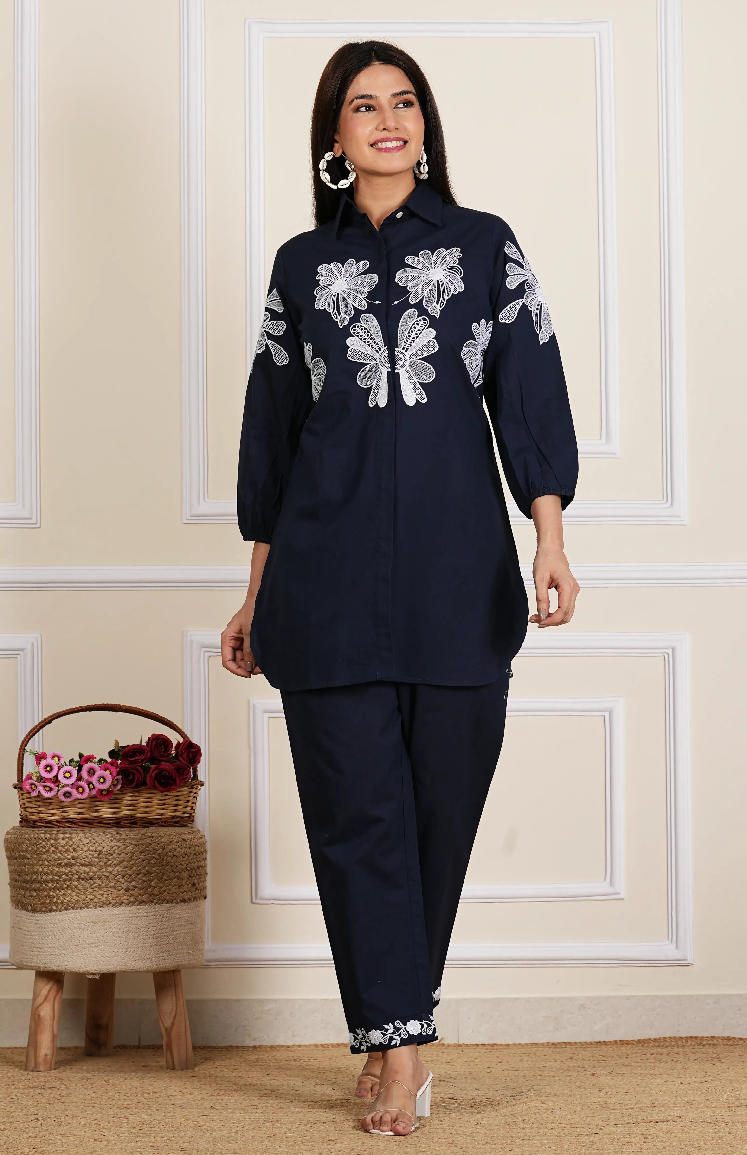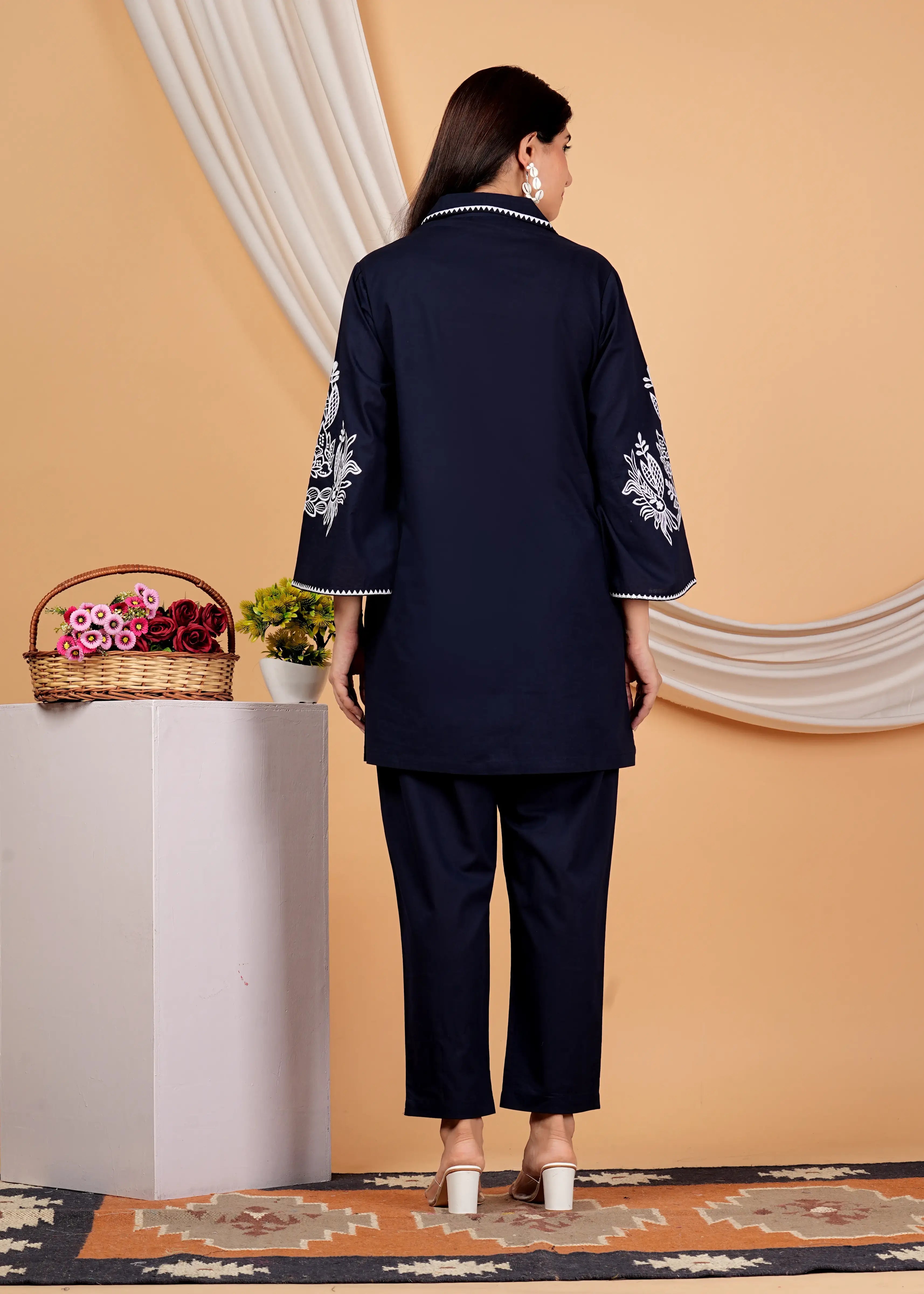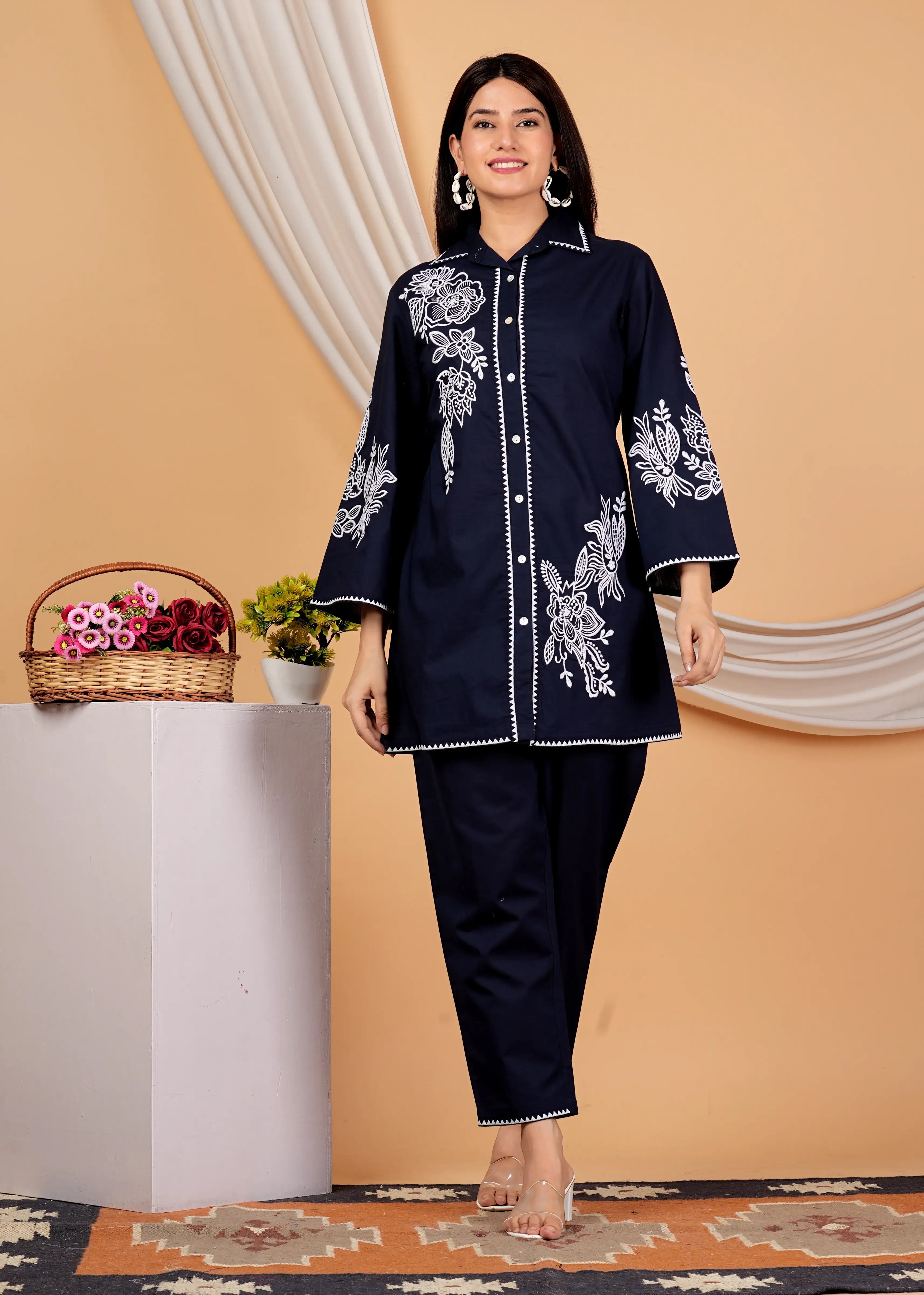 Navy Blue & White Embroidered Cotton Co-Ord set