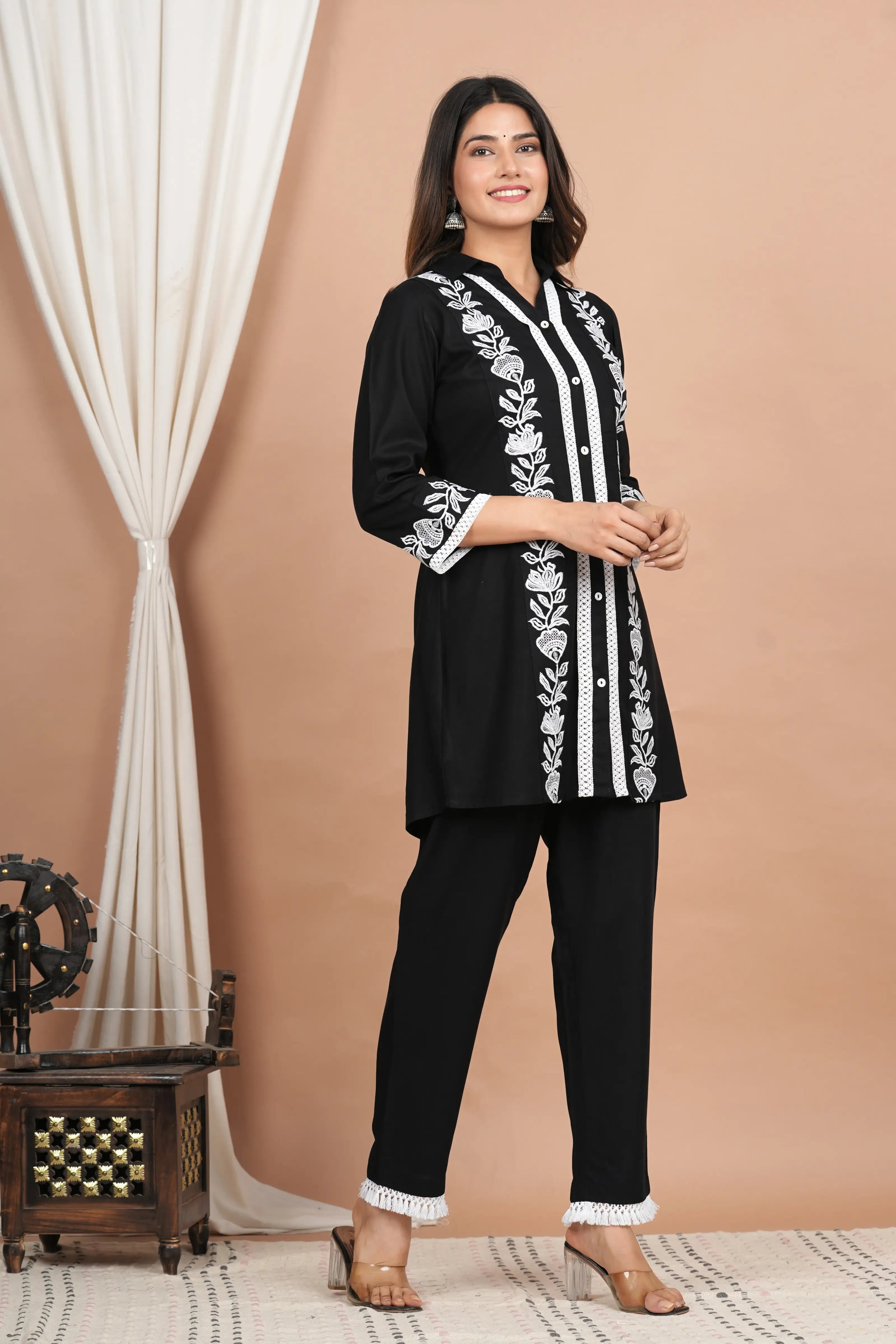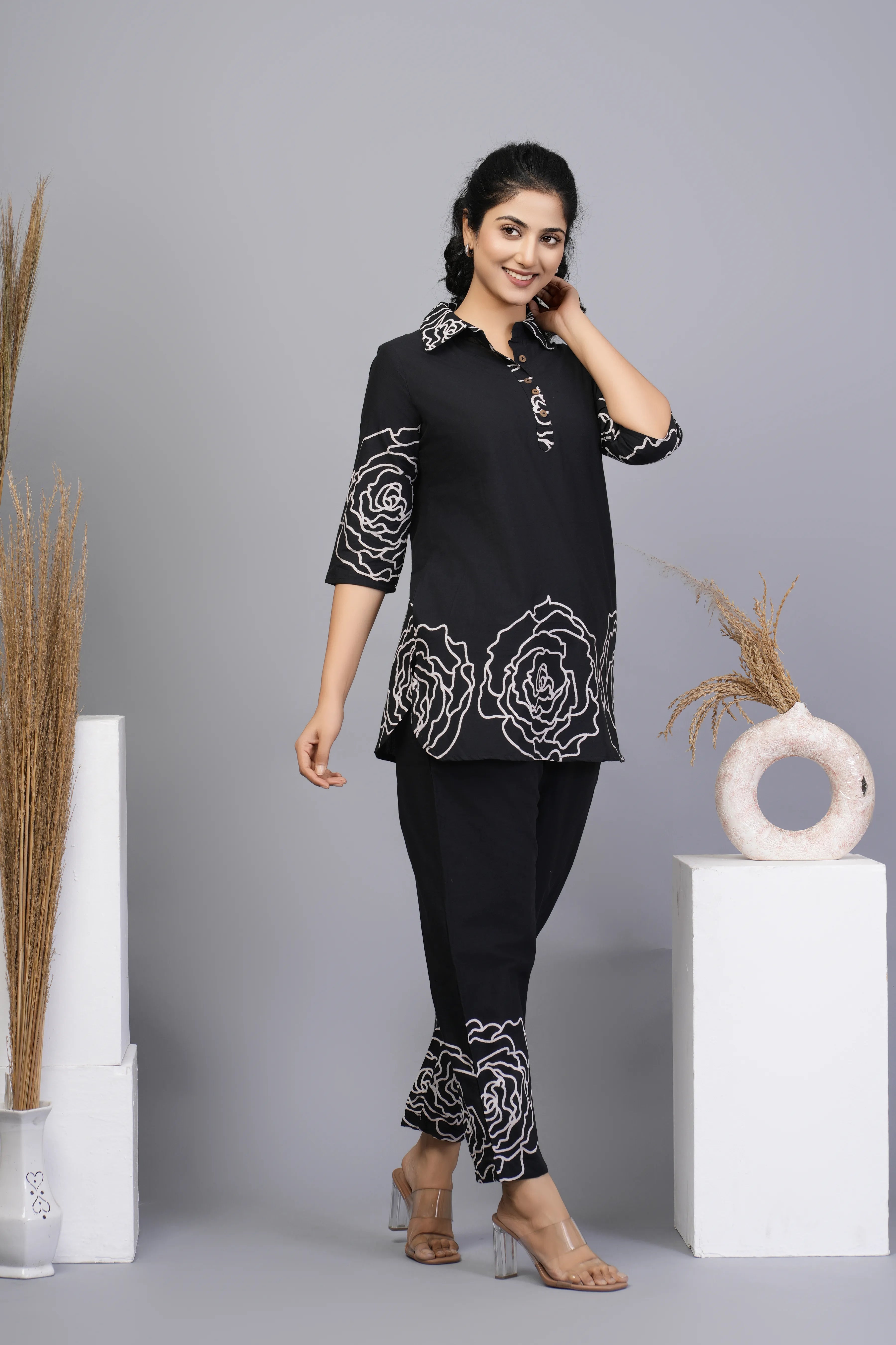 Black Floral Embroidered Cotton Co-Ord Set