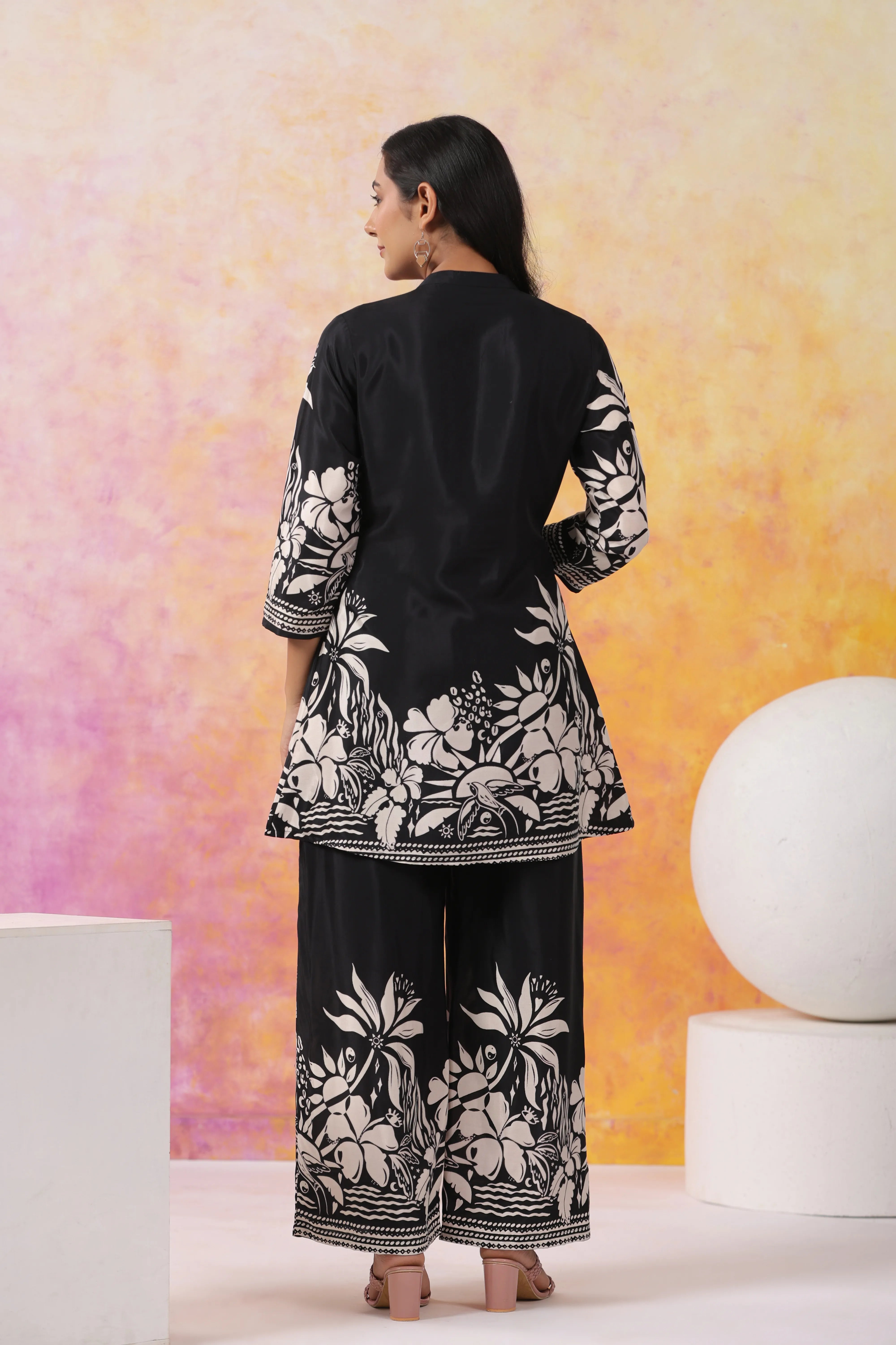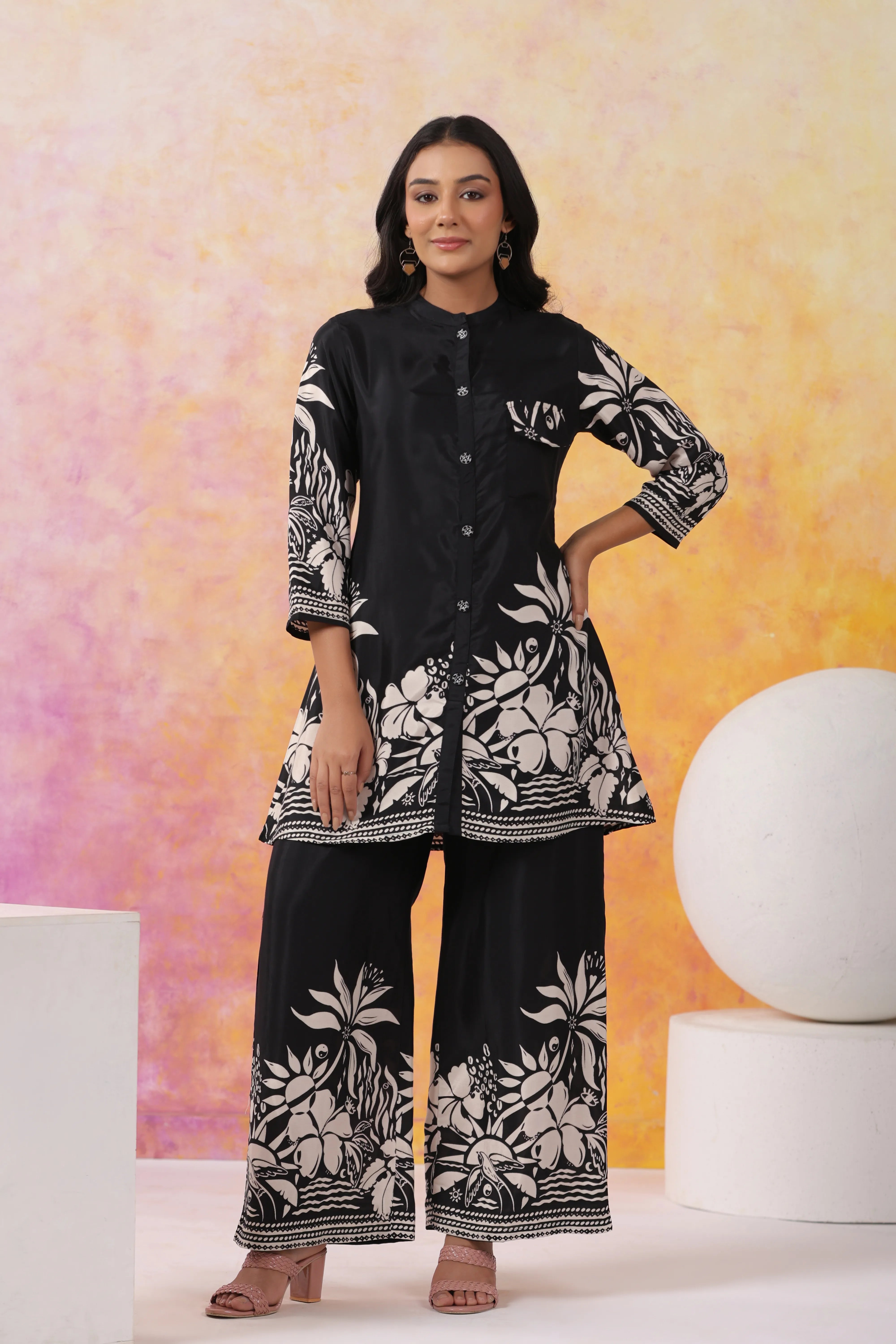 Black Floral Printed Russian Silk Co-Ord Set