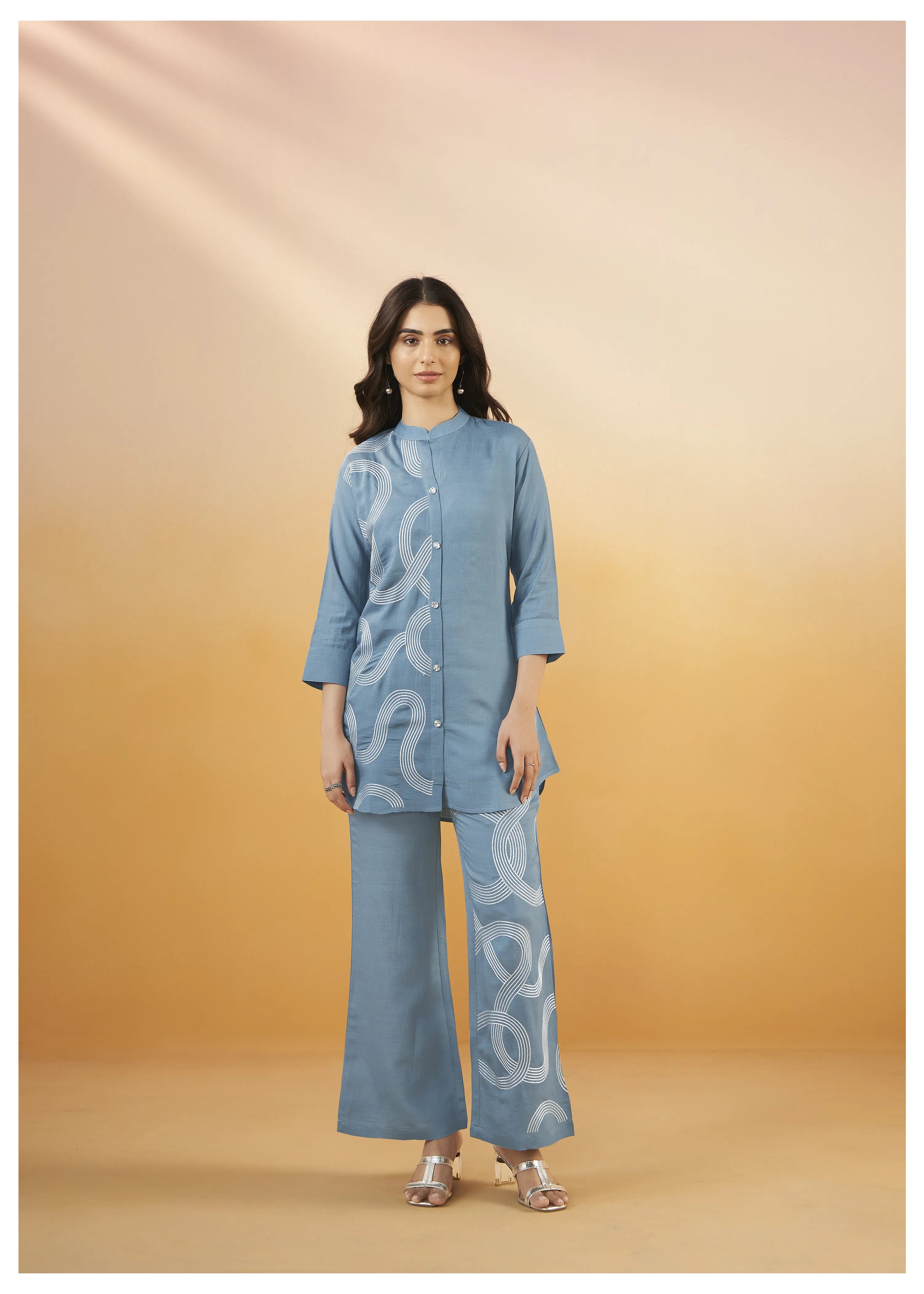 Powder Blue Base White Thread Embroidered Viscose Silk Co-Ord Set