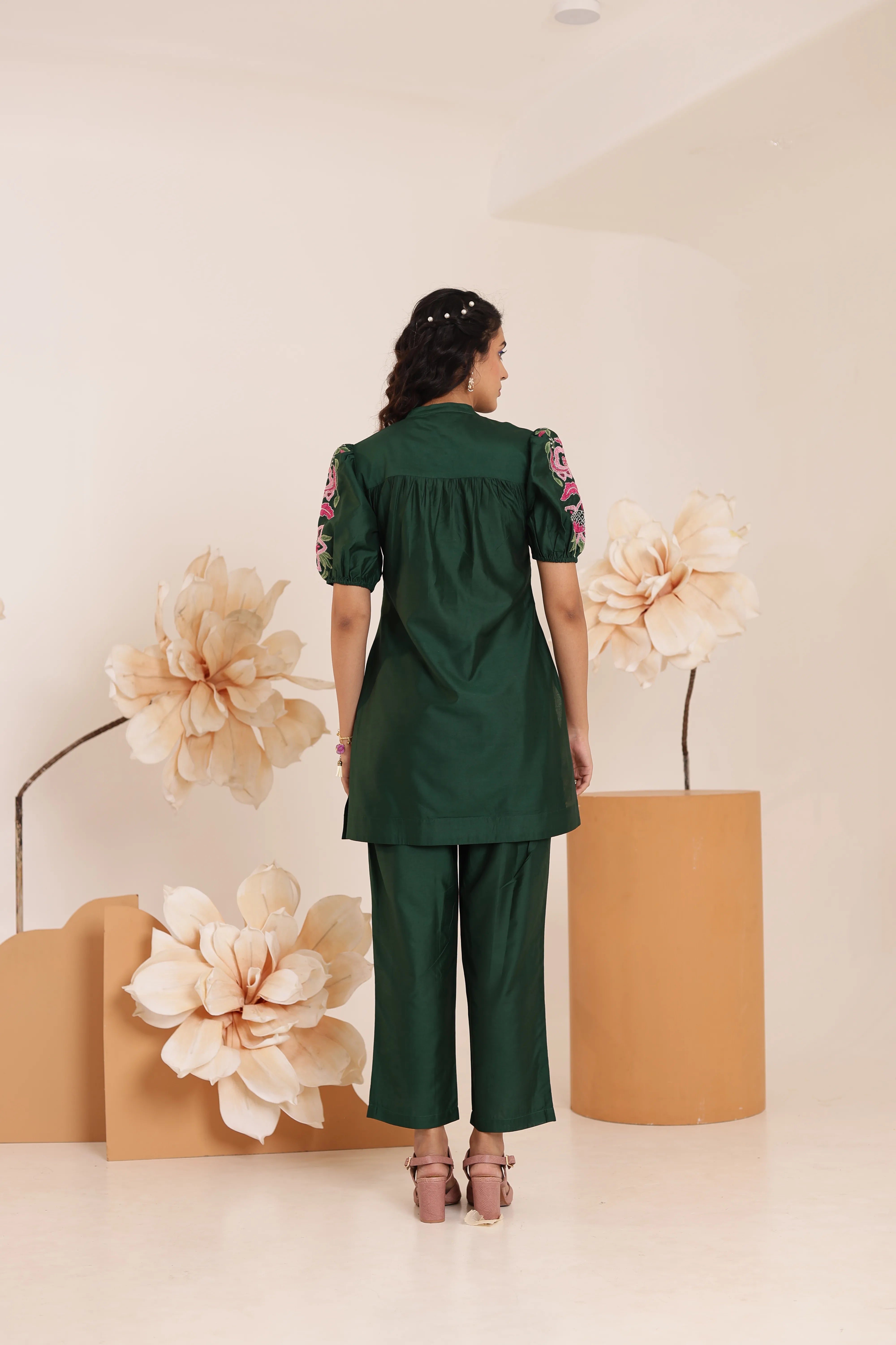 Bottle Green Cotton Modal Placement Embroidered Patch Co-Ord Set