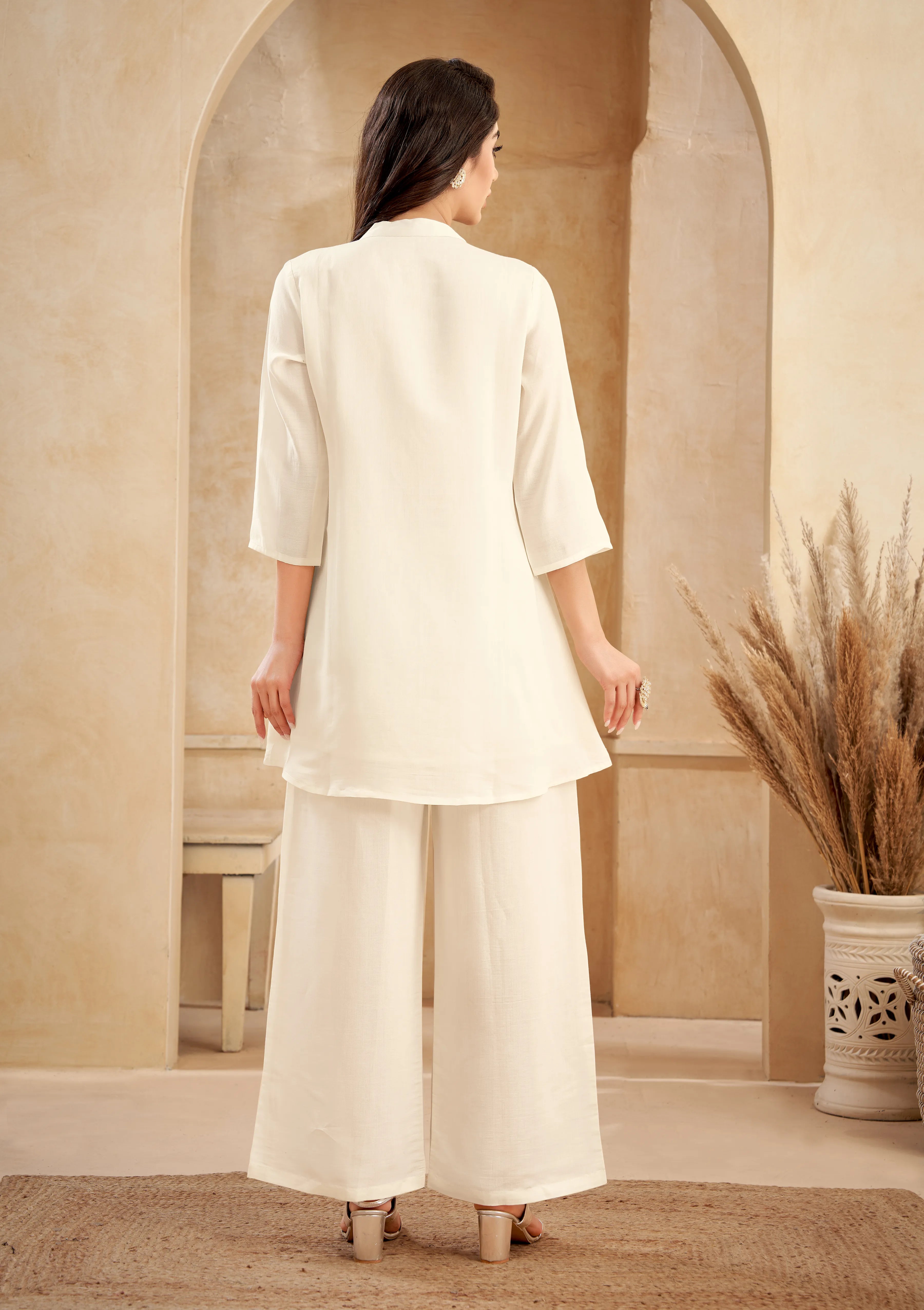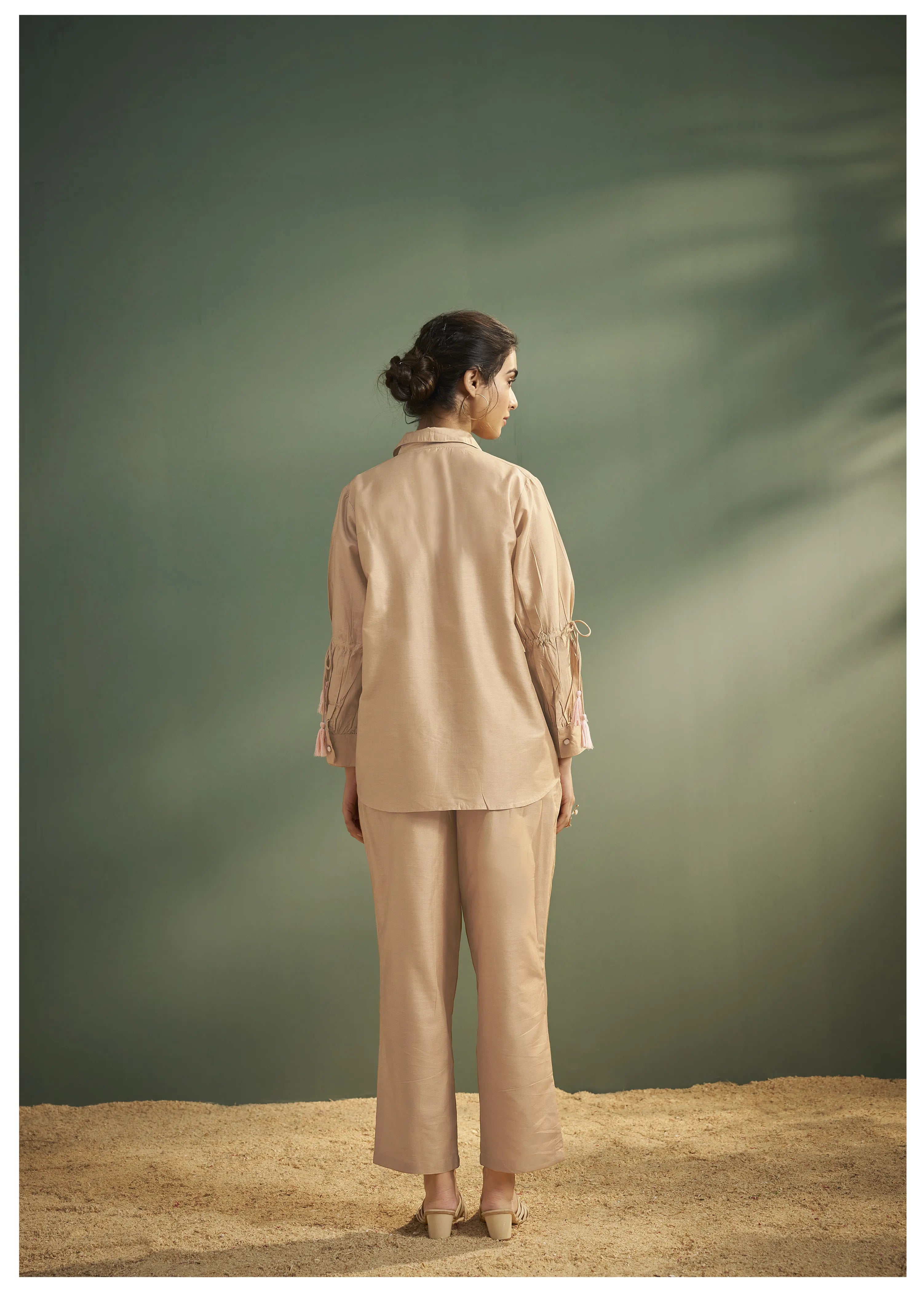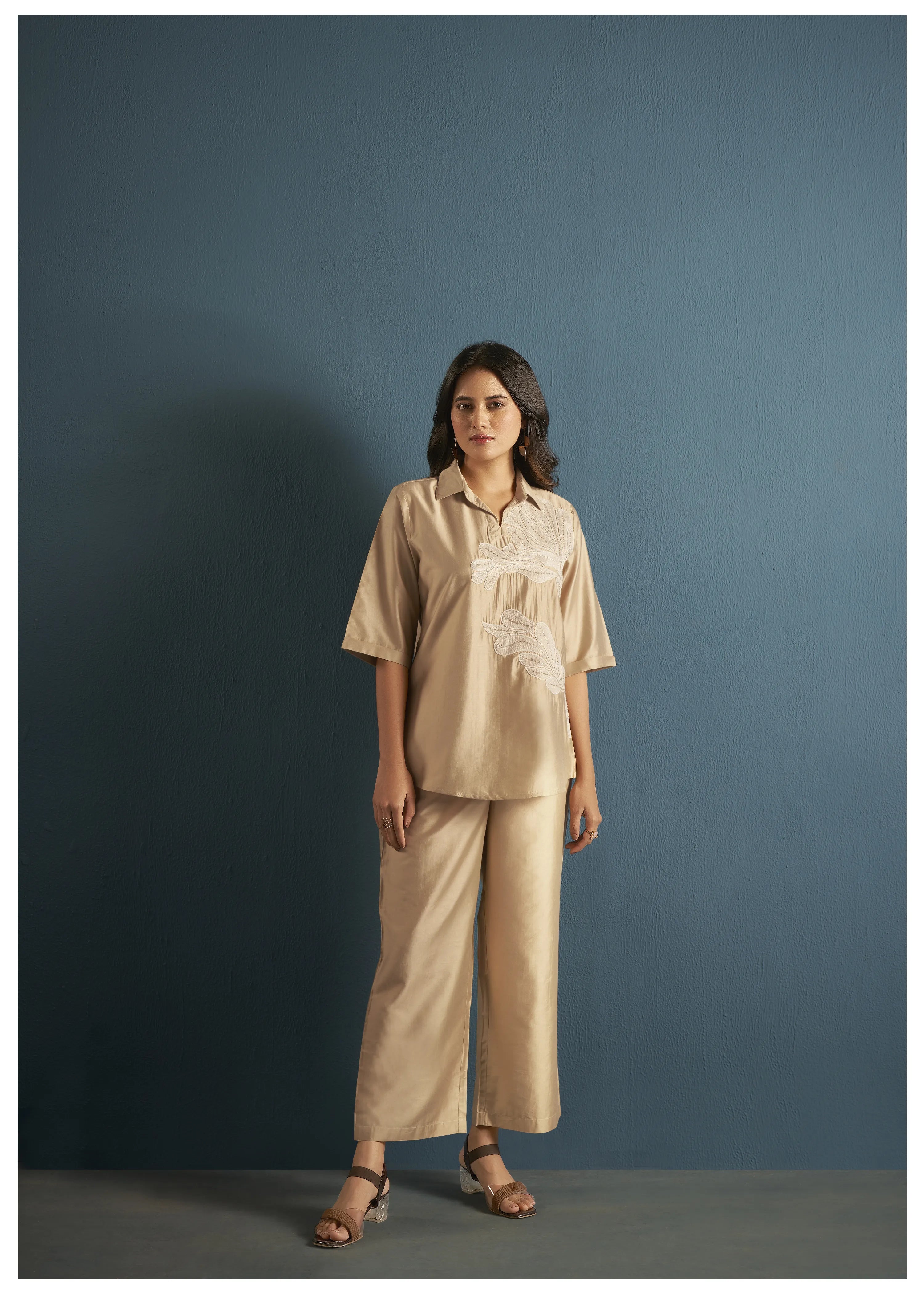 Beige Embroidery With Embellishments Collar Co-ord Set