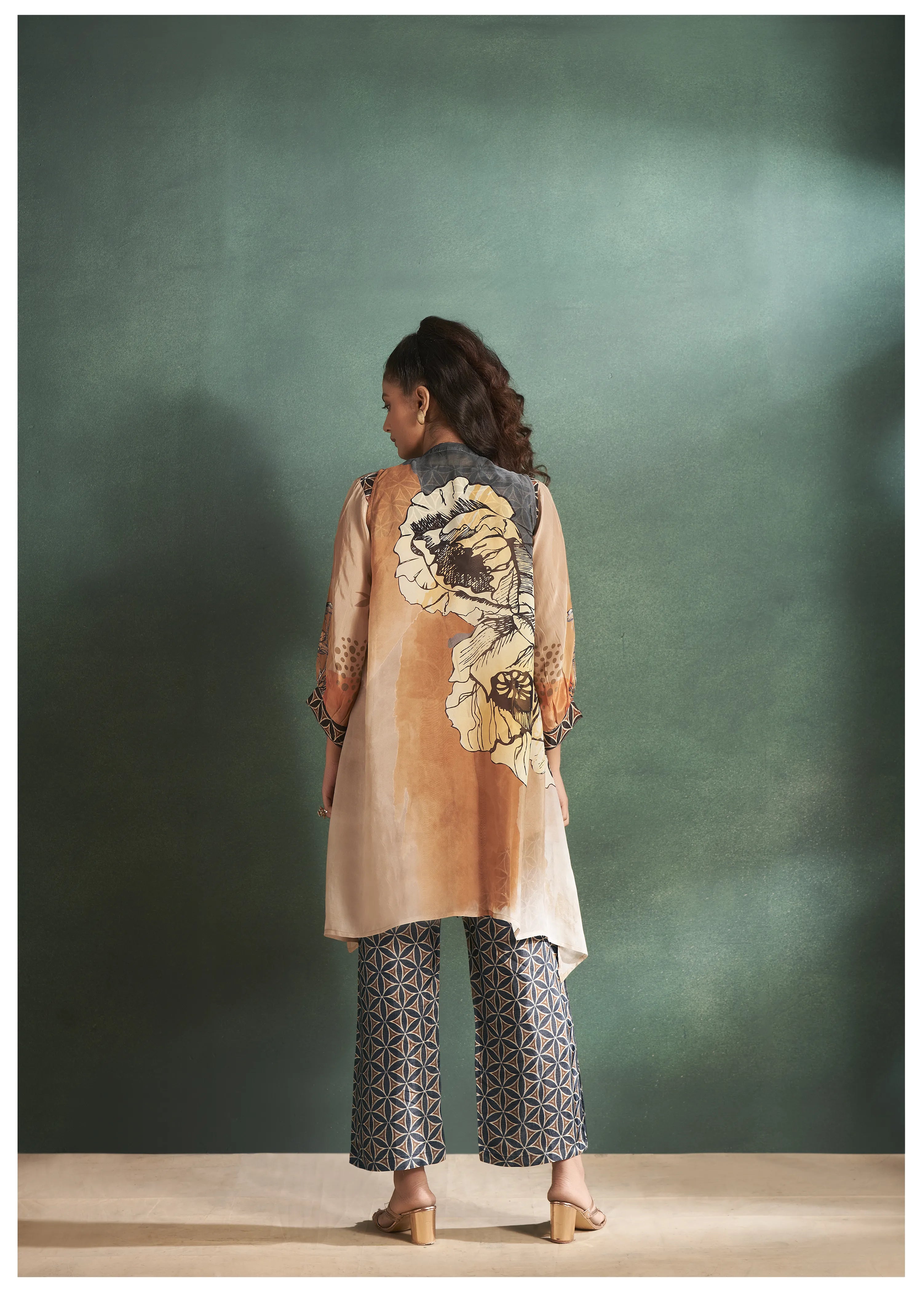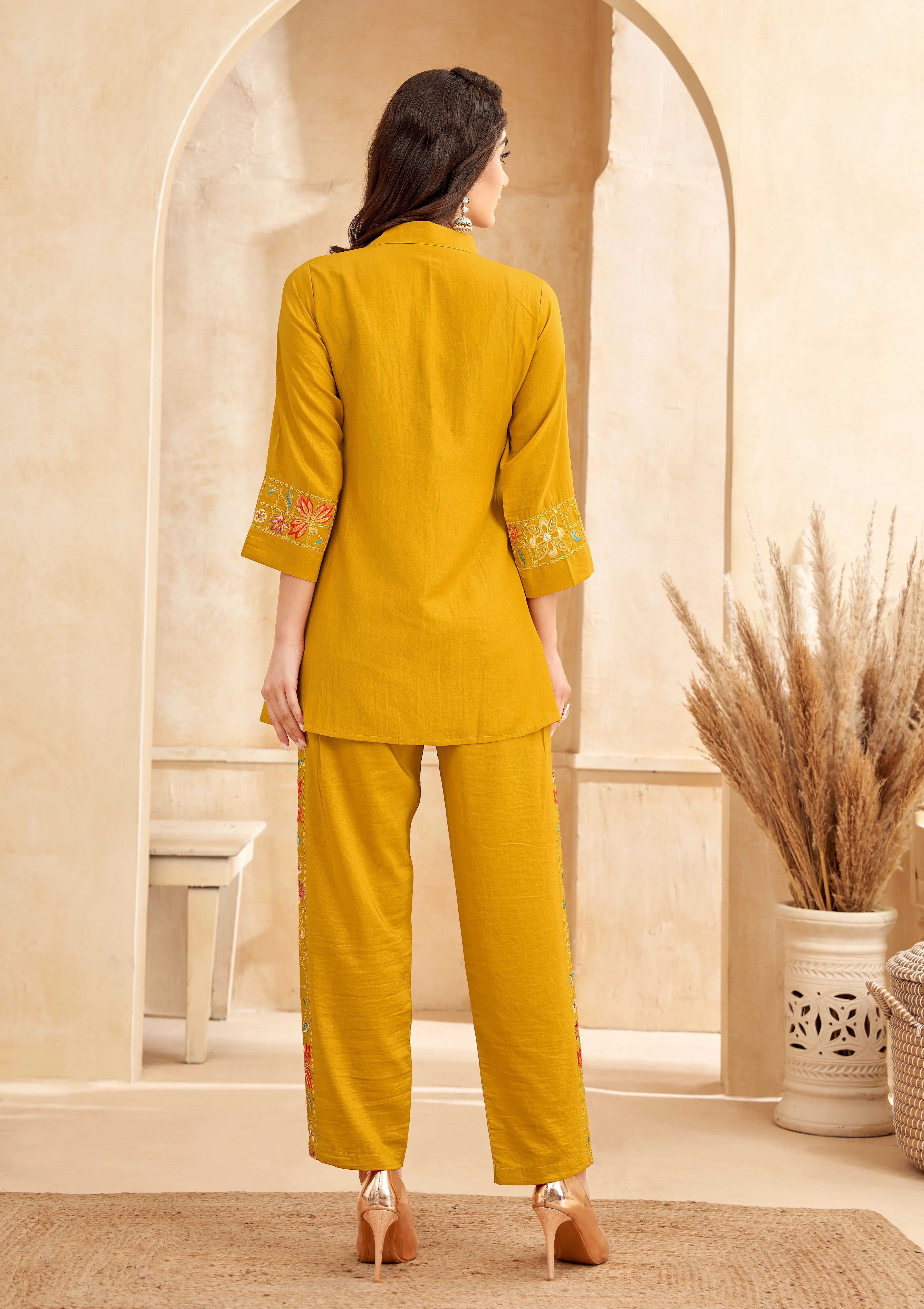 Mustard Roman Silk Floral Embroidered Co-Ord Set