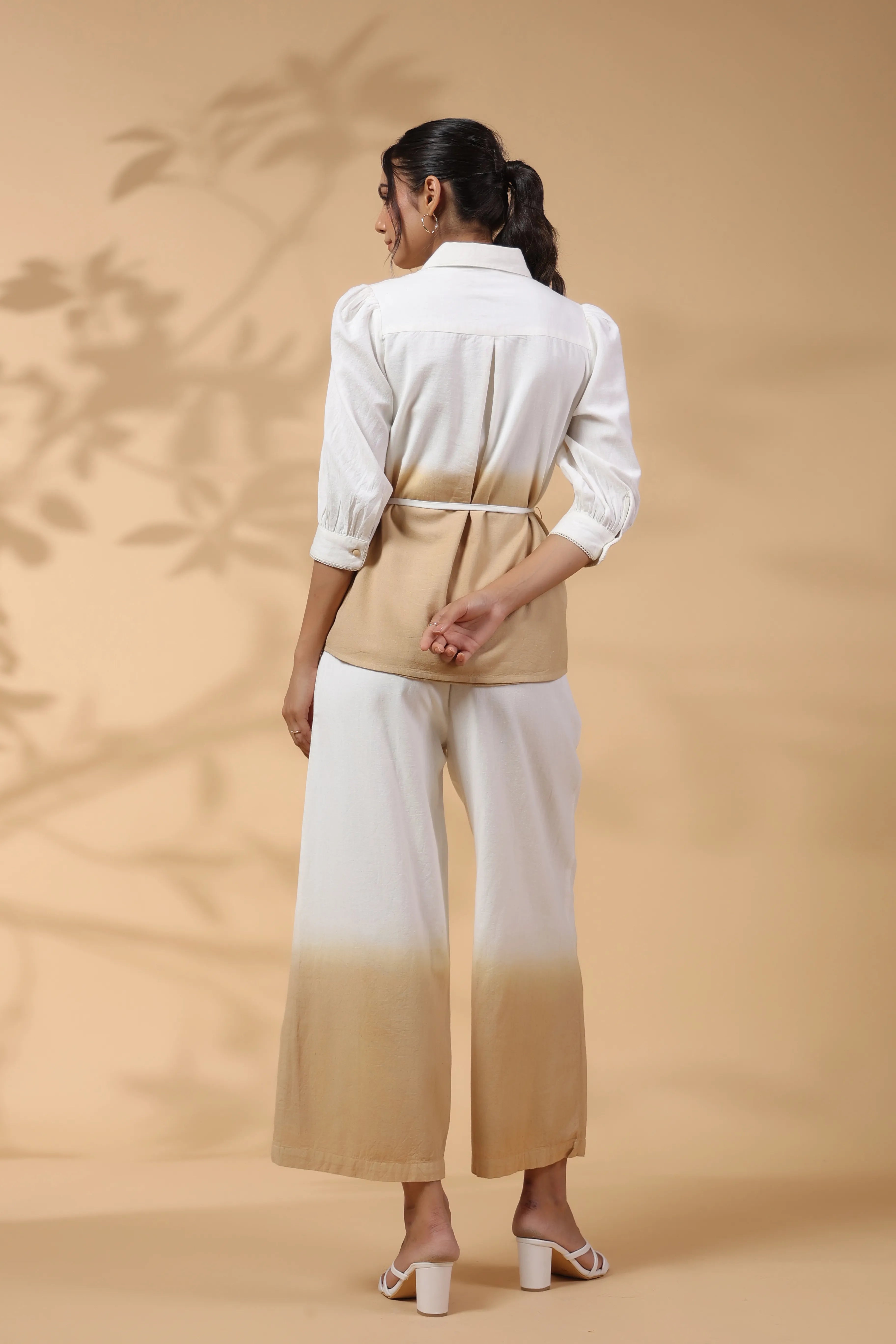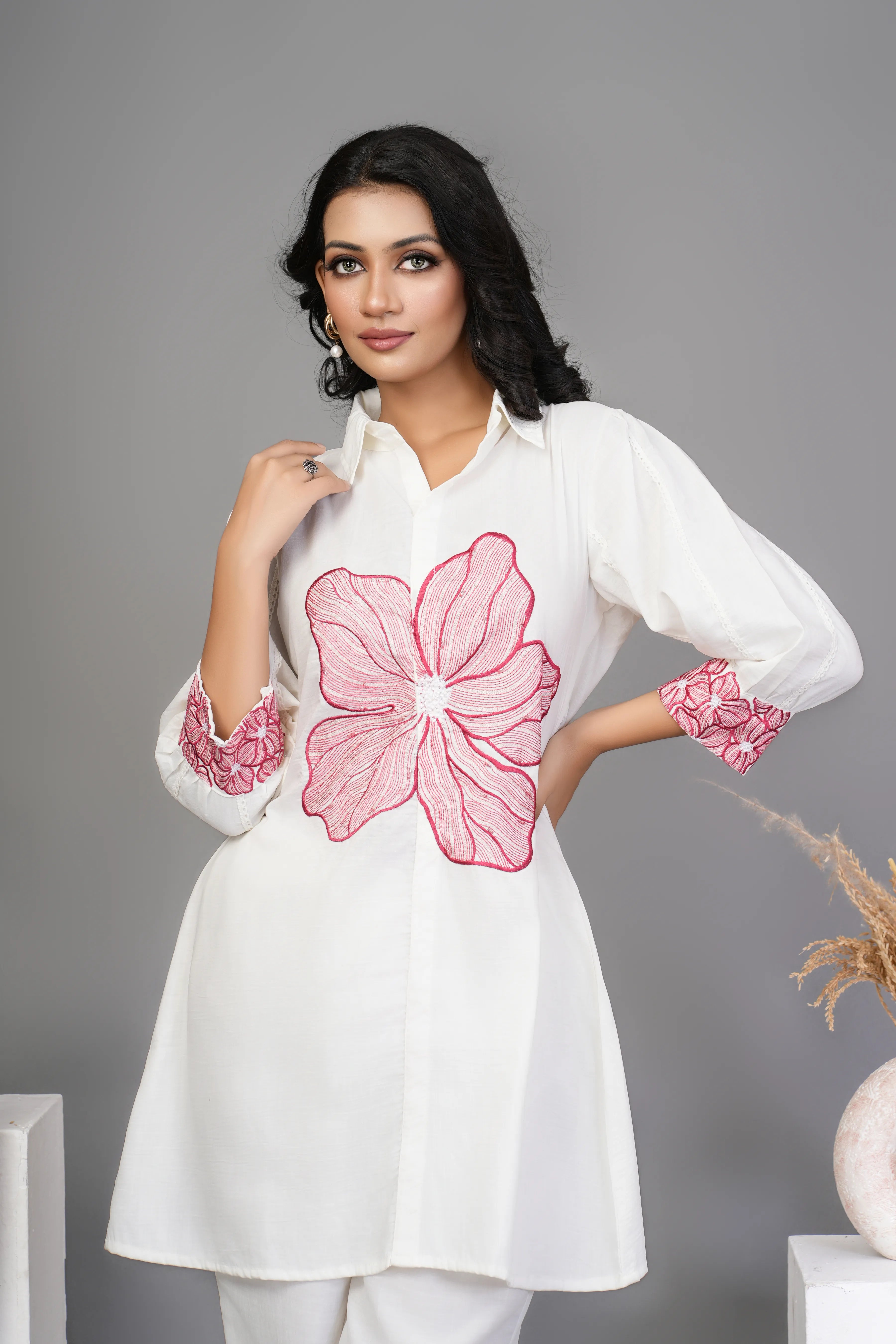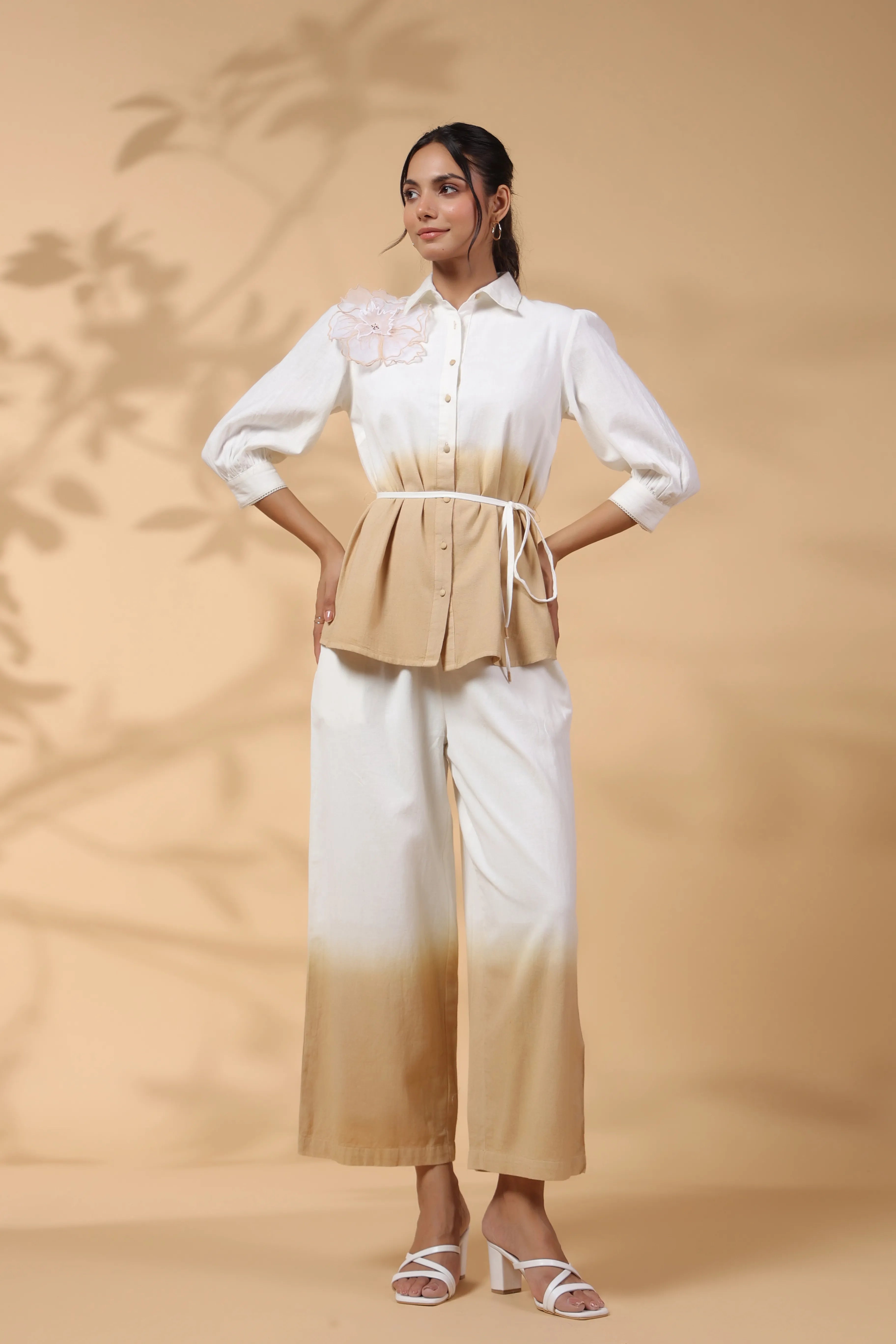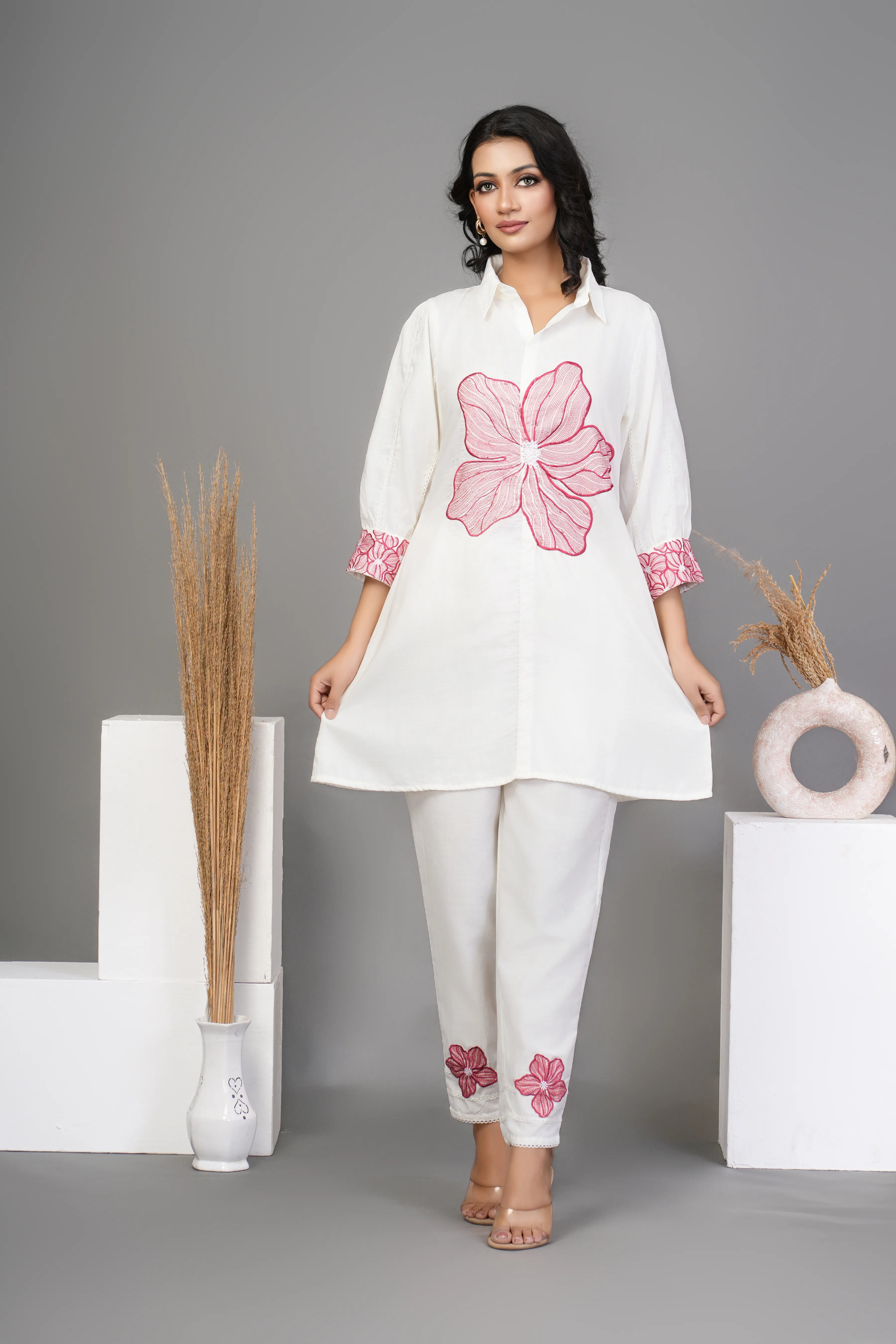 White and Beige Applique Flower Embroidered Cotton Flex Co-ord Set