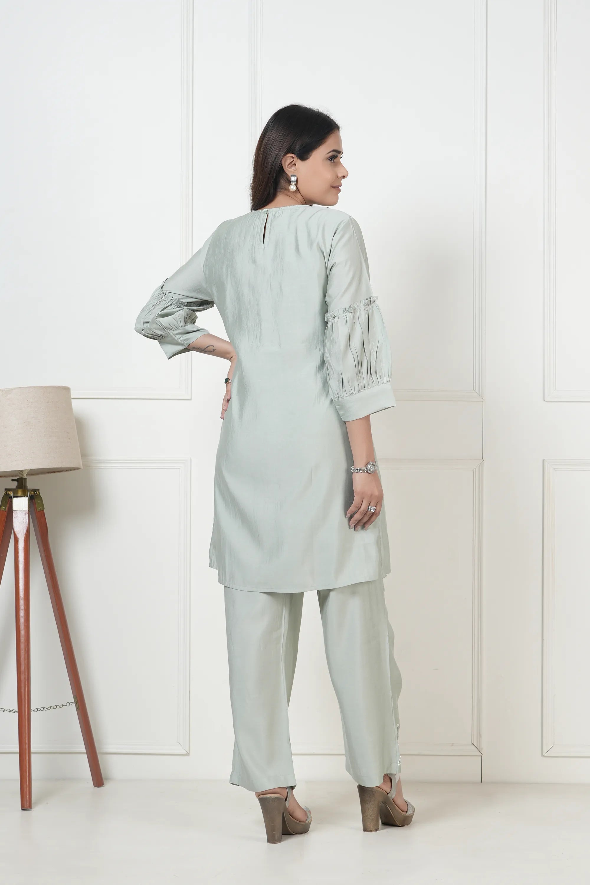 Sage Green Embroidered Thread Work Viscose Tunic With Pant
