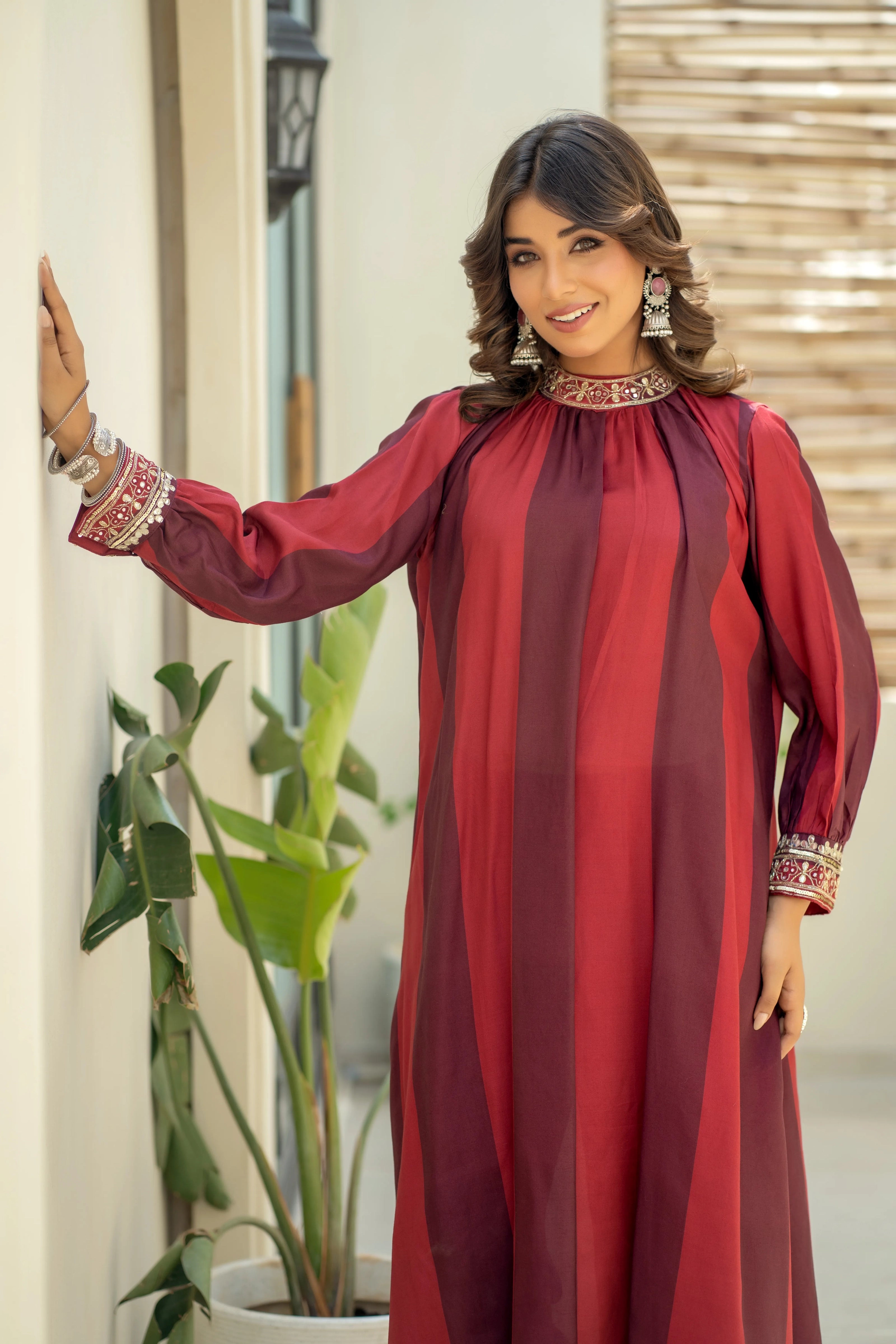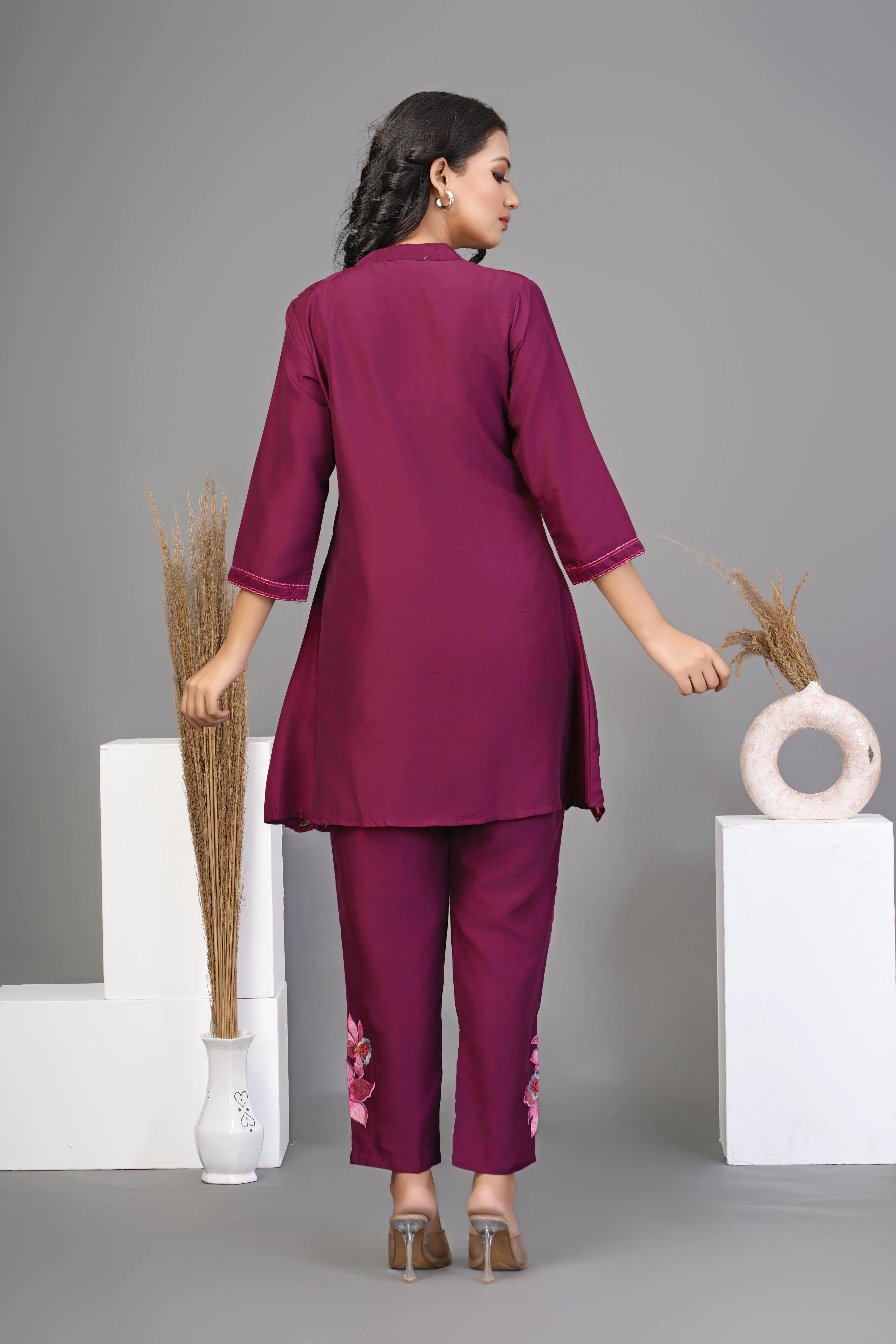 Wine Chinnon Floral Embroidered Co-Ord Set