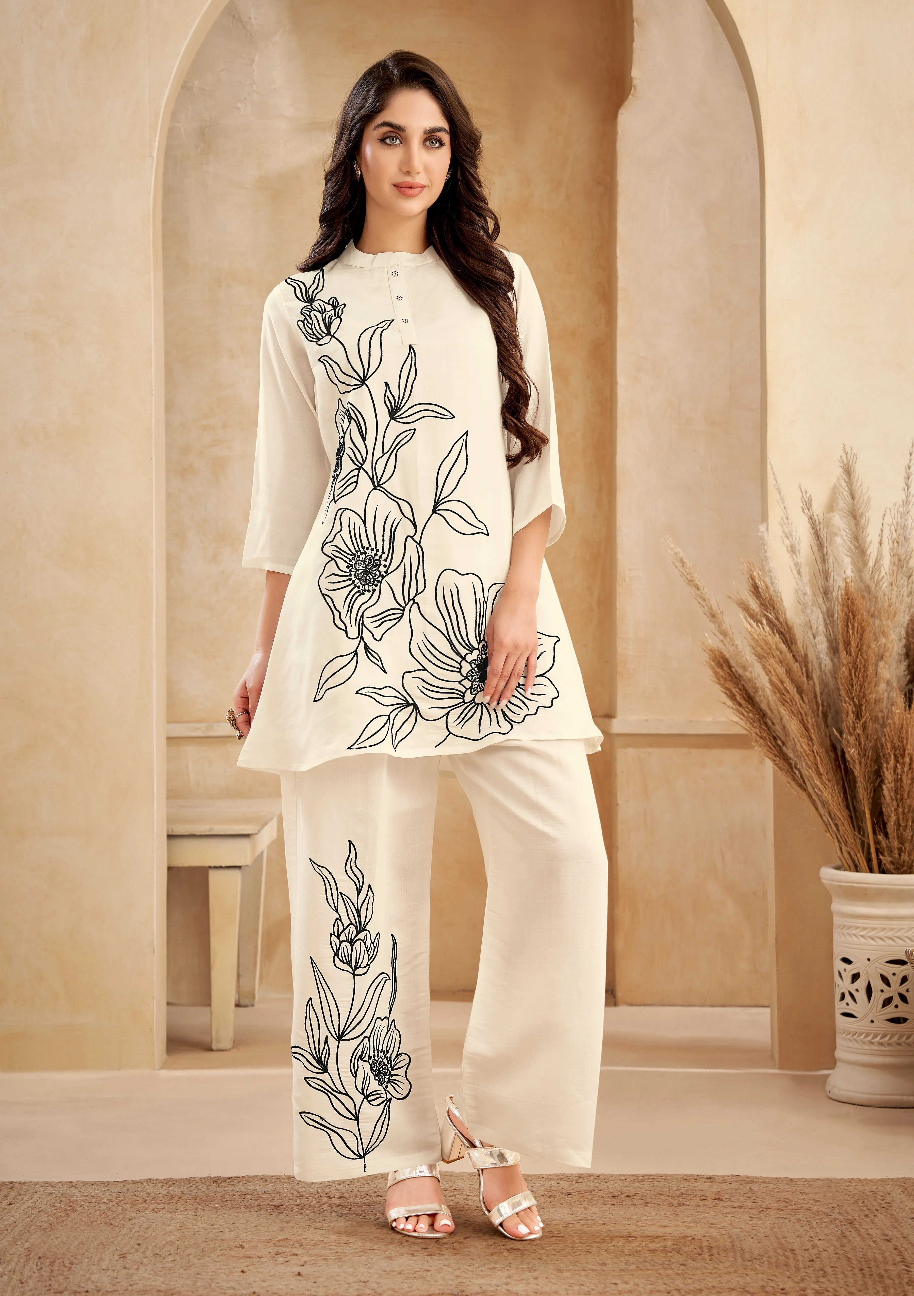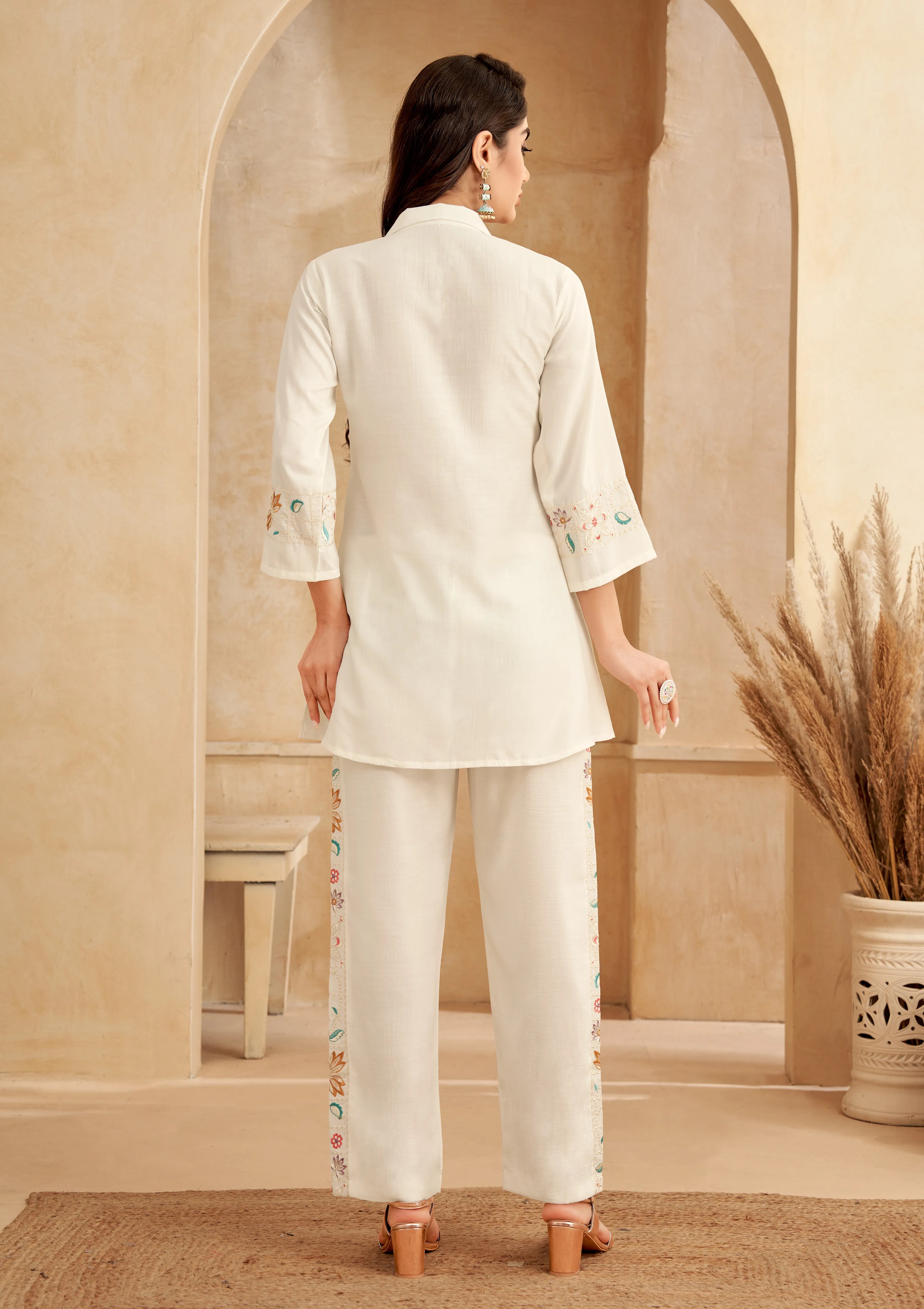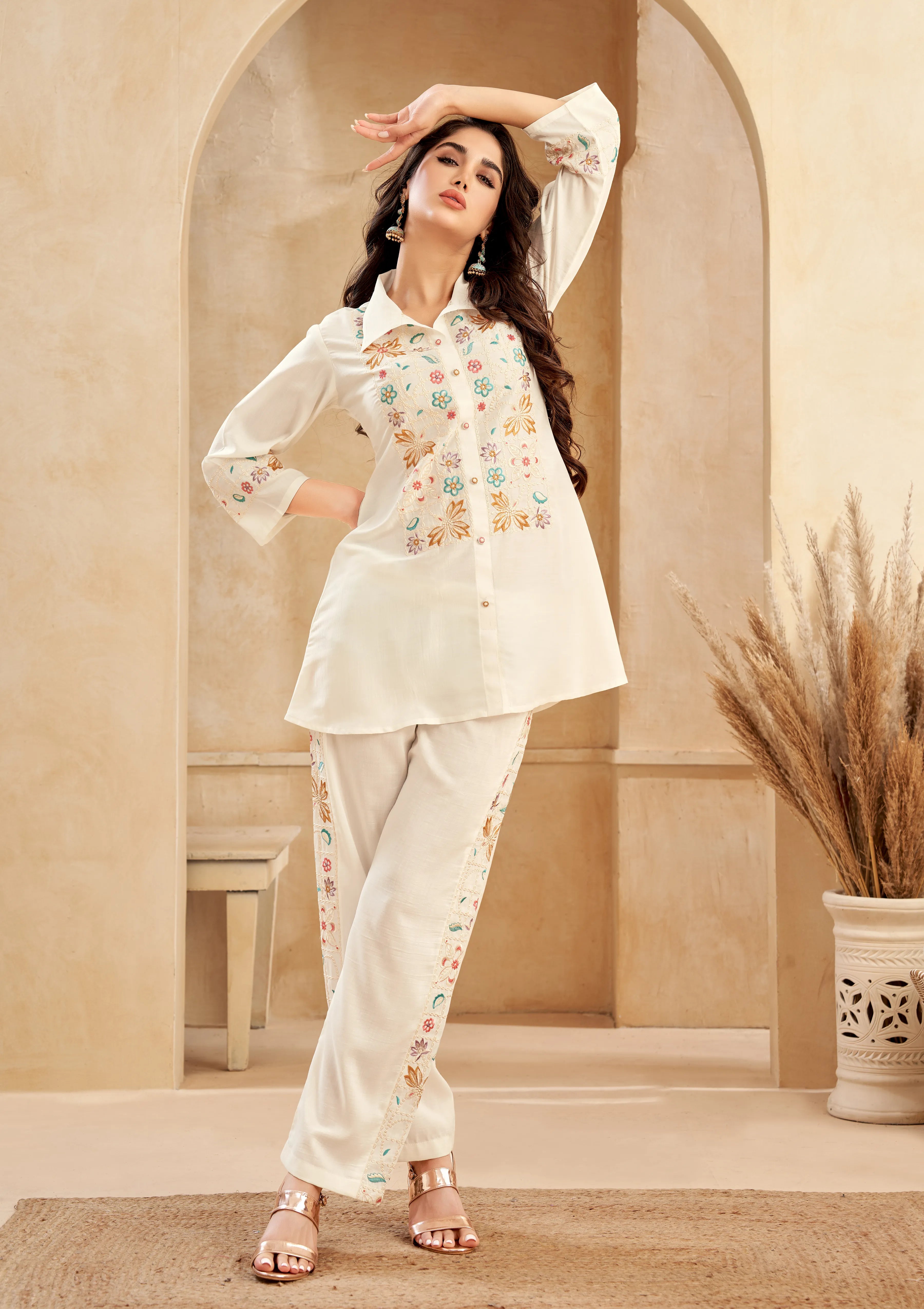 Off White Floral Embroidered Chinon Co-Ord Set