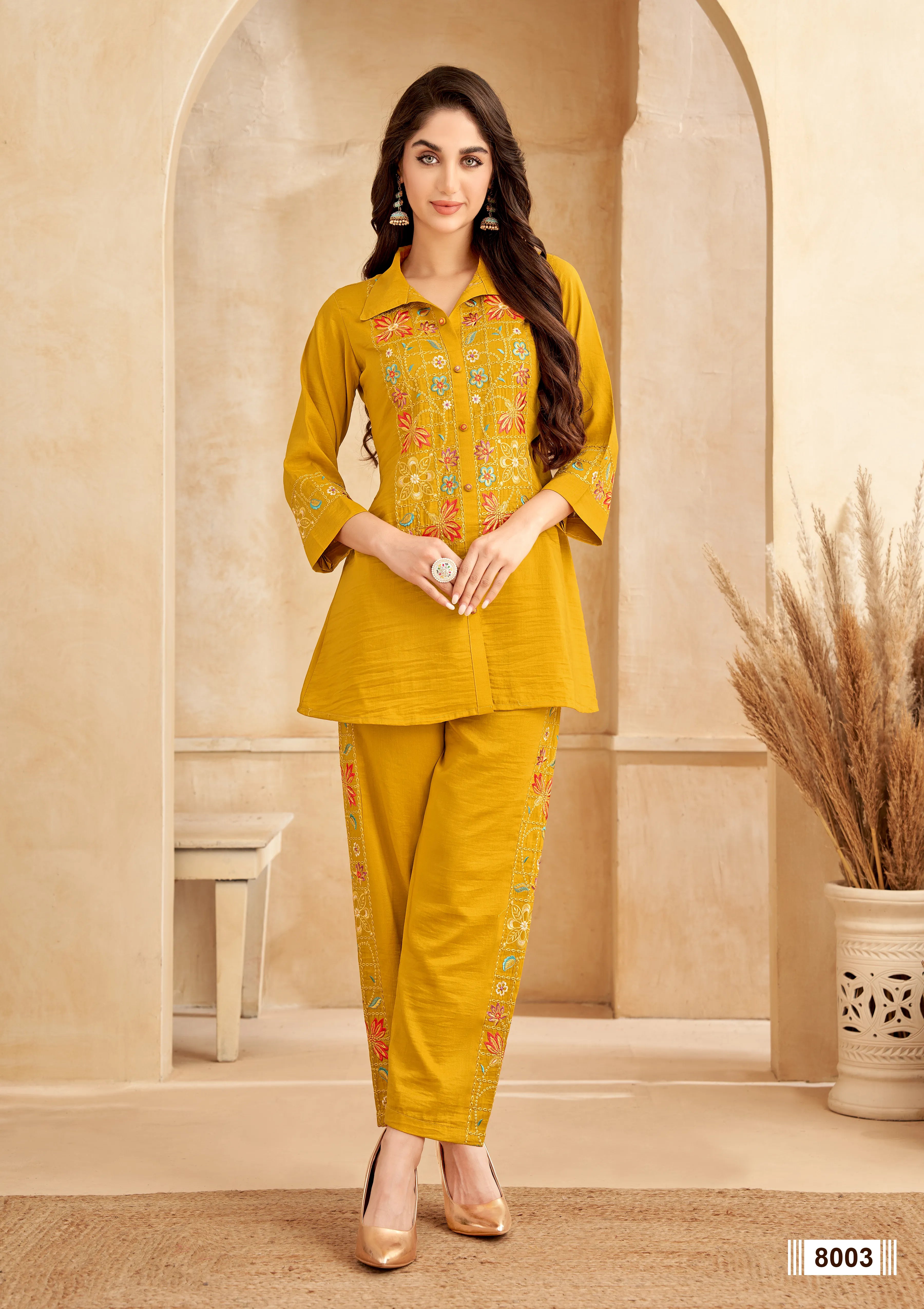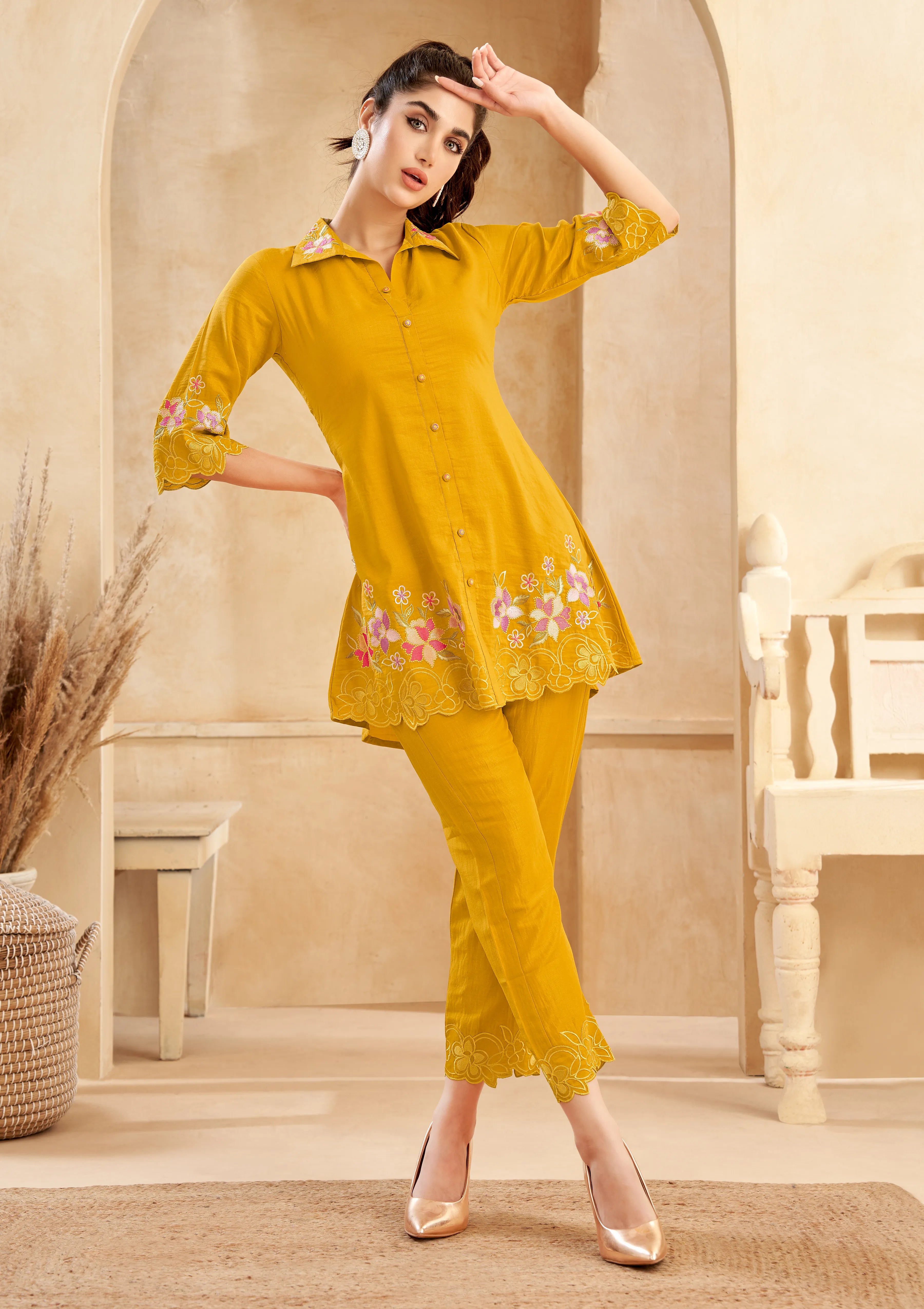 Mustard Chinnon Floral Embroidered Co-Ord Set