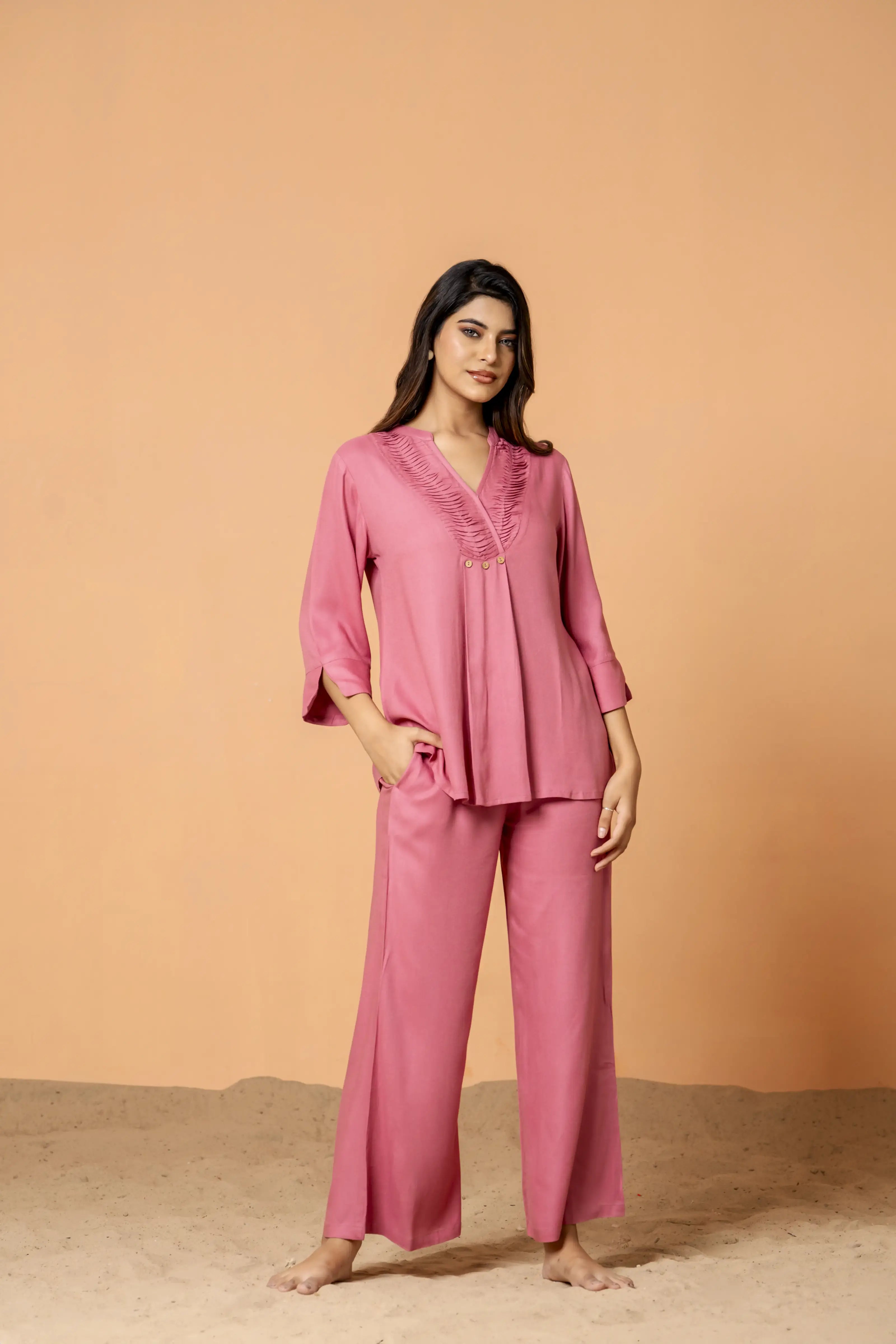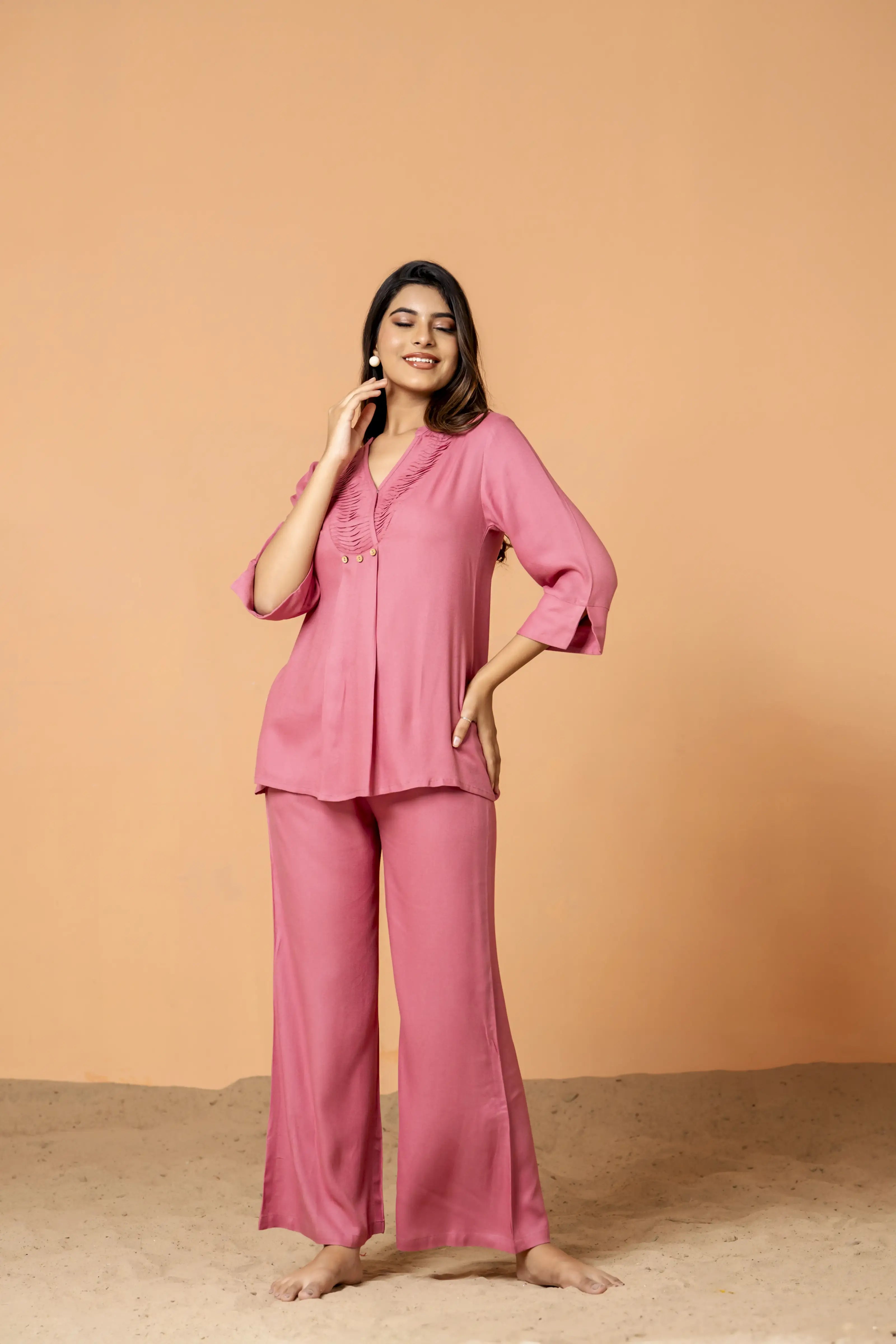 Pink Color Pleated Front Rayon Co-Ord Set