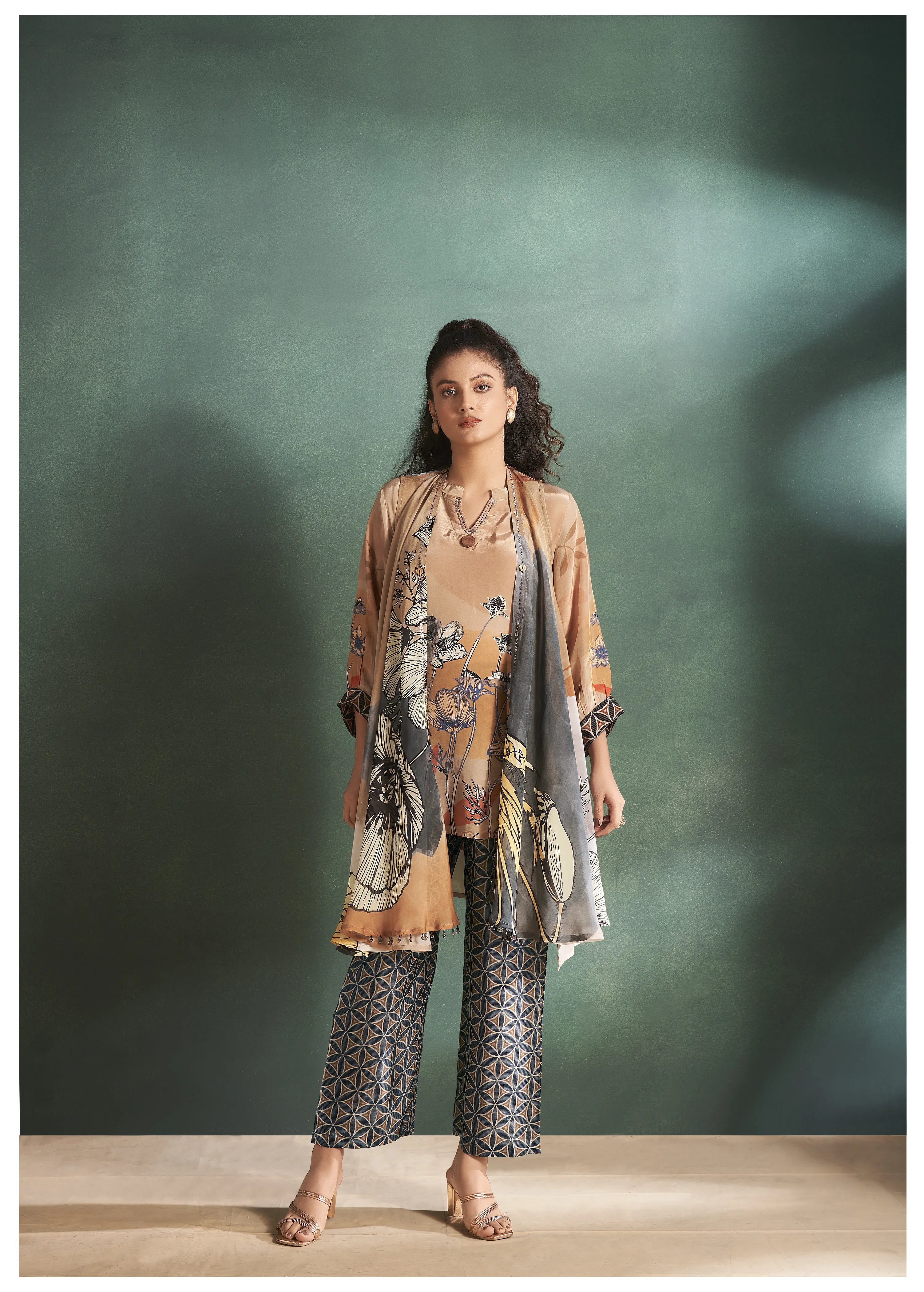 Ochre Floral Muslin Diamond Detailed Shrug 3-Piece Set