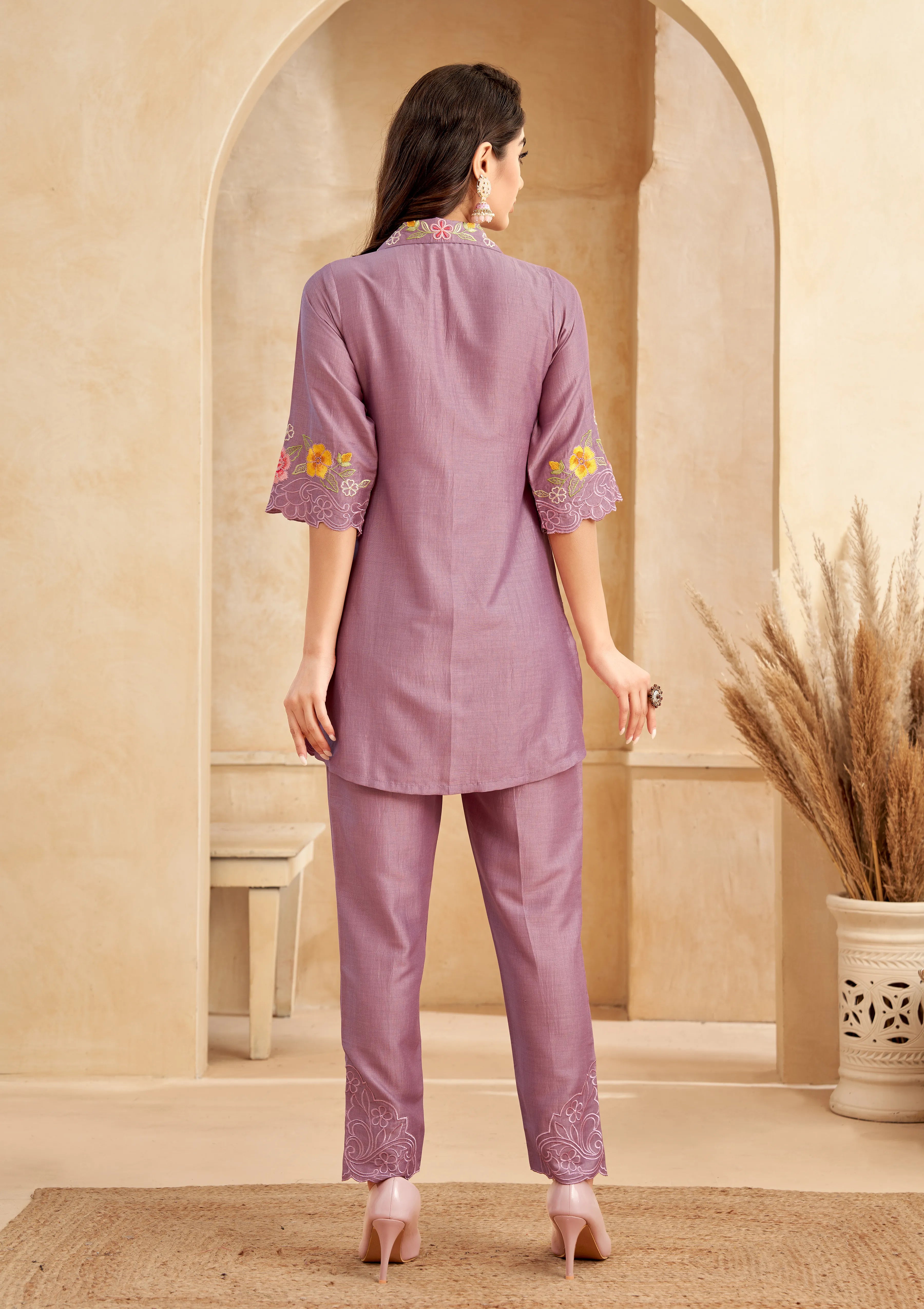 Purple Roman Silk Floral Embroidered Co-Ord Set