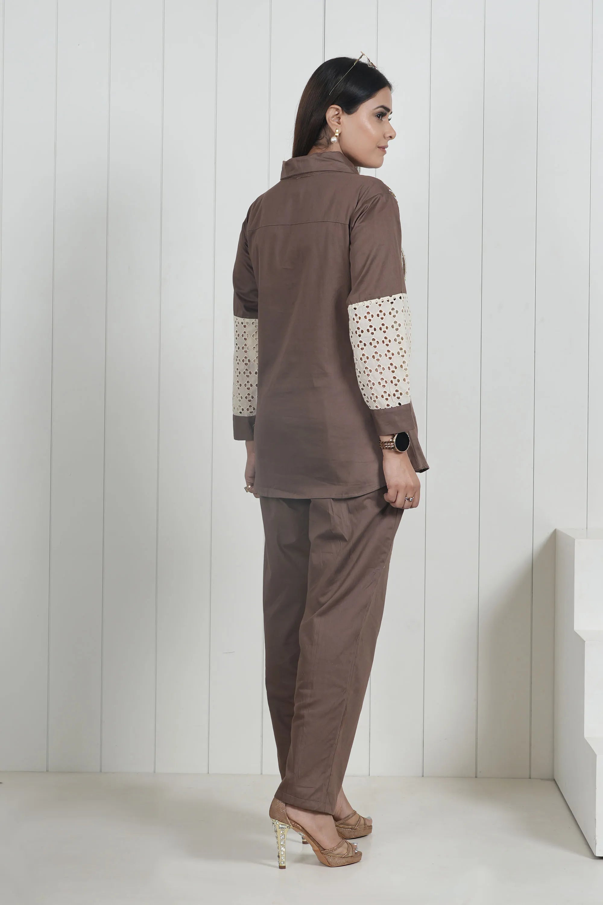 Elegant Brown Cotton Satin Embroidery And Schiffli Detail Tunic Set