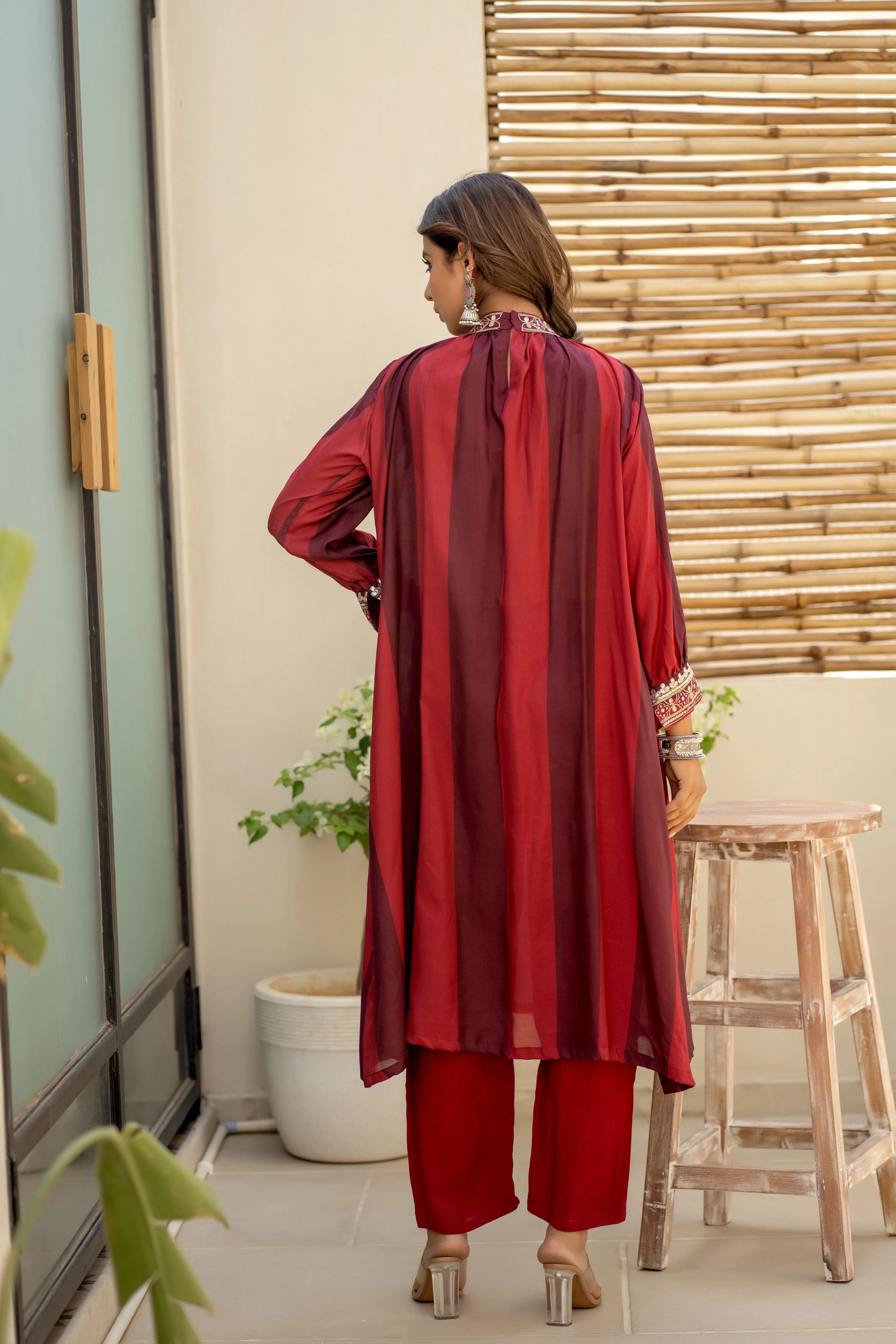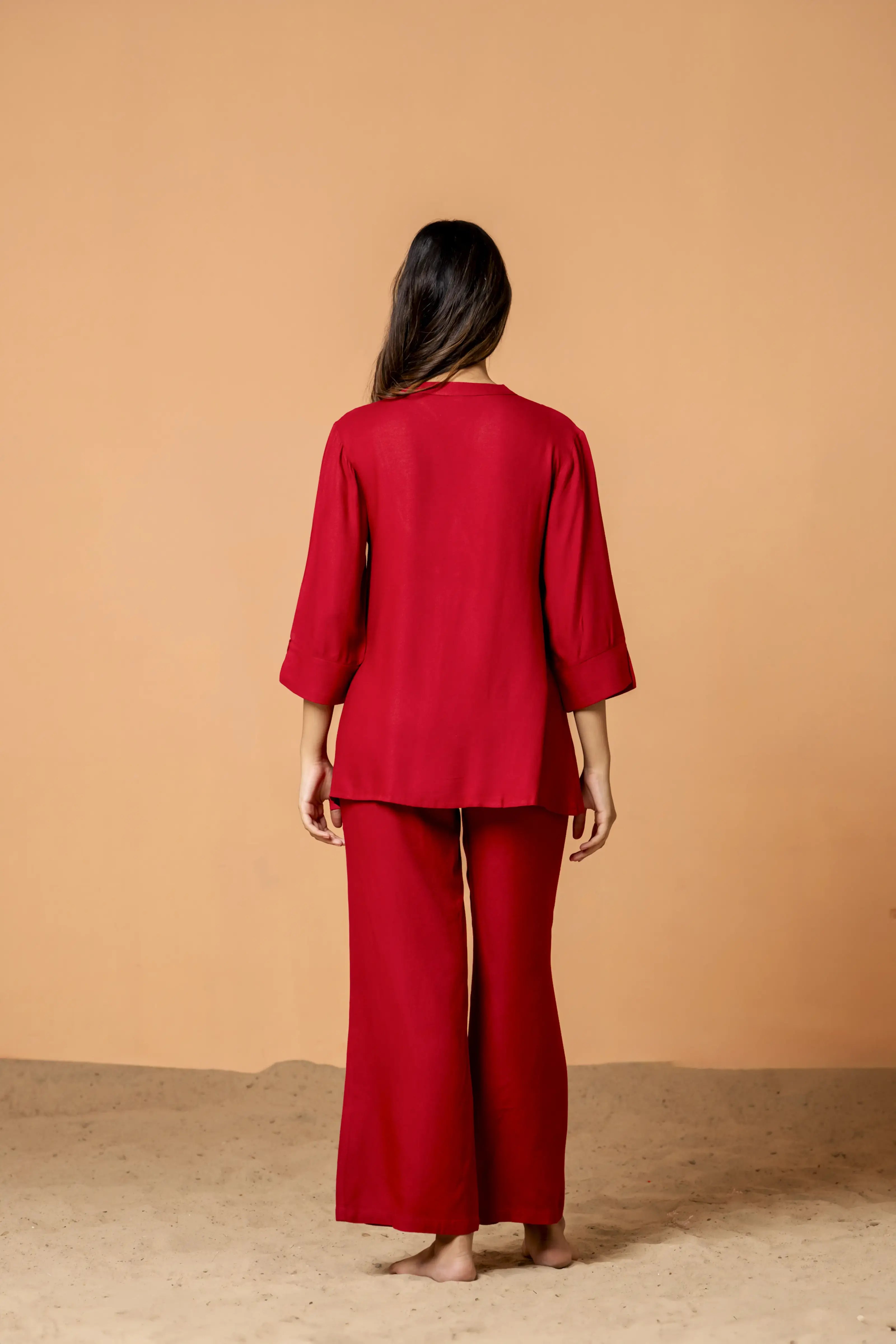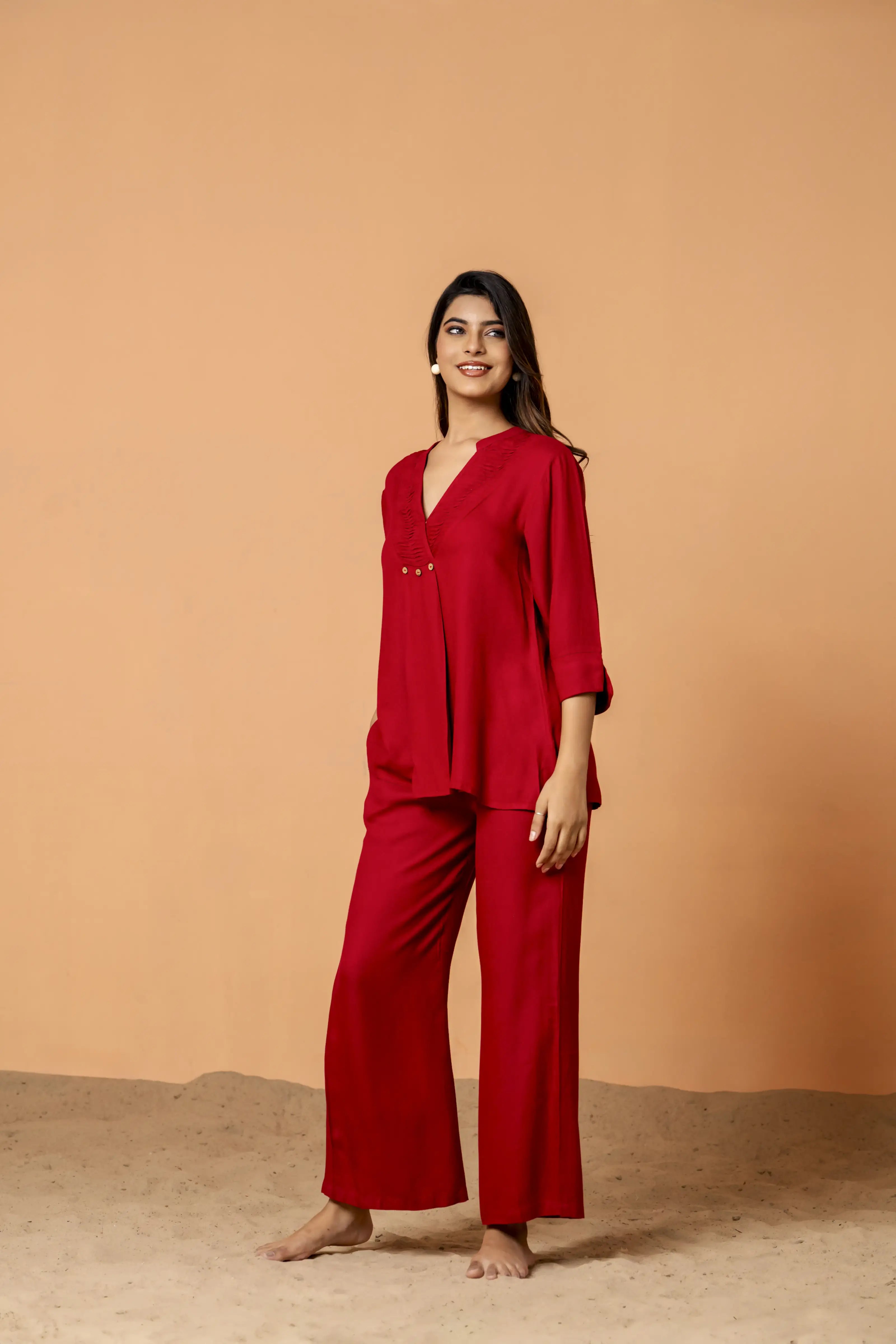 Red Color Pleated Front Rayon Co-Ord Set