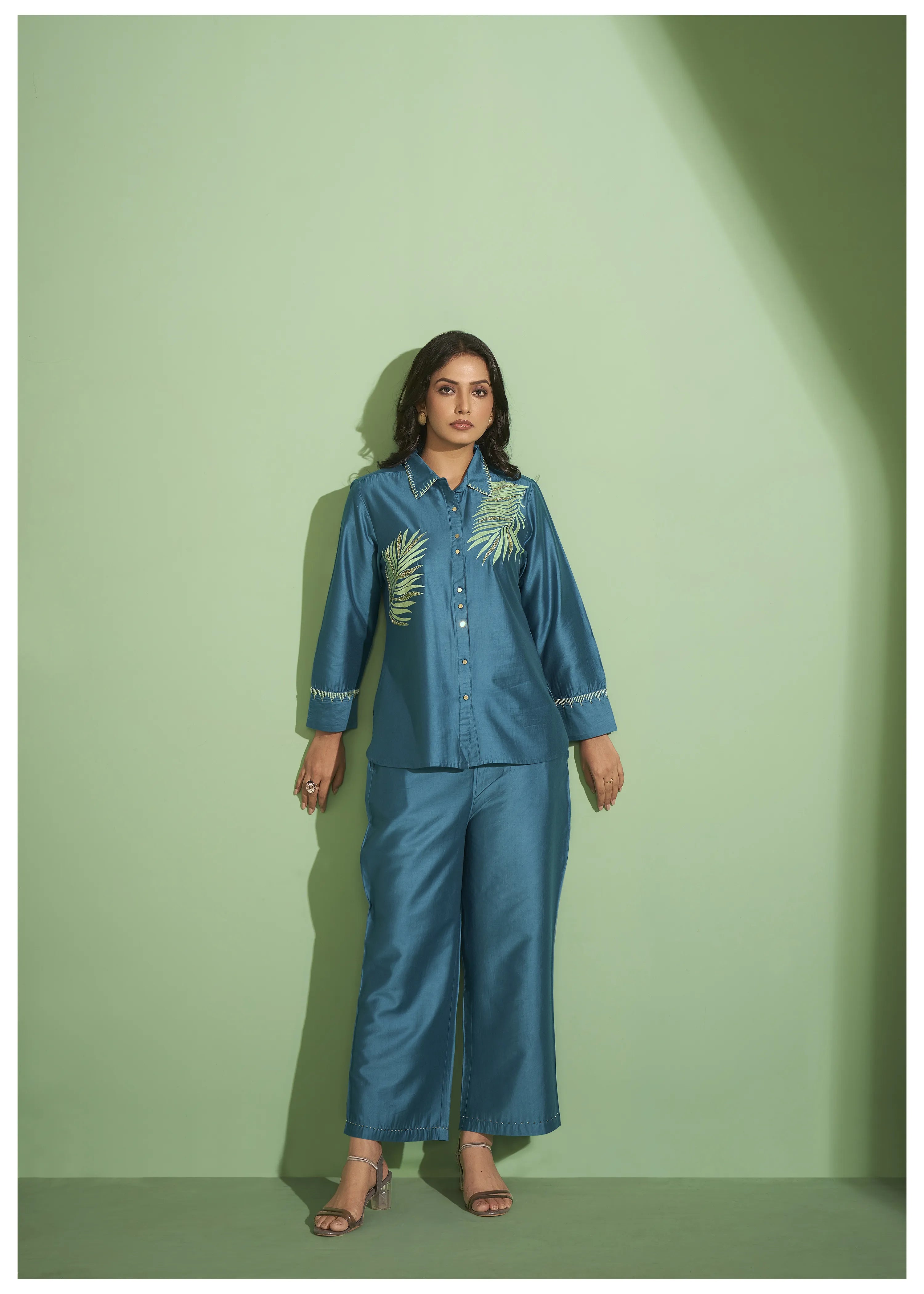 Teal Blue Palm Leaf Embroidered Cotton-Modal Co-Set