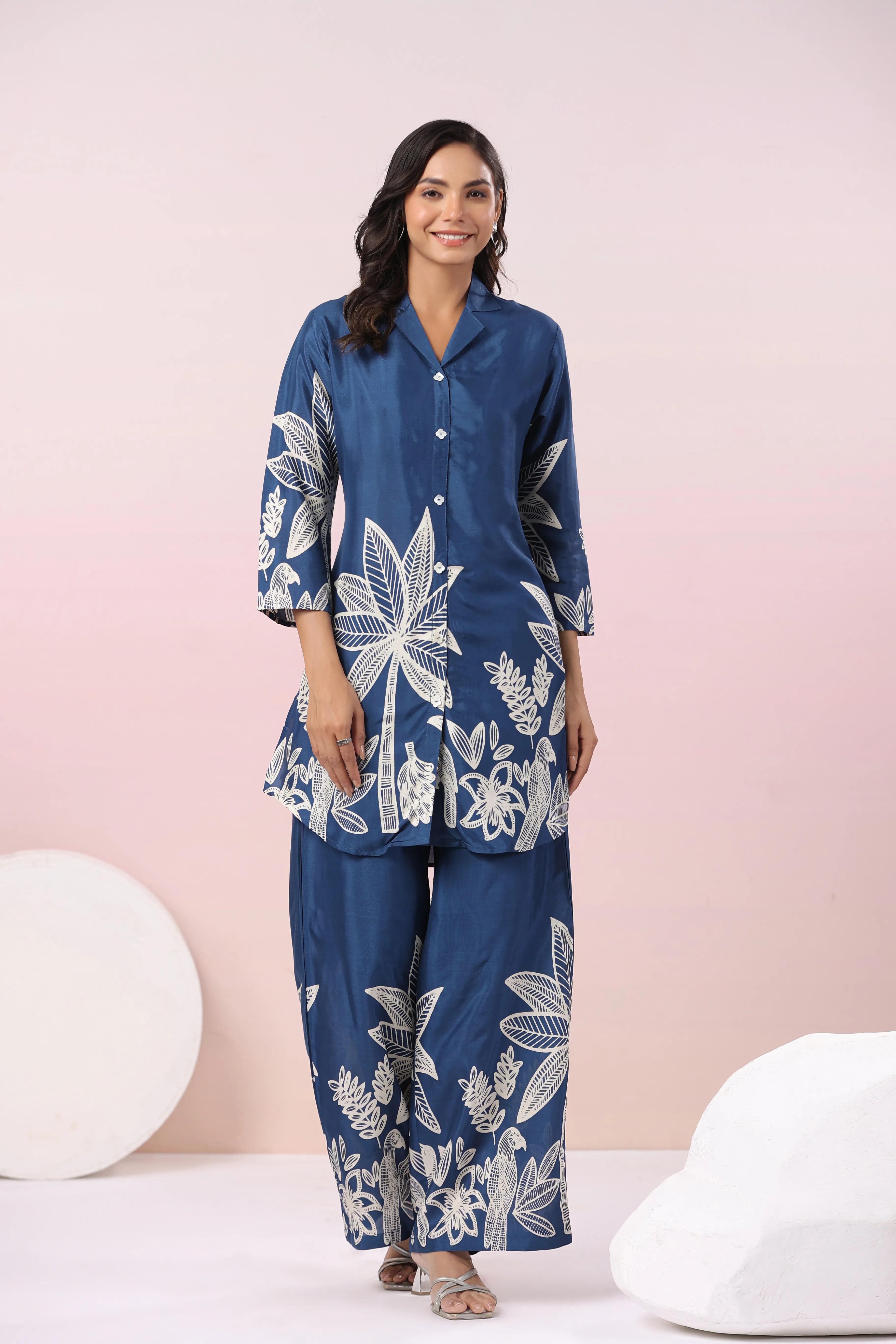 Blue Bold Palm Russian Silk Print Co-Ord Set